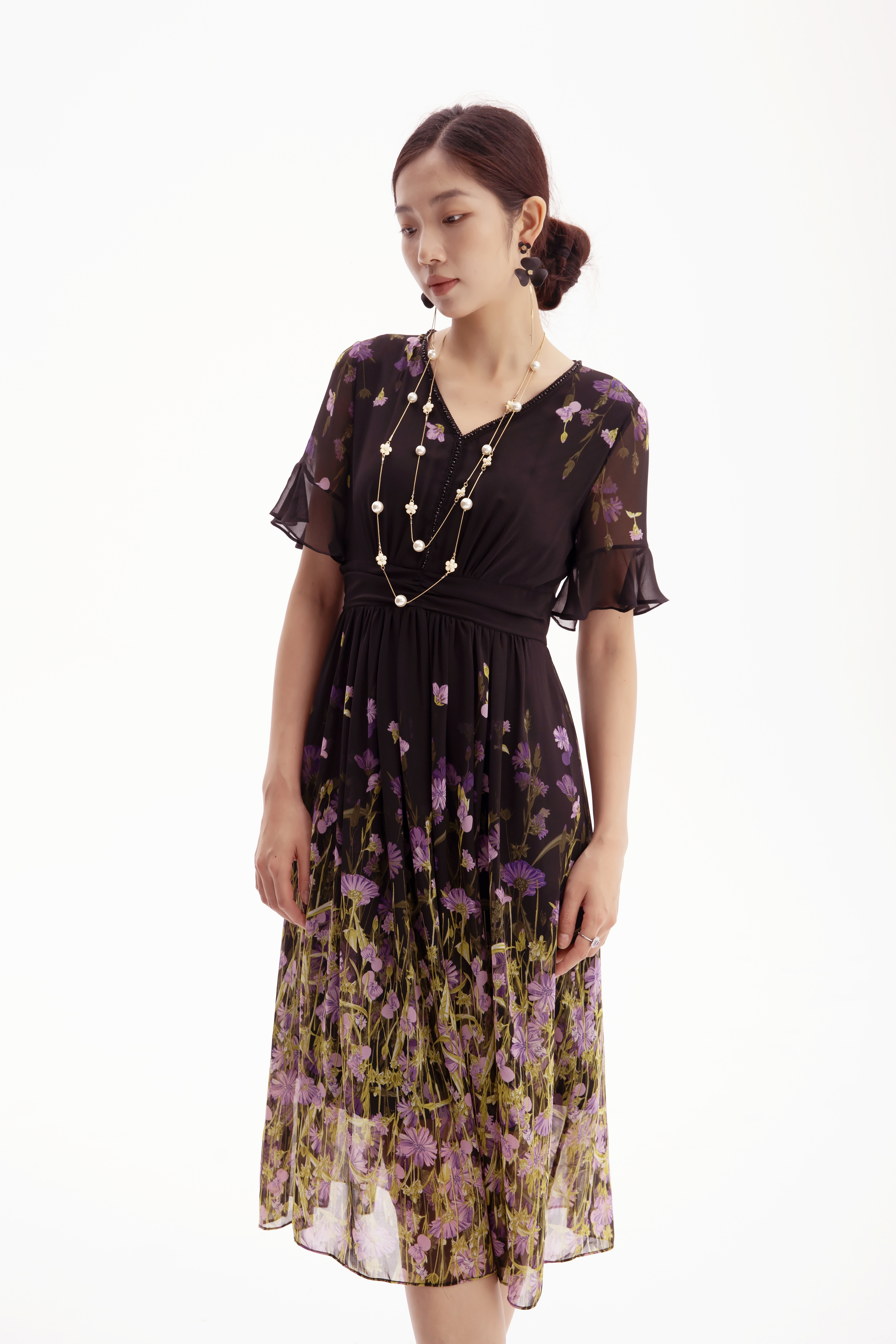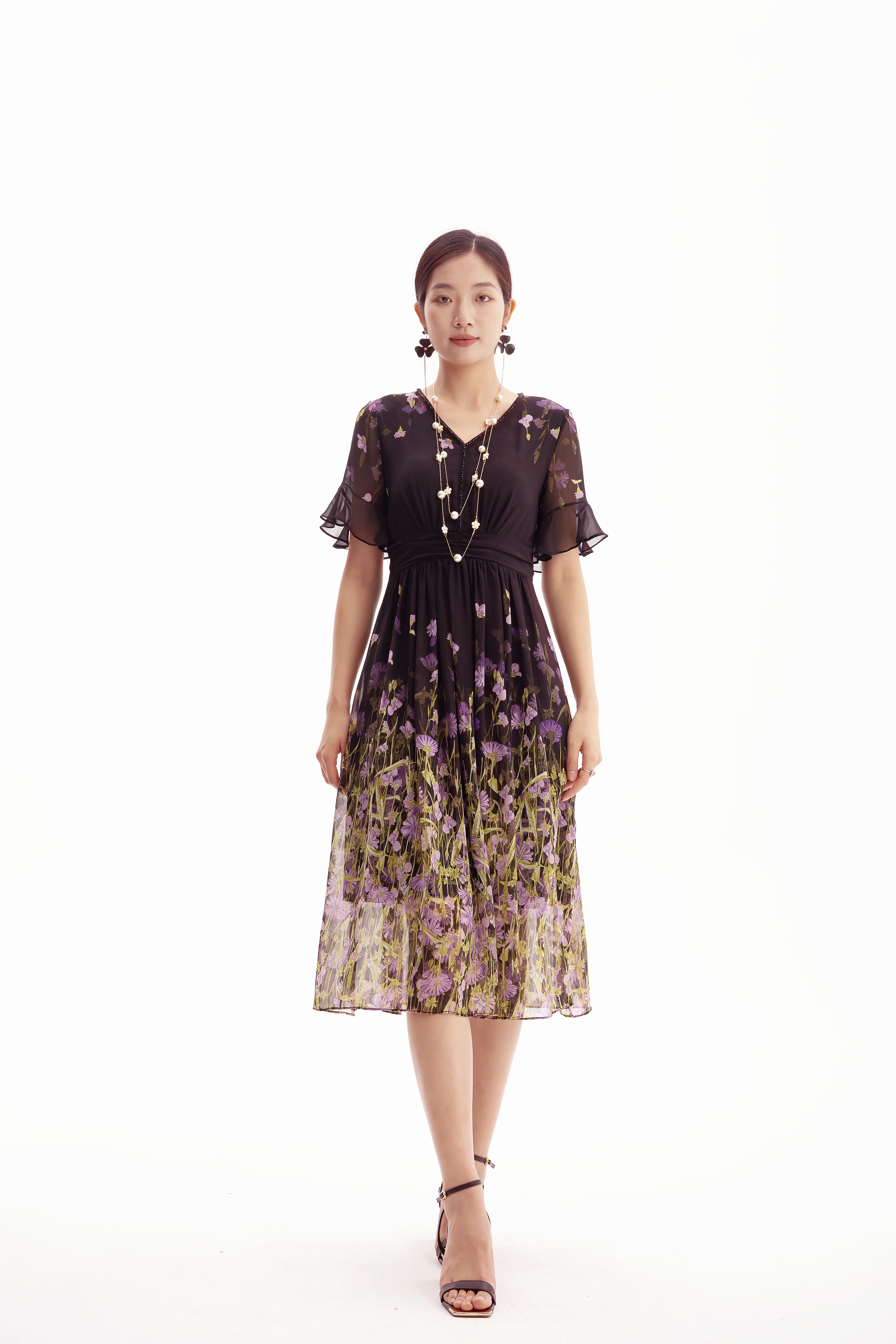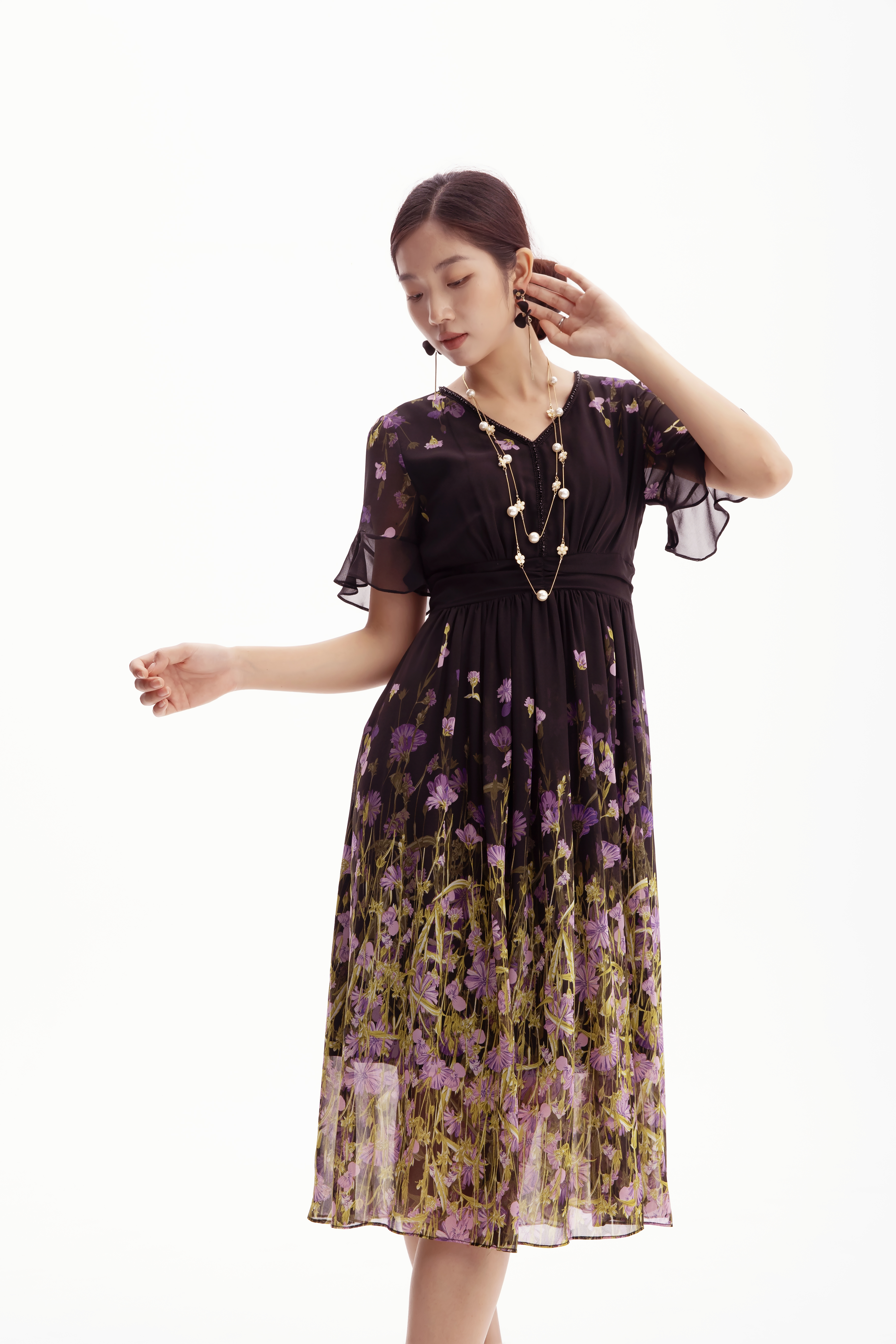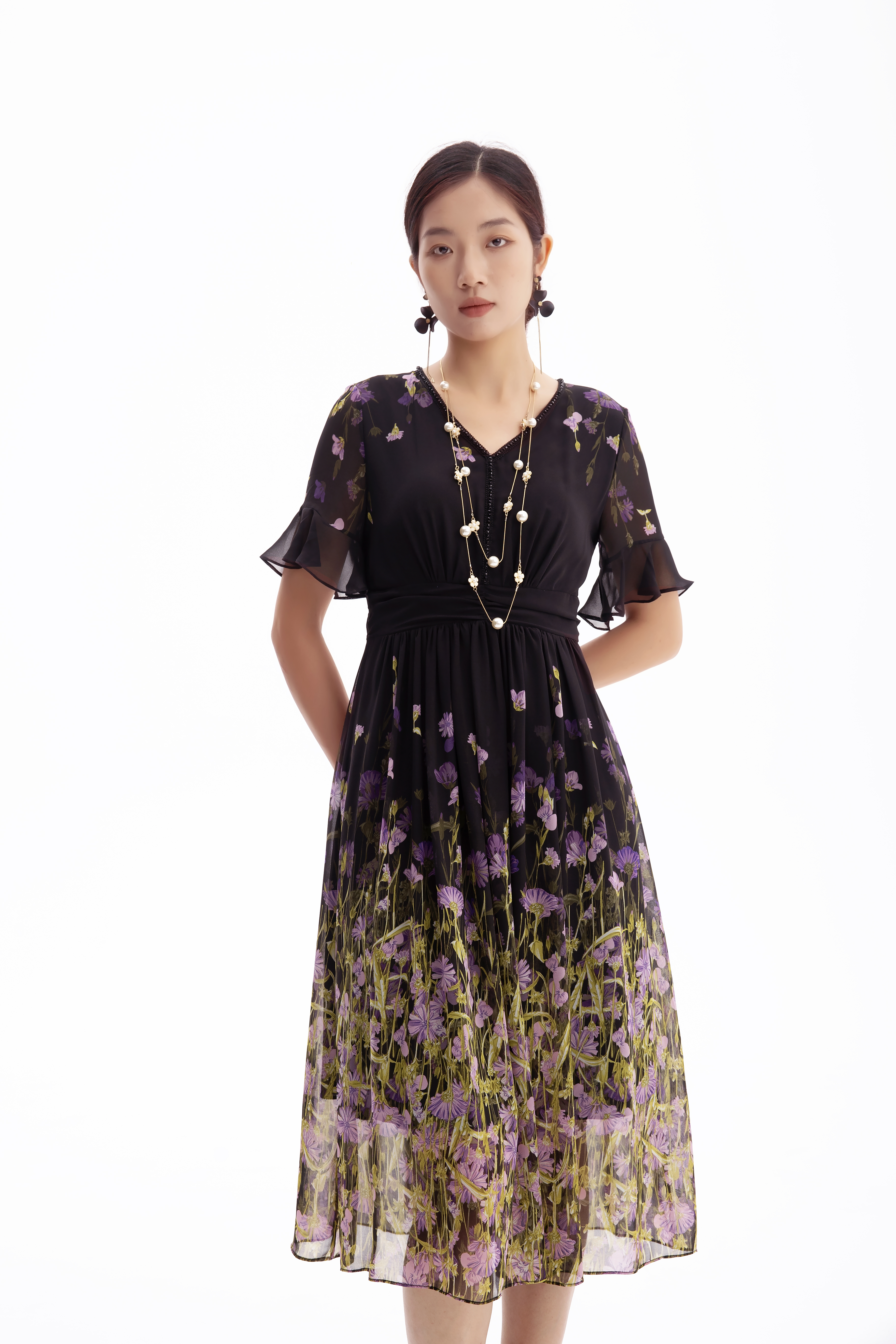 HJ2S53_紫薄汗色_连衣裙_夏季_精致钉珠 V 领荷叶袖网纱收腰显瘦气质中裙_高级女装_BERNIEELEN 伯妮斯茵