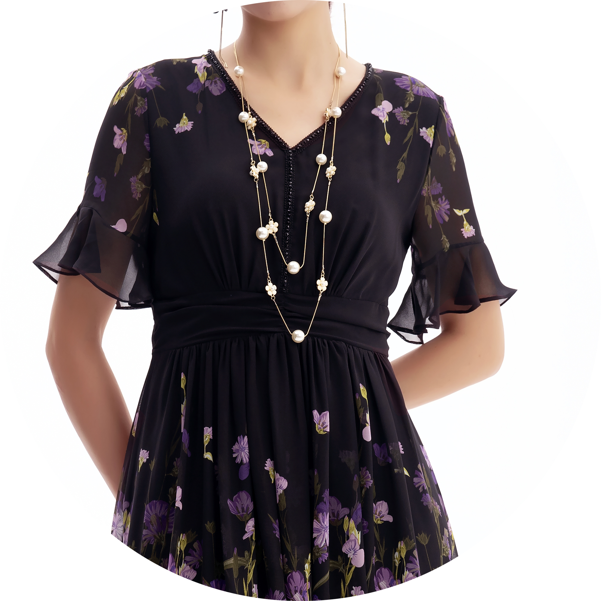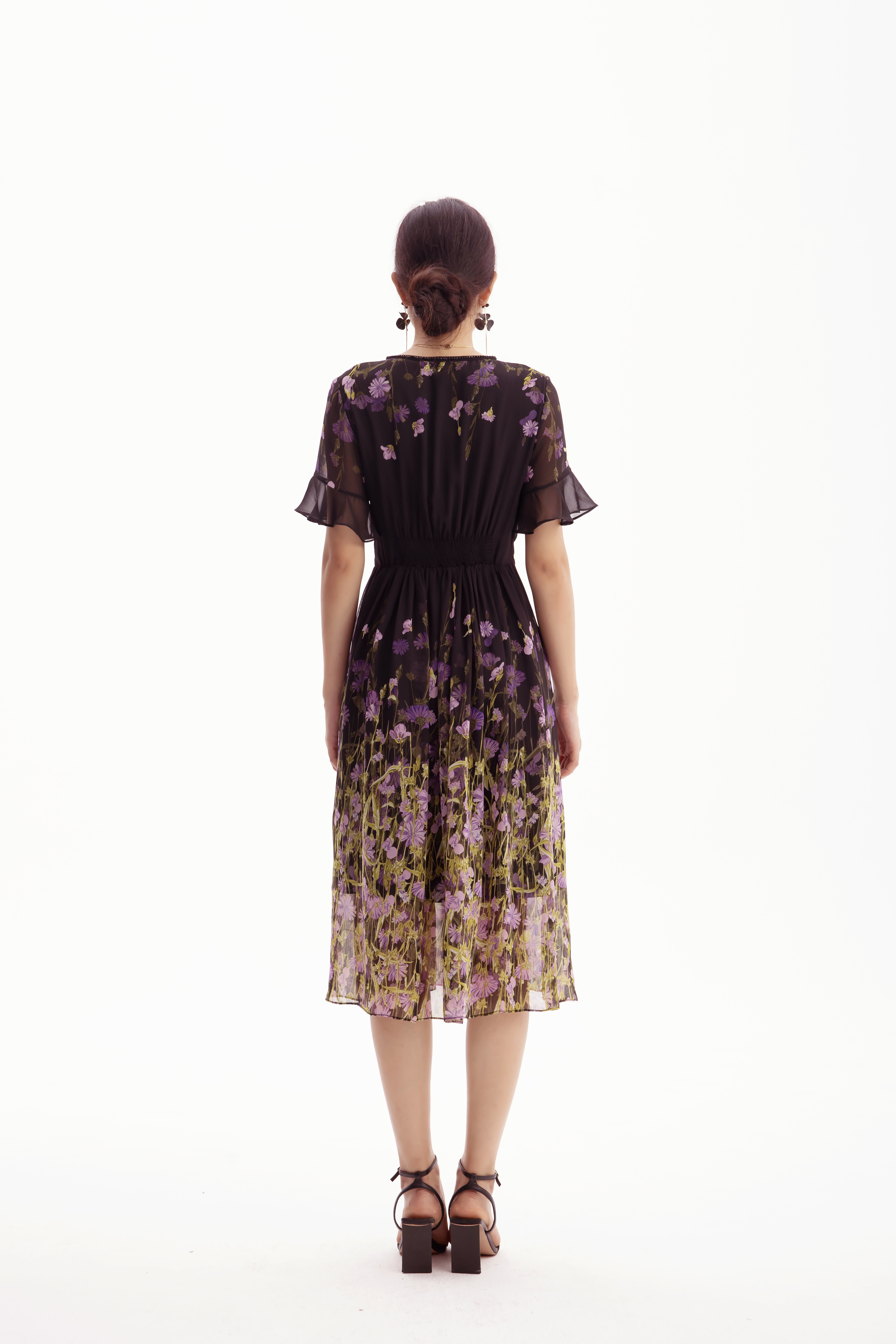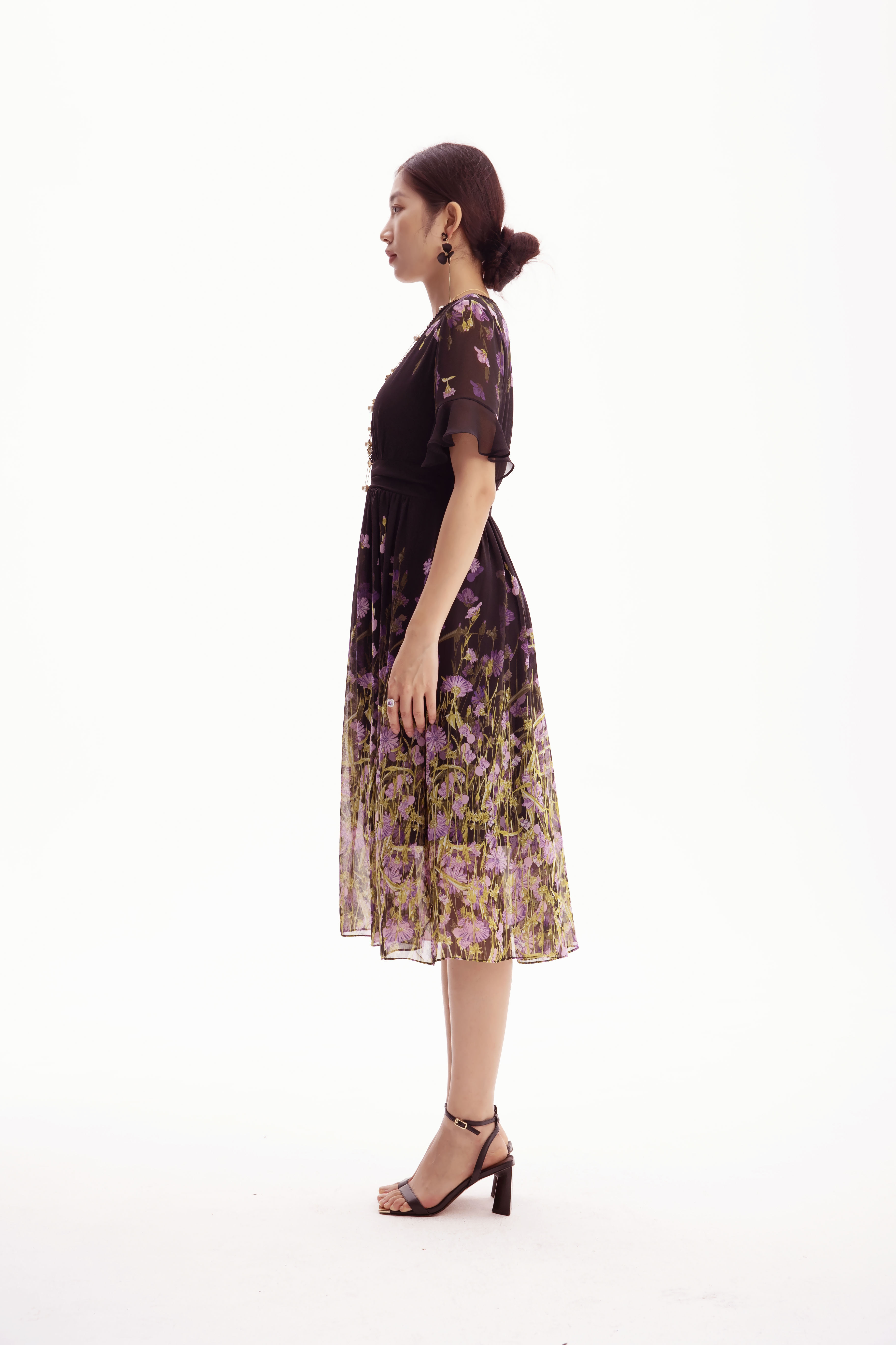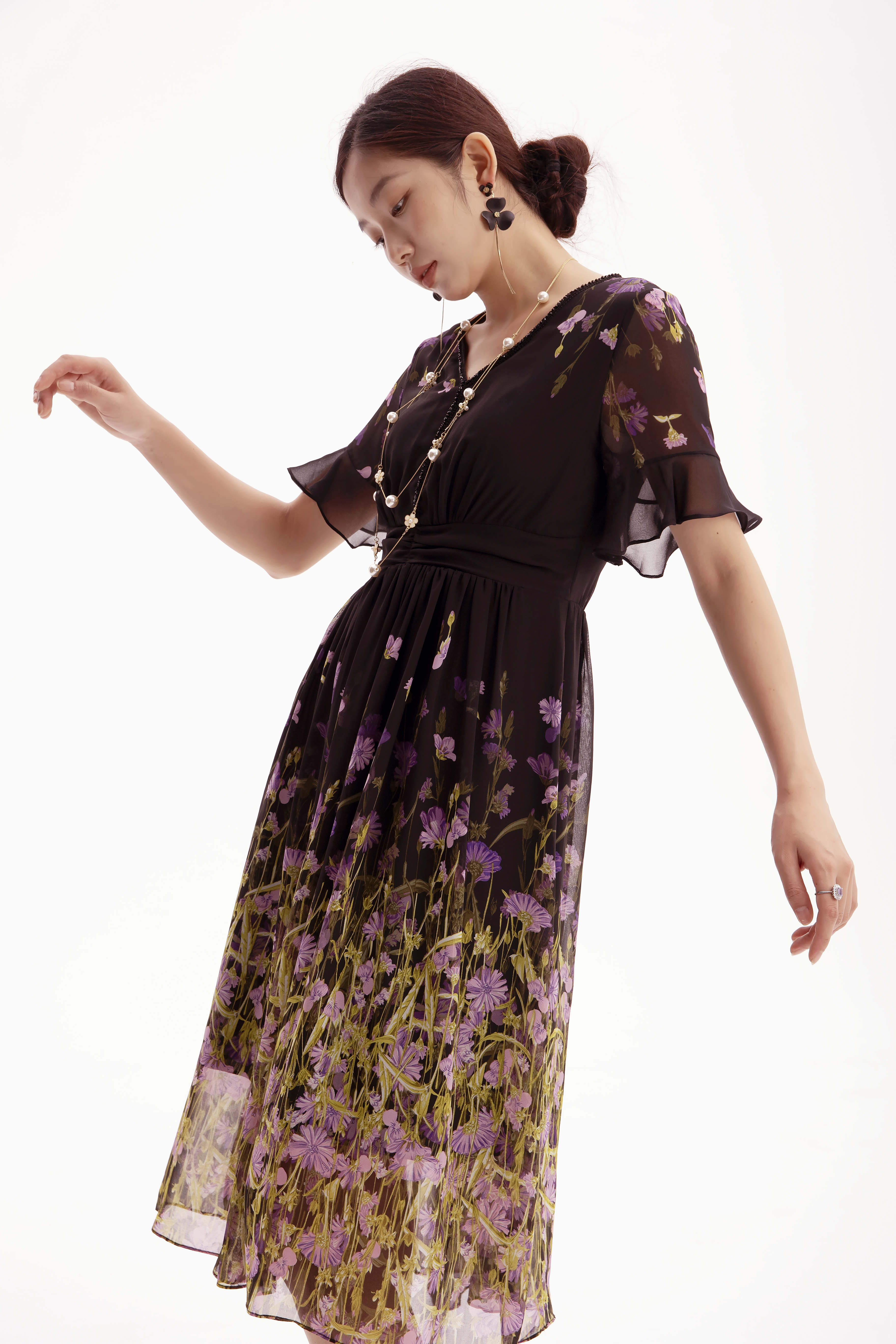 HJ2S53_紫薄汗色_连衣裙_夏季_精致钉珠 V 领荷叶袖网纱收腰显瘦气质中裙_高级女装_BERNIEELEN 伯妮斯茵