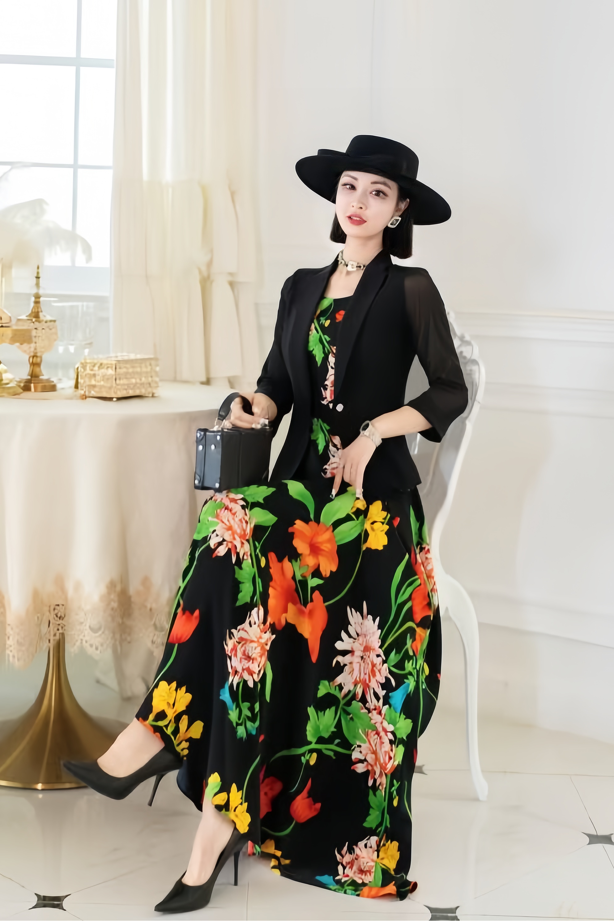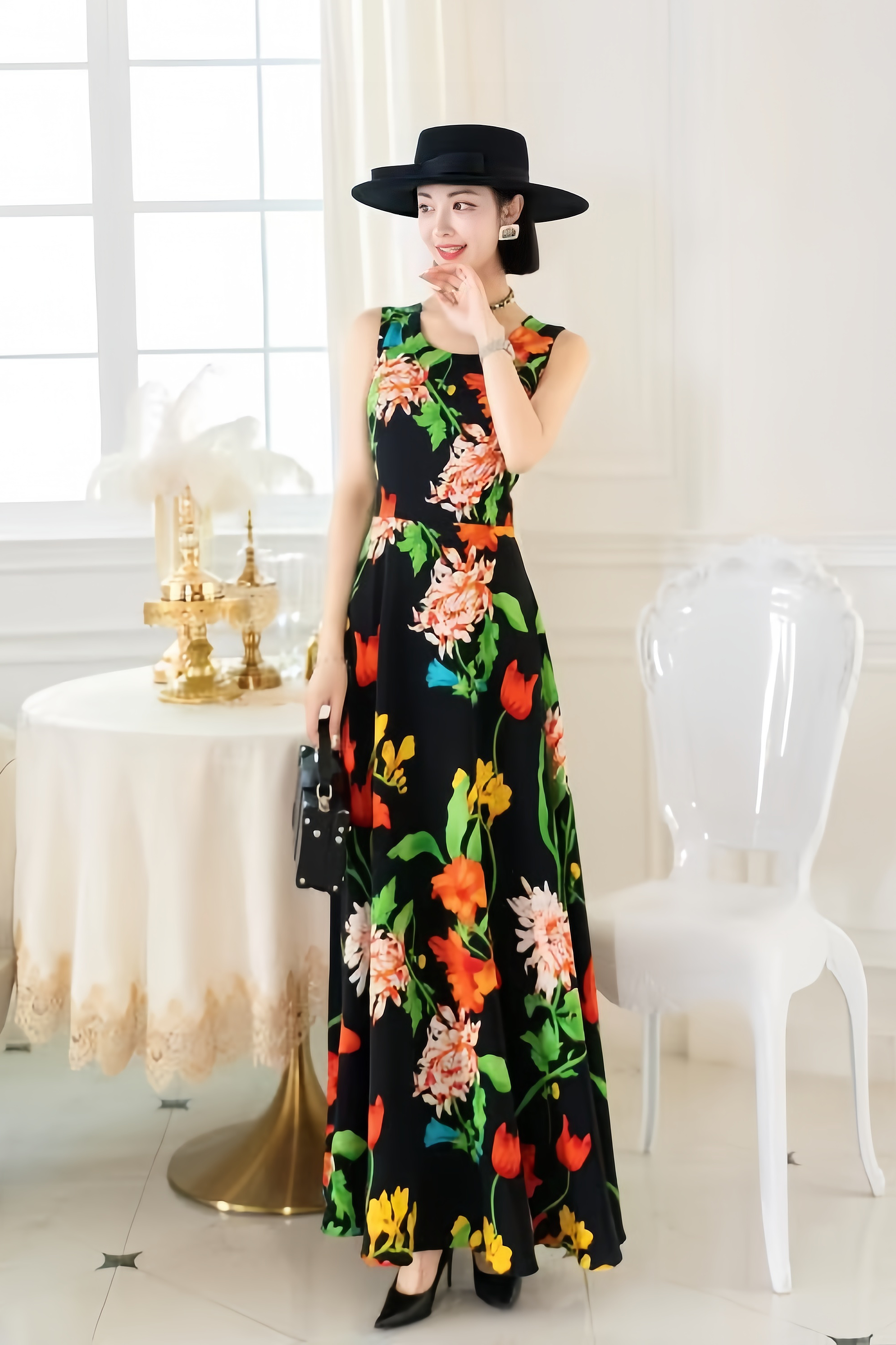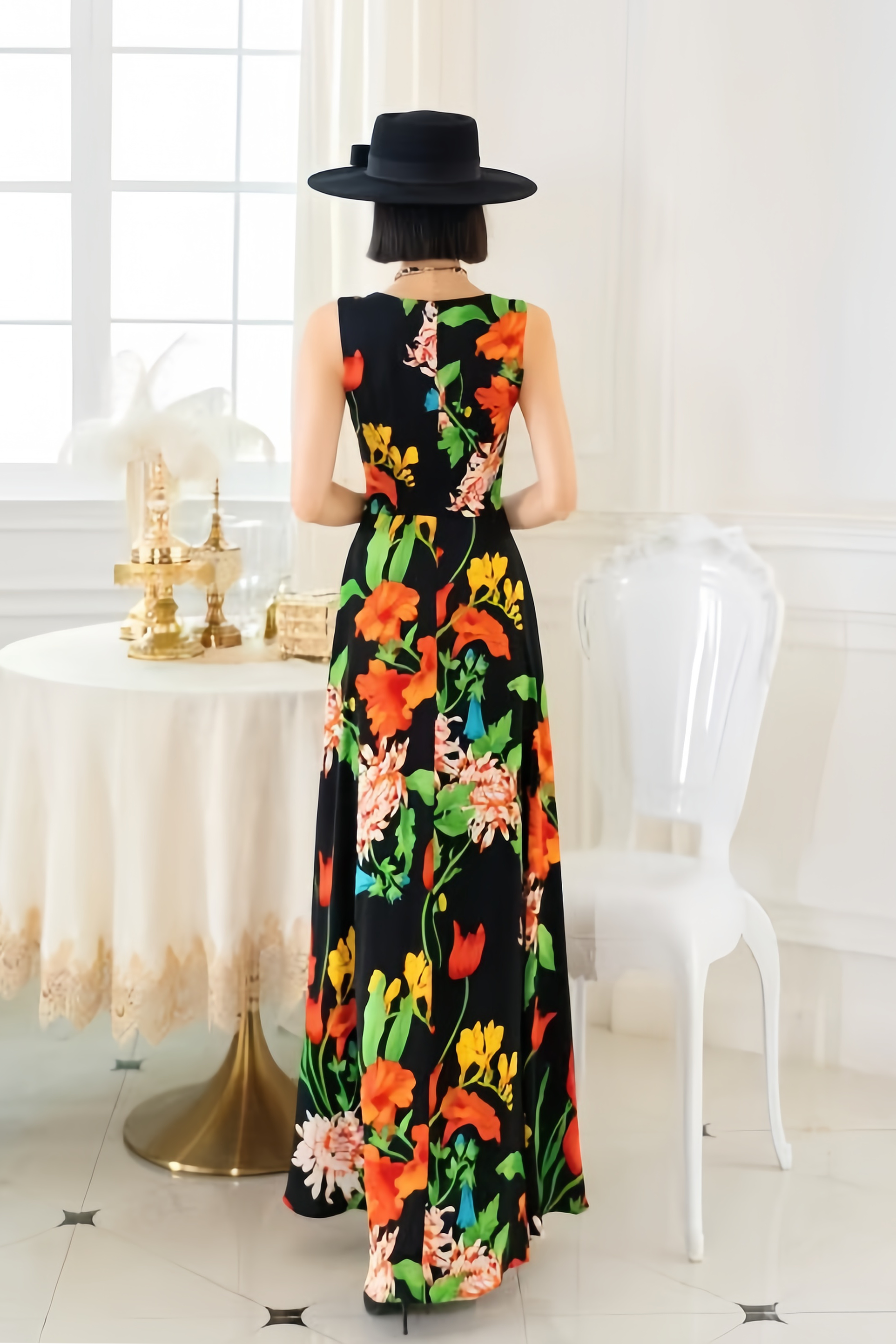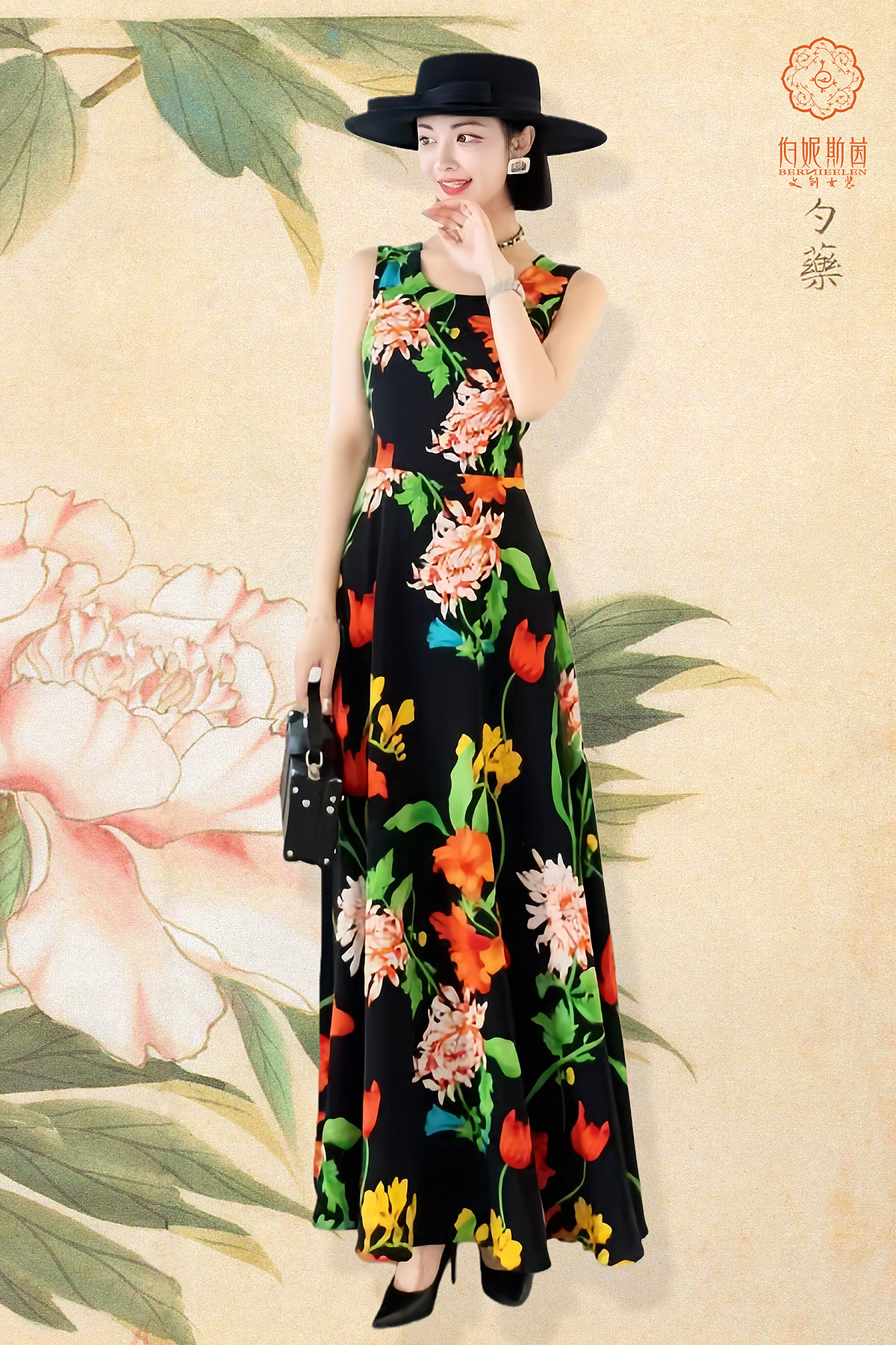 SZ3S82_朱柿色_连衣裙_春夏_圆领无袖收腰A字大摆长款彩色花卉_高级女装_BERNIEELEN 伯妮斯茵