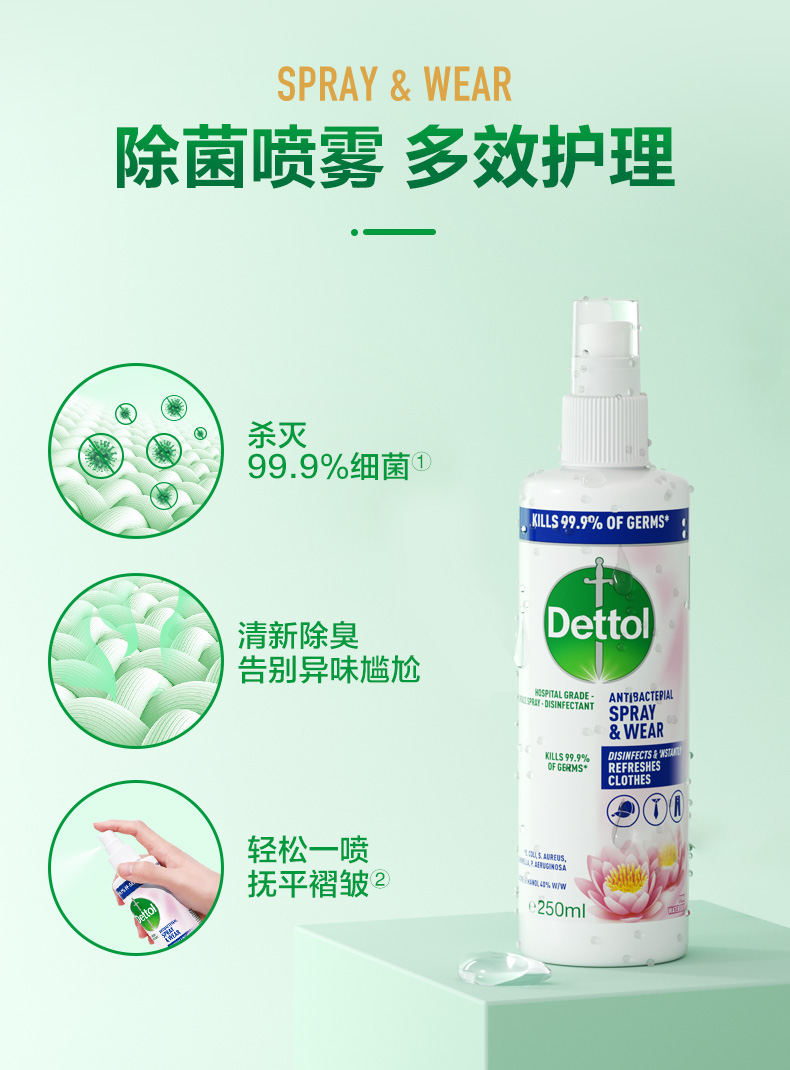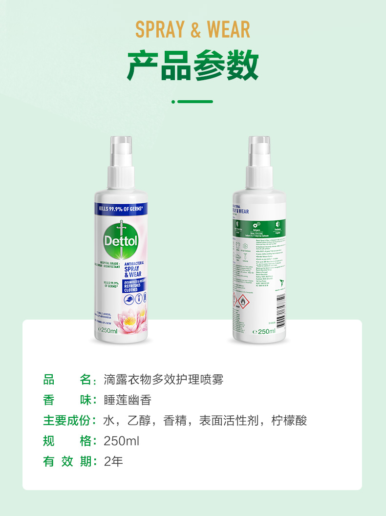 | 【品名】英国Dettol 滴露 衣物织物祛味喷雾 睡莲清香型 【规格】250ml/瓶 【产地】葡萄牙 【保质期】2年 【发货包装】独立包装盒 【发货地】广东 【发货快递】圆通,中通,邮政 【不发货区域】新疆,西藏,港澳台 【发货时效】48-72小时,周末节假日顺延 |