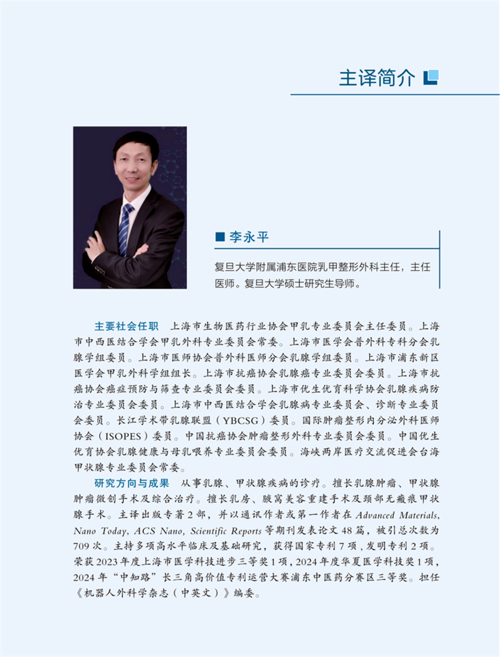 《腔镜与机器人乳腺微创手术》是由上海复旦大学附属浦东医院乳甲整形外科专家李永平教授主译,以病例讨论等简单易懂的方式为读者展示了大量的微创技术,鼓励更多的乳腺外科医生熟练应用这些技术,以改善乳腺癌患者的手术美容效果。