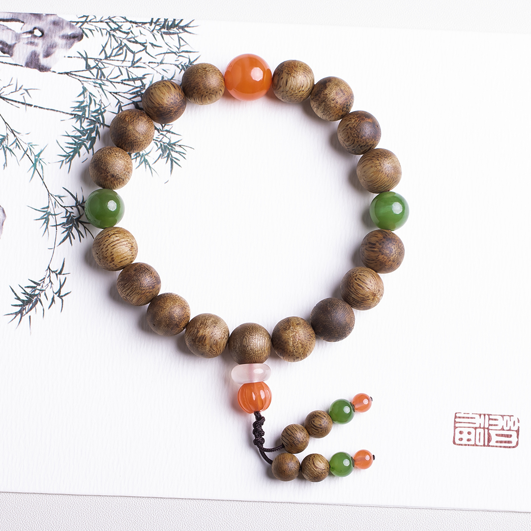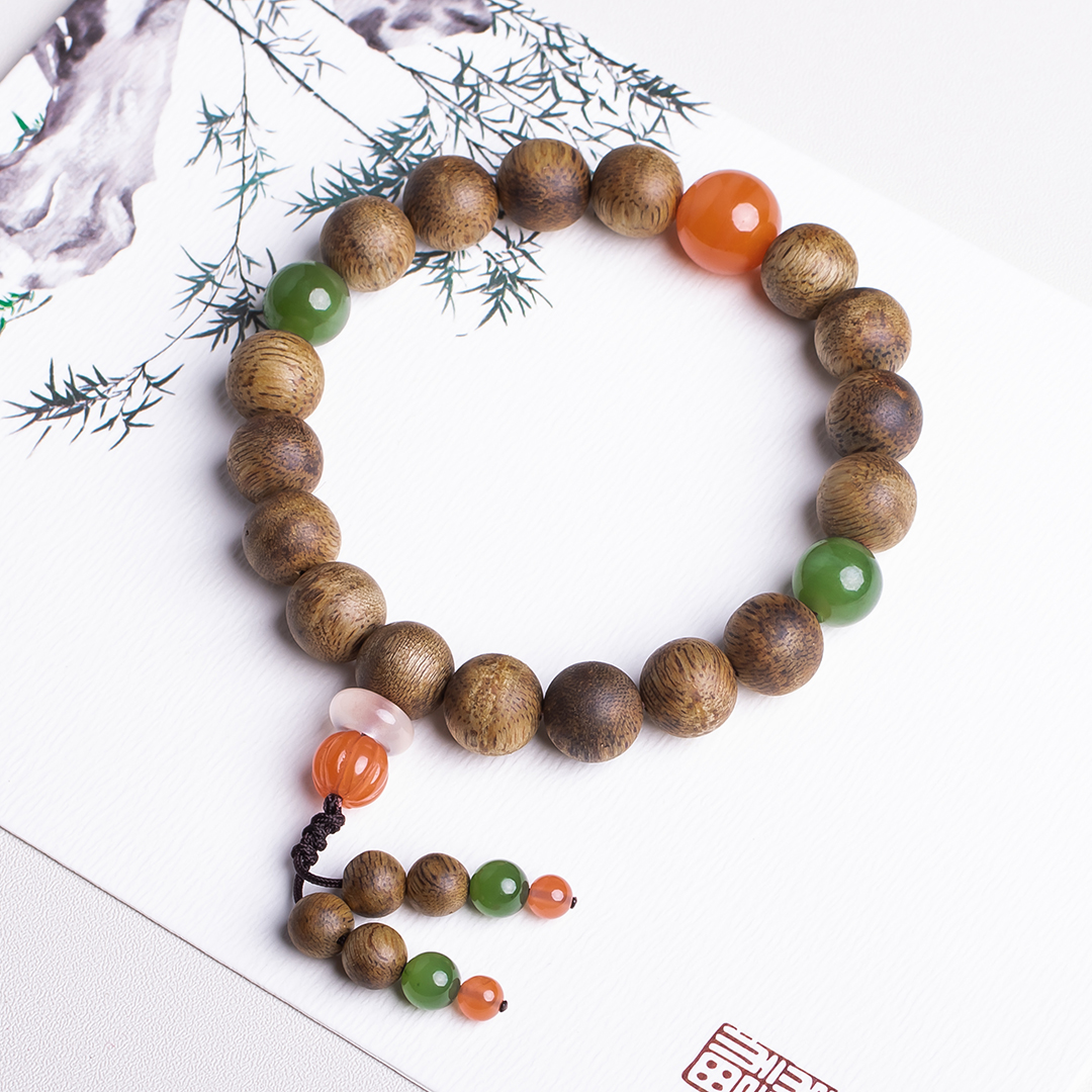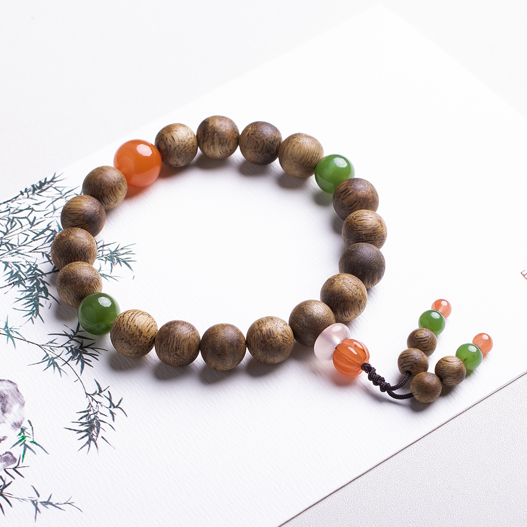 xy0410沉香+碧玉南红瓜珠手串,天然沉香约10.3mm,原色原味,香味自然清甜,经典配色,流苏款,可做手串、手持,一颗红润的南红瓜珠、荔枝冻与圆珠三通,搭成一个特色的佛塔,让整体更有辨识度,更有个性风格,吉祥纳福。