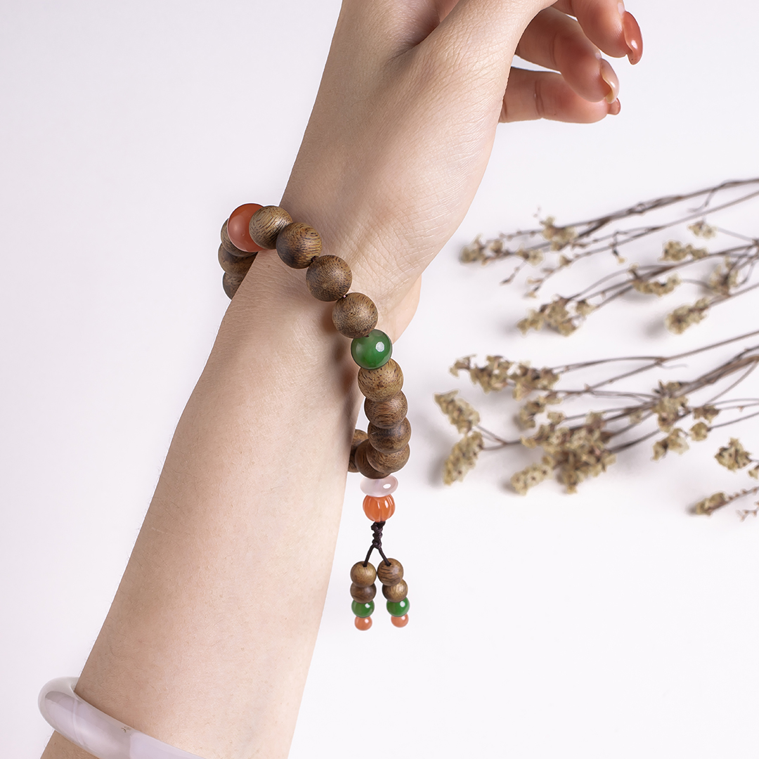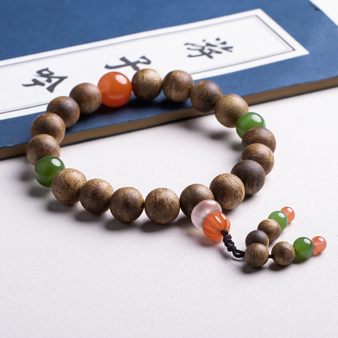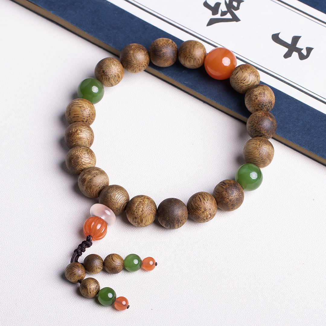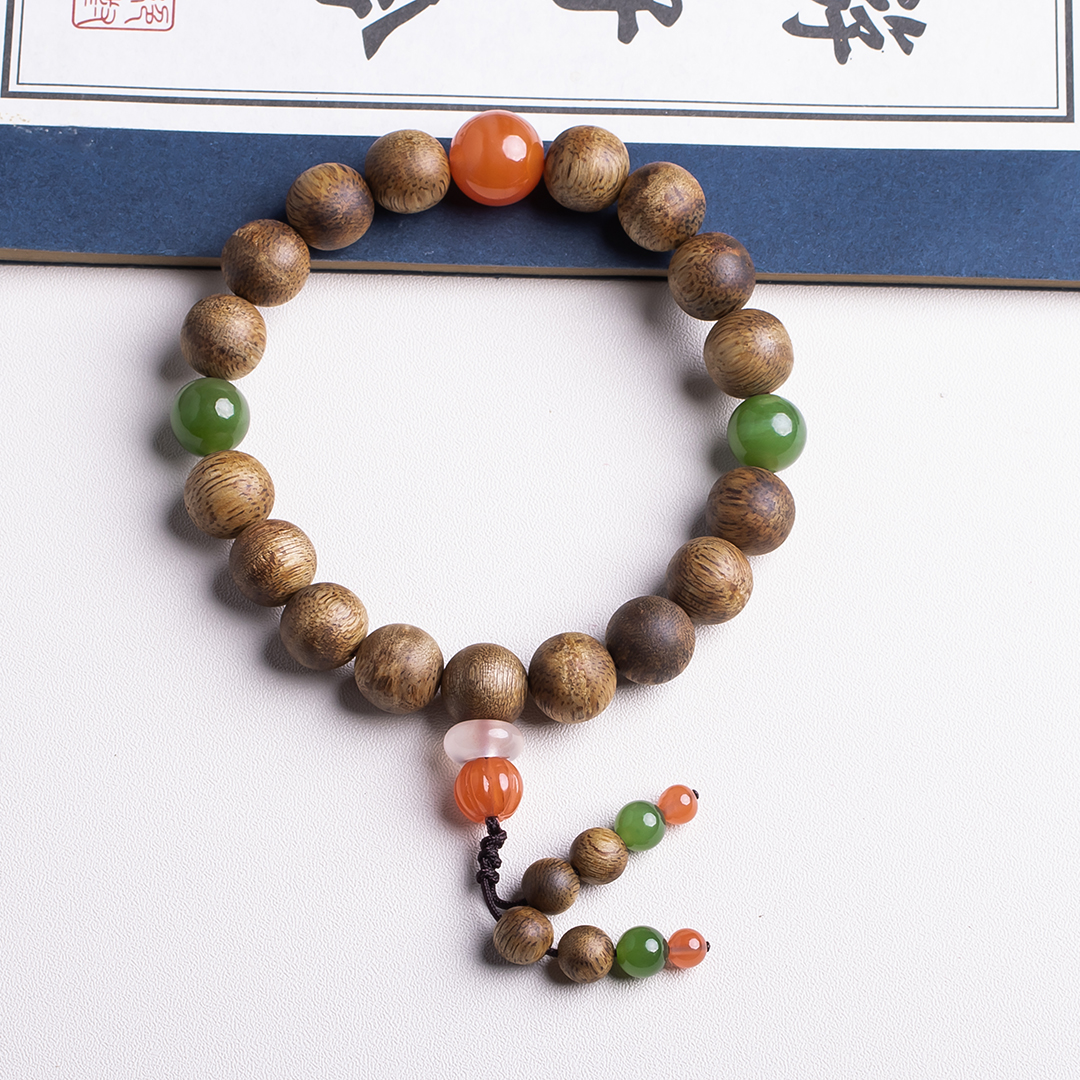 xy0410沉香+碧玉南红瓜珠手串,天然沉香约10.3mm,原色原味,香味自然清甜,经典配色,流苏款,可做手串、手持,一颗红润的南红瓜珠、荔枝冻与圆珠三通,搭成一个特色的佛塔,让整体更有辨识度,更有个性风格,吉祥纳福。