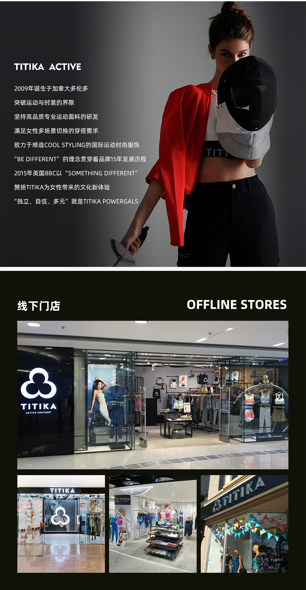 - 2009年,Titika Active Couture诞生于北美时尚之都,重新定义运动服饰,让运动时尚,前卫、性感,更宣扬一种无畏自由的生活态度。TITIKA缇缇卡不断求变,为品牌添加多种元素