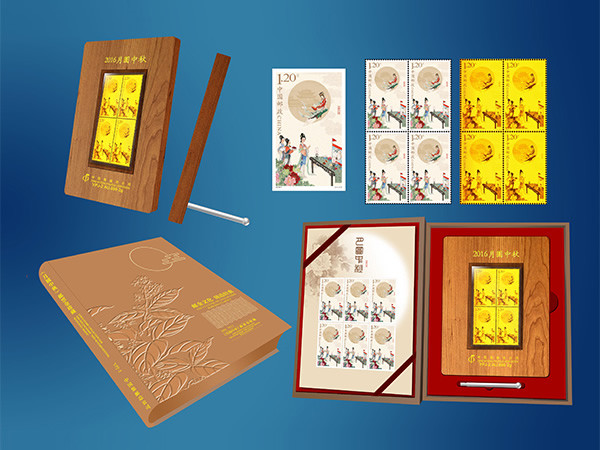每套邮票都置于精美亚克力之中,并配有缅甸花梨展示板,雕刻涂金字印,方便置于案头展示。此外,《月圆中秋》邮票金还配有一个手感细腻的棕黄色皮盒,采用书籍造型,耐刮外层,凸显收藏者浓郁的文化底蕴。