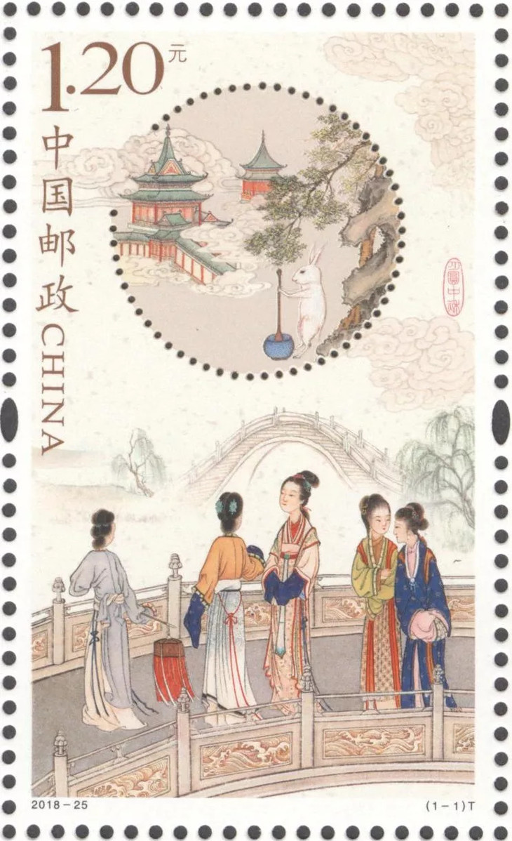 作为中秋祝福系列邮票的第二套,邮票延续2016年《月圆中秋》邮票传统工笔创作手法,画面上半部分展现《玉兔捣药》的神话传说,象征身体健康平安、多福多寿;下半部分描绘“中秋走月”的民间习俗,象征姻缘美满,添丁添福。