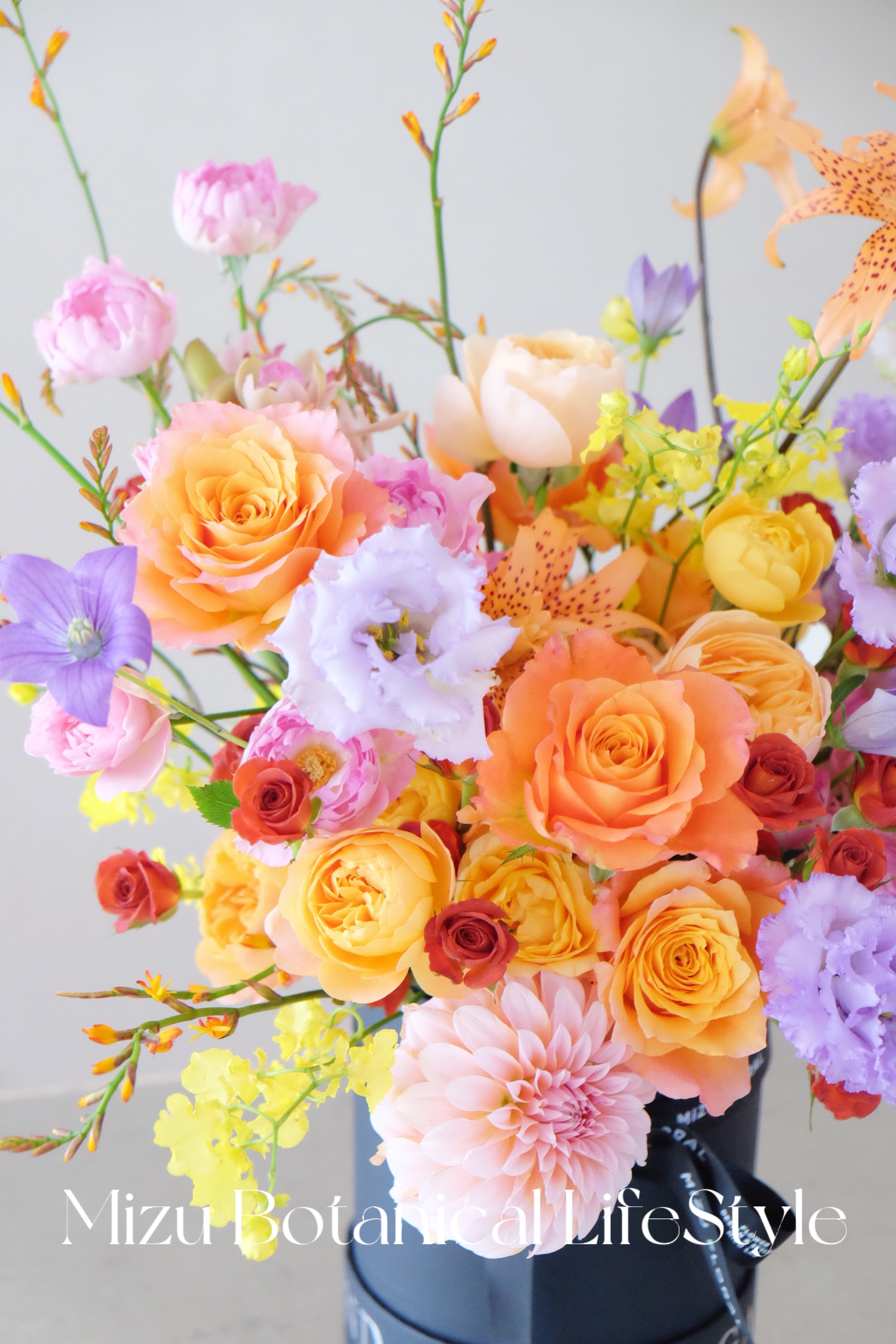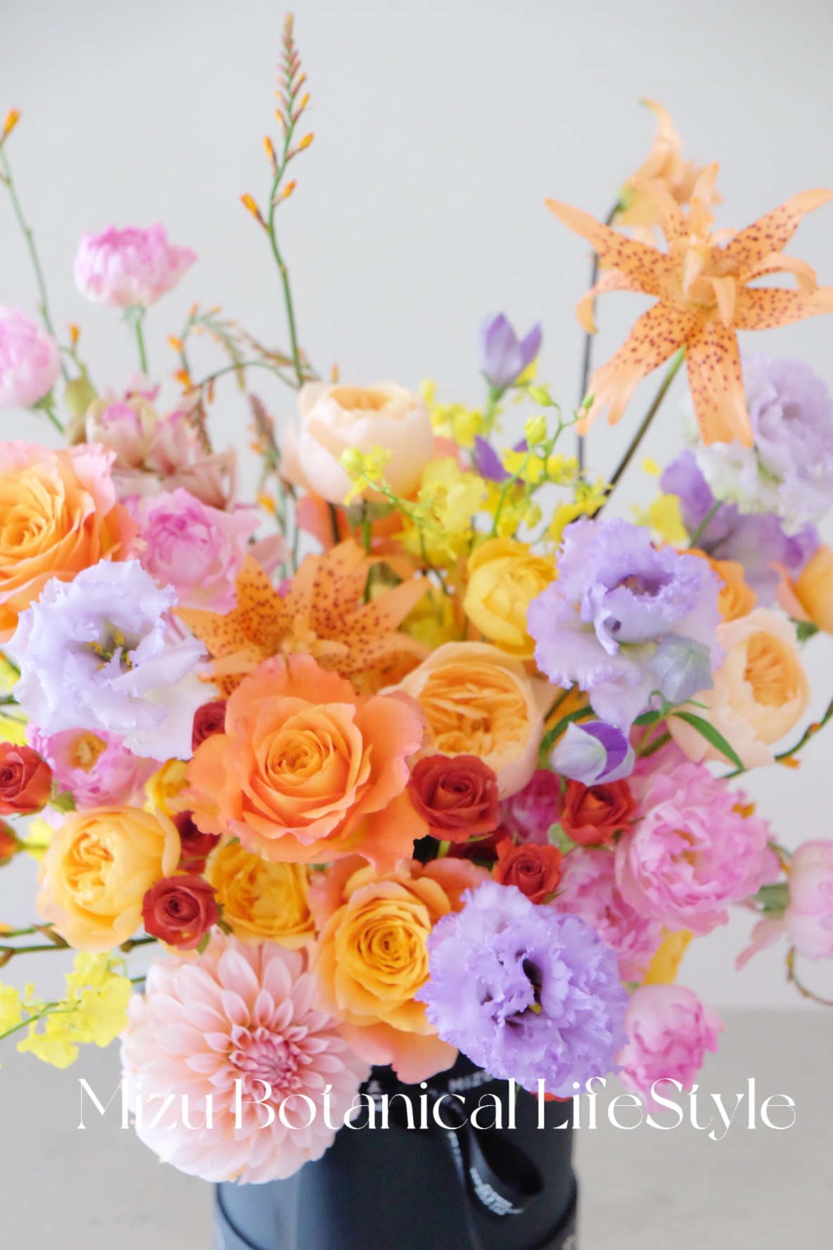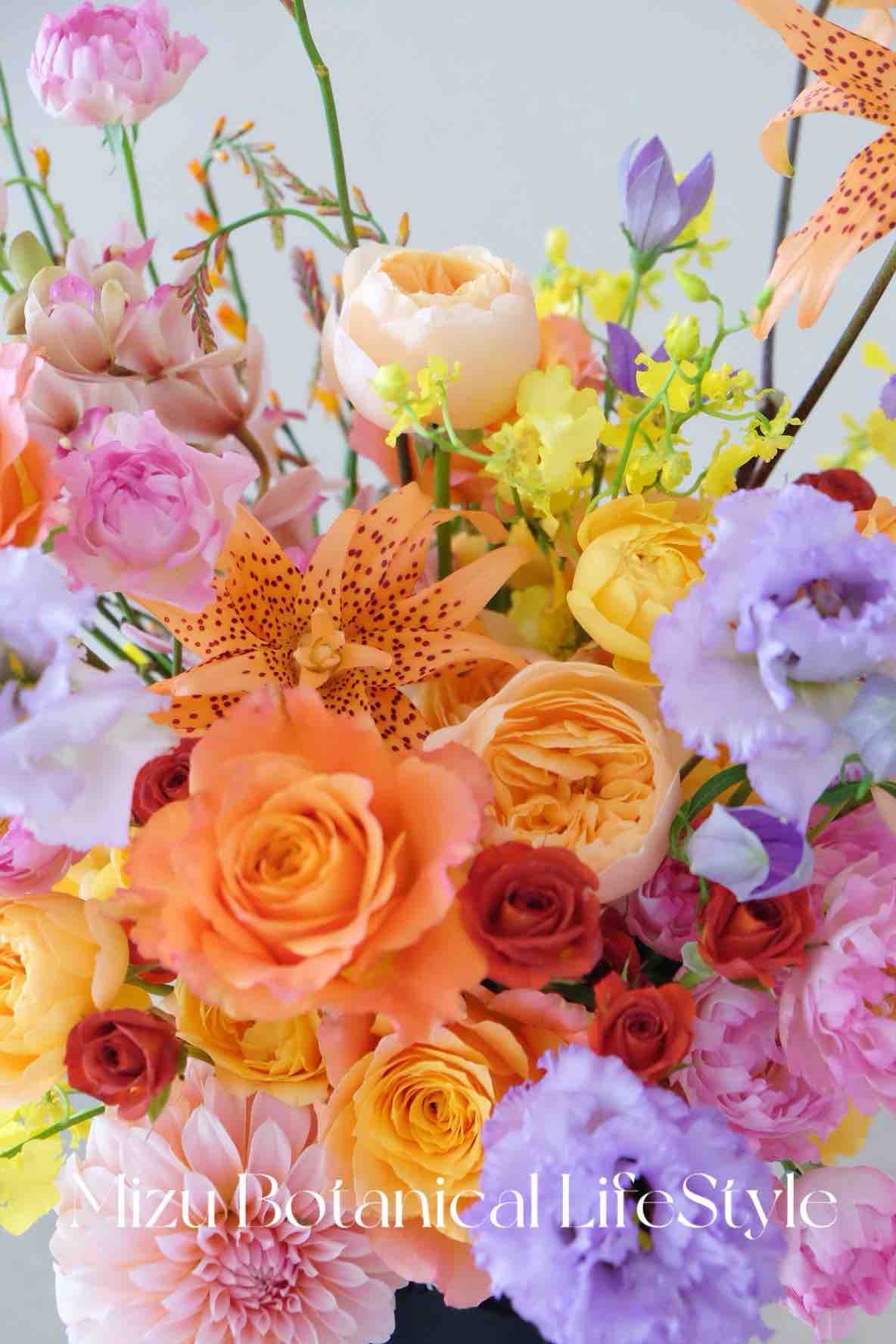 奶油桃子大丽花、龙胆、巧克力蔷薇、火焰兰