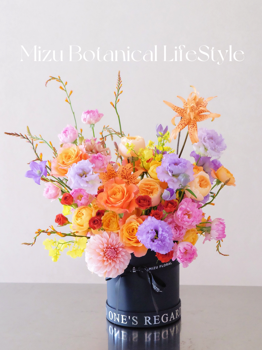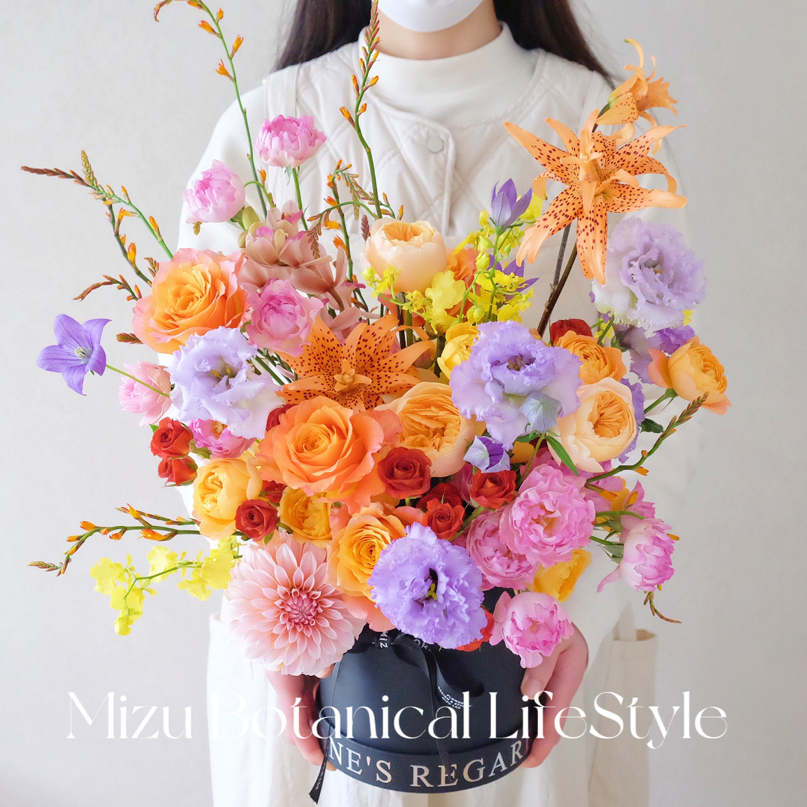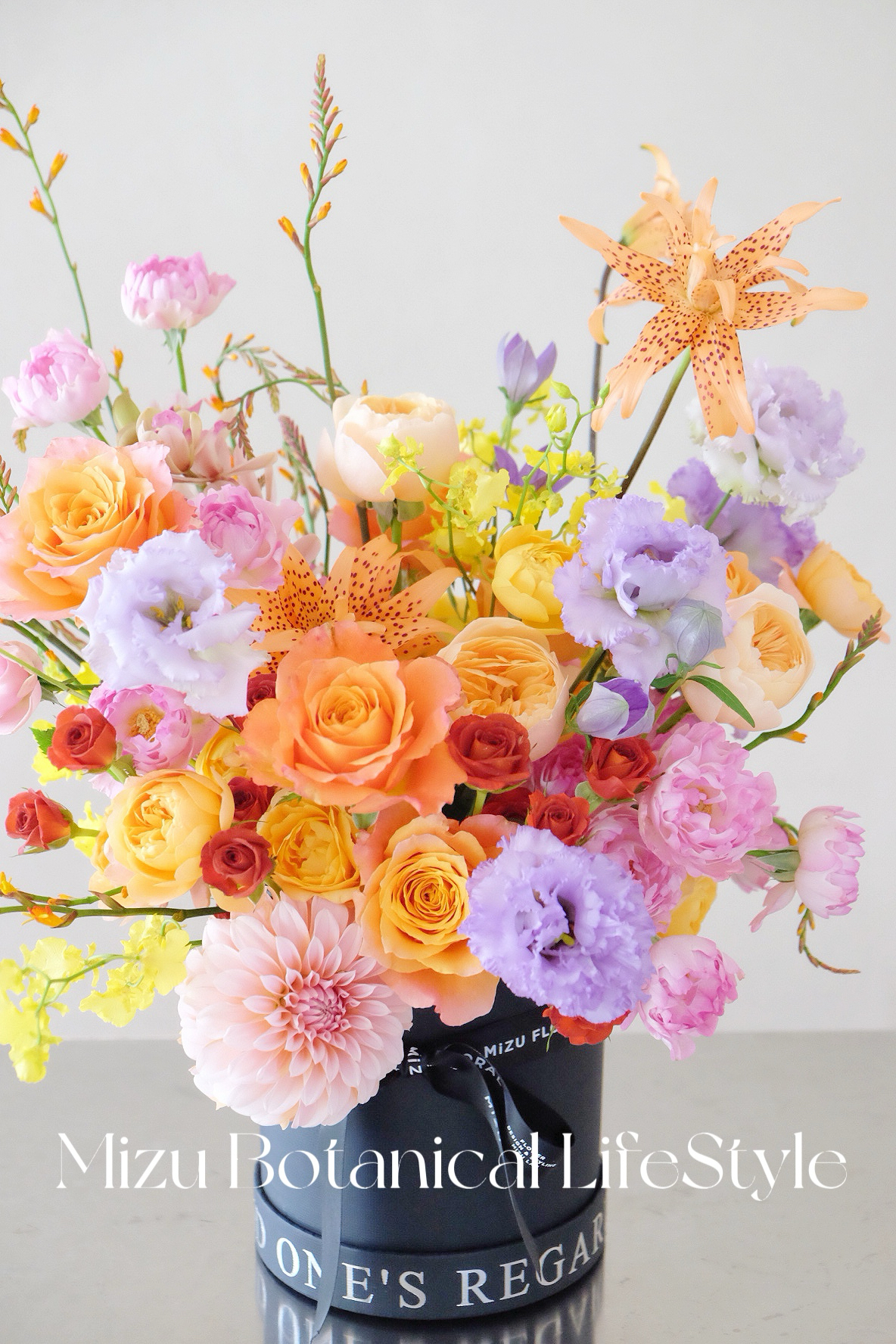 奶油桃子大丽花、龙胆、巧克力蔷薇、火焰兰