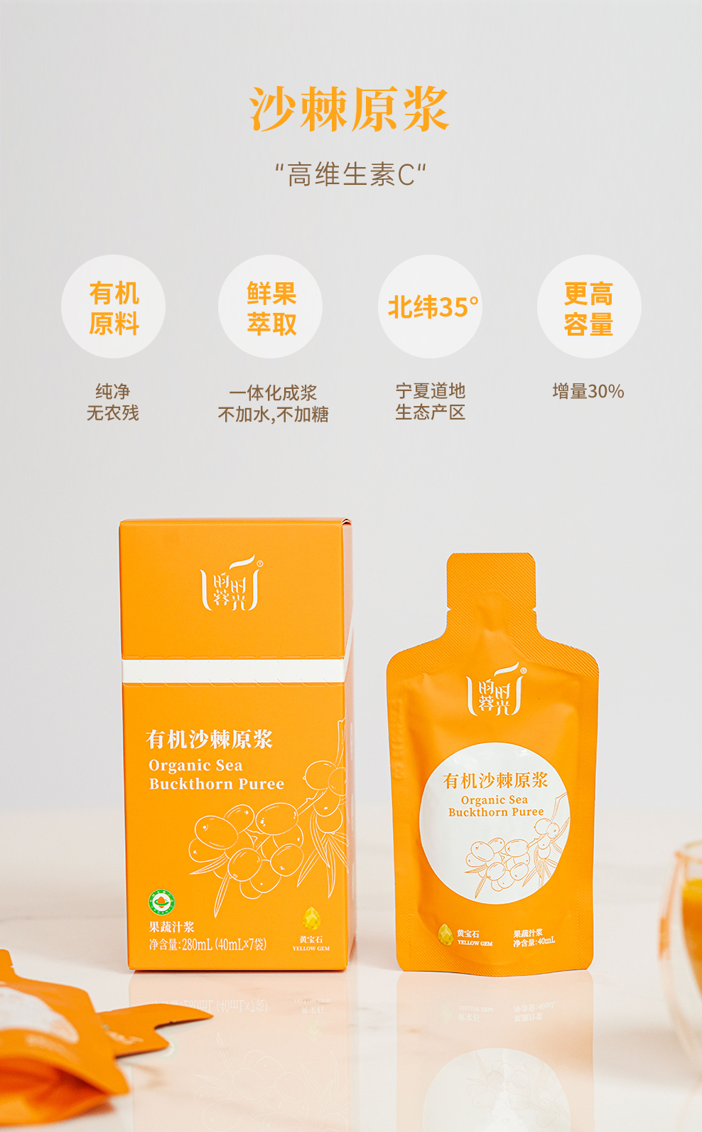 【昀蓉时光 · 单盒 · 有机沙棘原浆】维生素宝库 ·鲜果萃取 · 不加一滴水,·不加一点糖 · 独有工艺去除沙棘酸涩的口感,入口更顺滑(40ml*7袋/盒)
