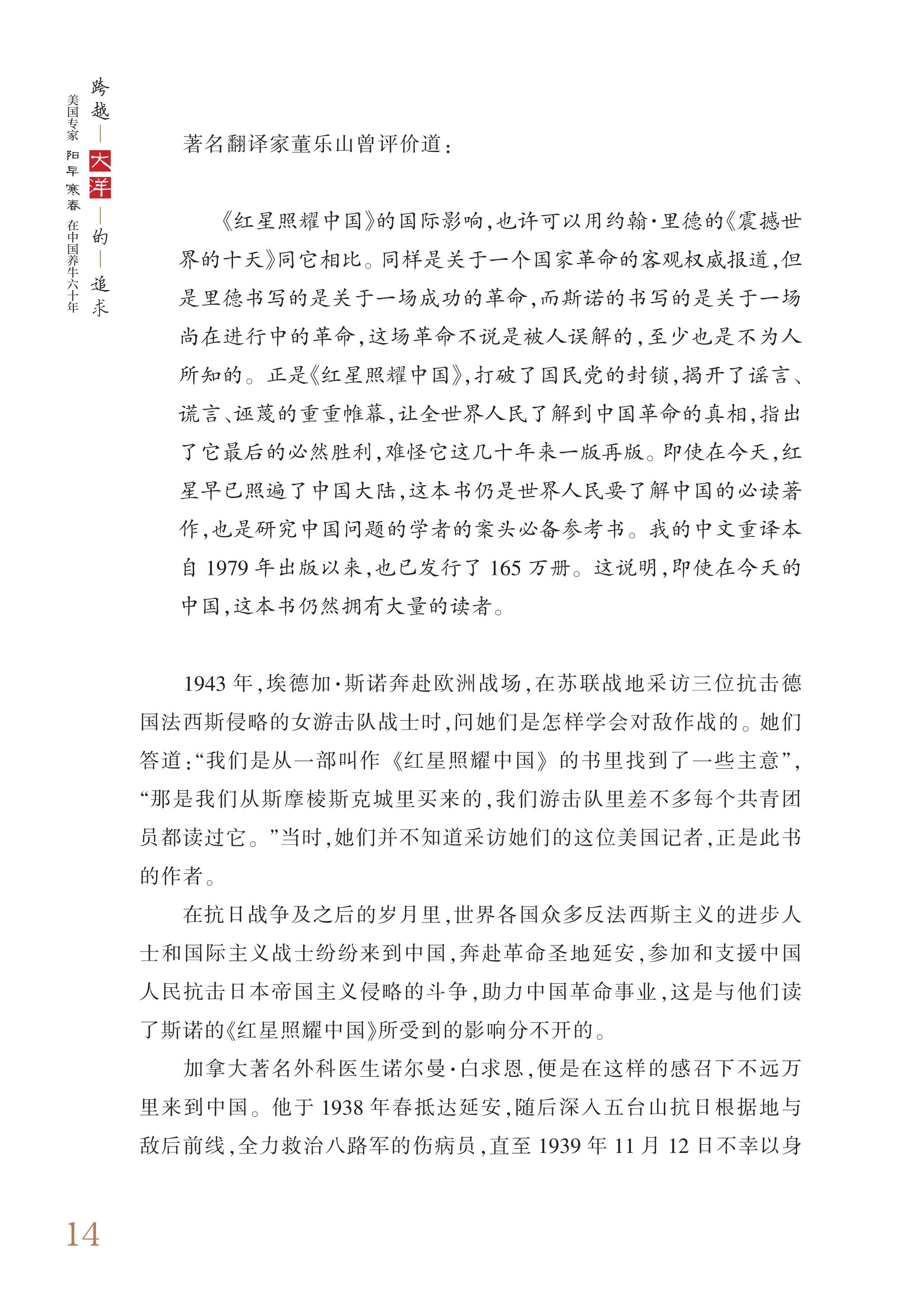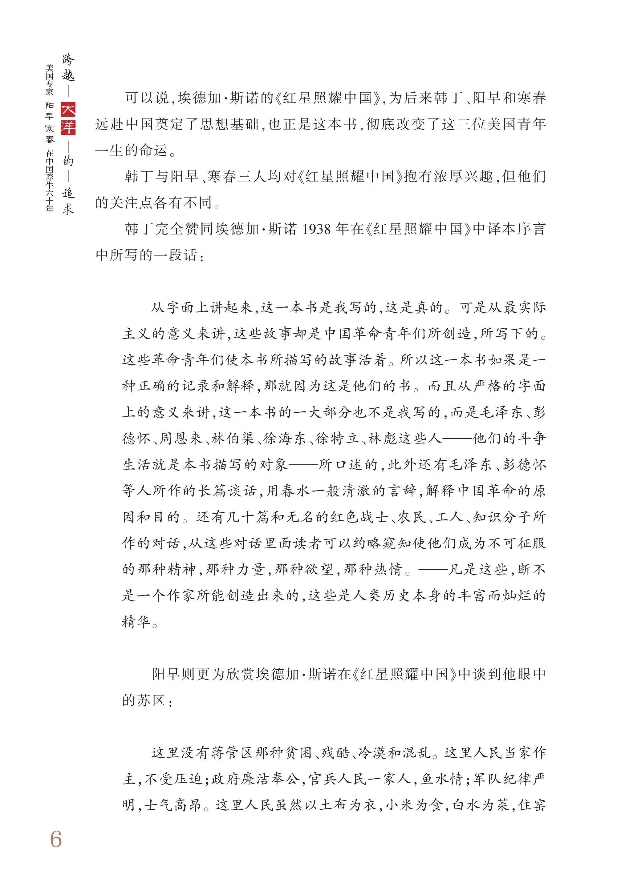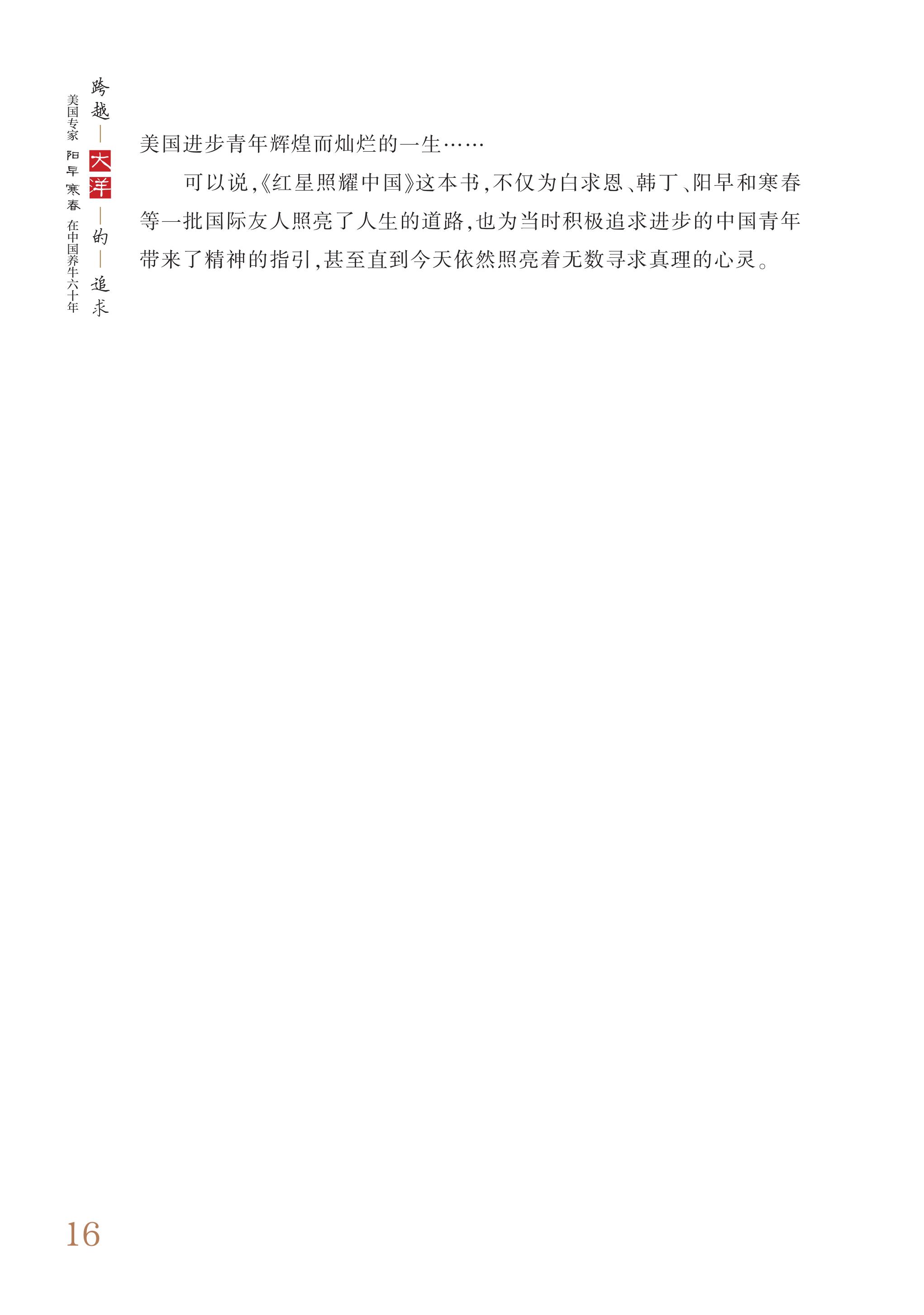 最让我触动的是,阳早、寒春的故事不仅关乎奉献,更关乎选择。在每一个历史十字路口,他们都选择了与人民站在一起,与脚下的土地站在一起。编辑这本书,我常在想,什么是真正的“国际化”?也许不是走向远方,而是让精神扎根;什么是真正的“影响力”?或许不是声名远扬,而是用一生默默做好一件事。在如今这个常常谈论“选择”的时代,他们的生命轨迹给出了另一种回答:真正的选择,不是选择去哪里,而是选择成为谁;不是选择获得什么,而是选择为何坚守。