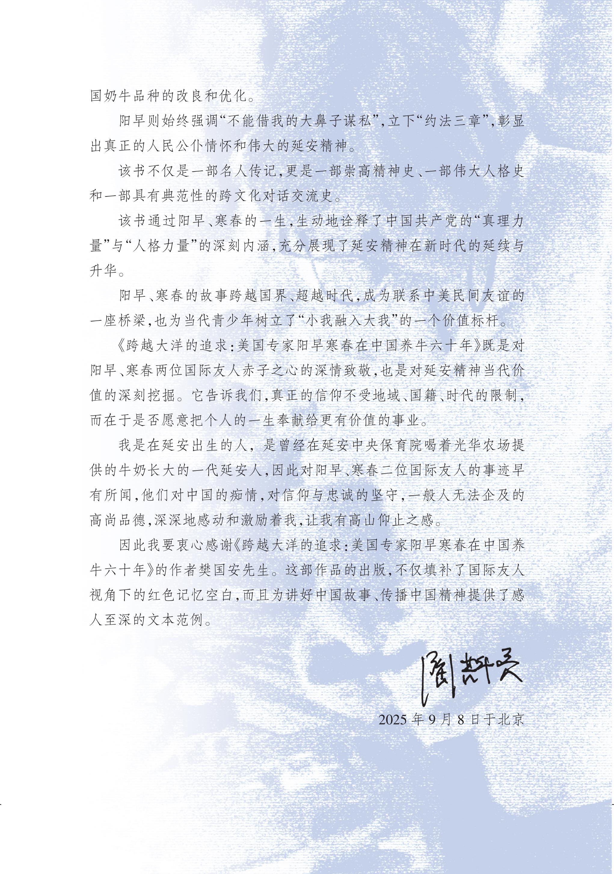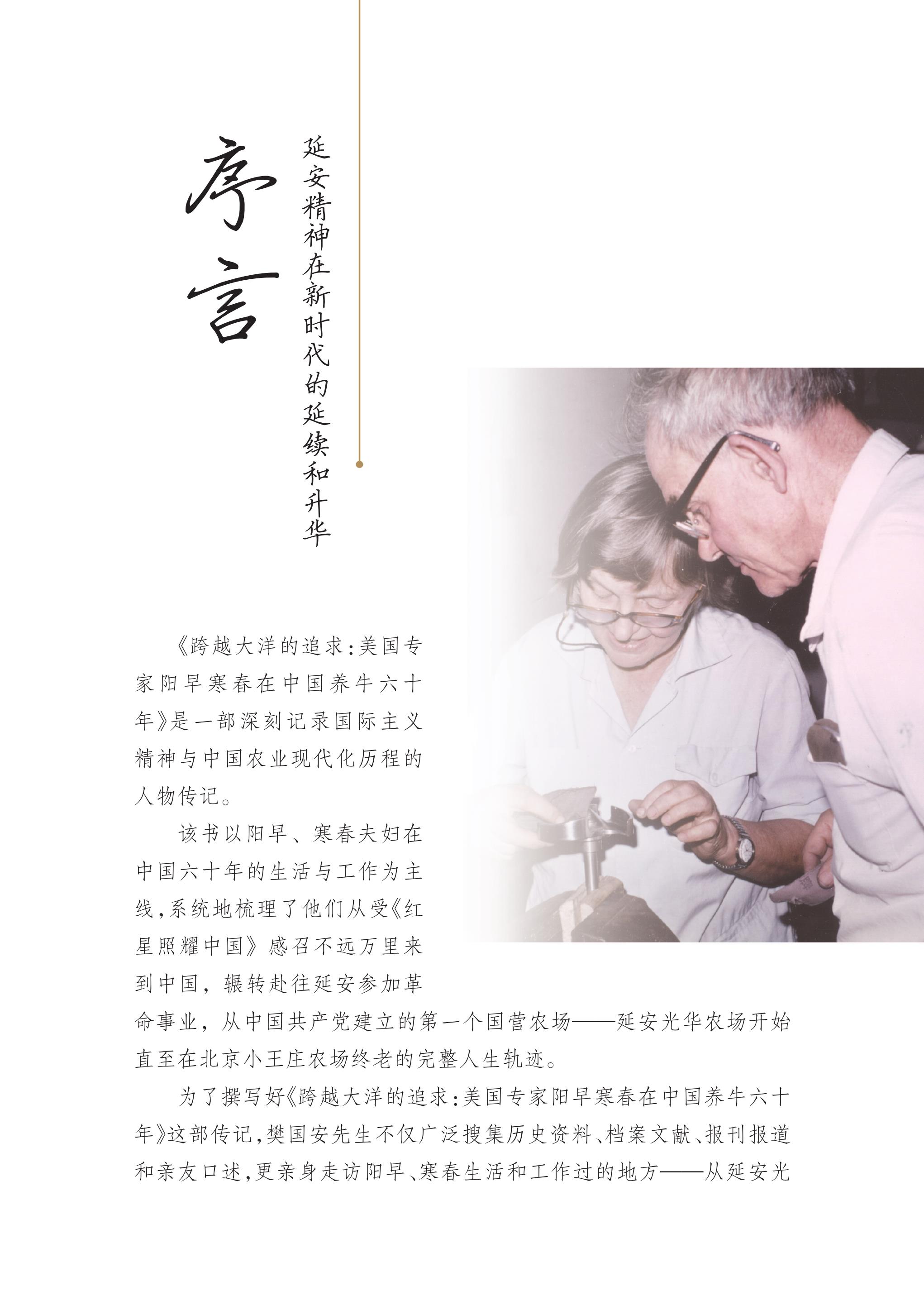 《跨越大洋的追求:美国专家阳早寒春在中国养牛六十年》正是为了回答这些问题而诞生。这本书由著名作家樊国安创作完成,他走访延安、西安、内蒙、北京等多地,查阅大量档案,采访亲友故交,用真诚的笔触还原出两位“老延安”真实、温暖而坚韧的一生。