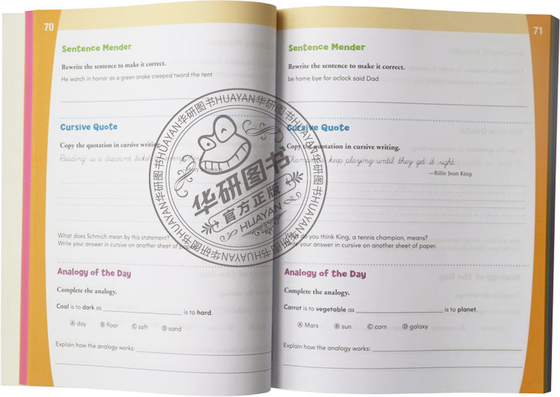 Smart Practice Workbook: Fourth Grade《越学越聪明:四年级练习册》是美国学乐教育集团专为小学四年级学生设计的一本综合性练习册,全书共分为五部分:阅读(Reading)、语法(Grammar)、词汇(Vocabulary)、写作(Writing)及数学(Math)。书本内含教学专家精心设计的高质量练习,题型丰富多样,题目难度适合,后面附答案页和48张字卡(撕下来就可以用)。