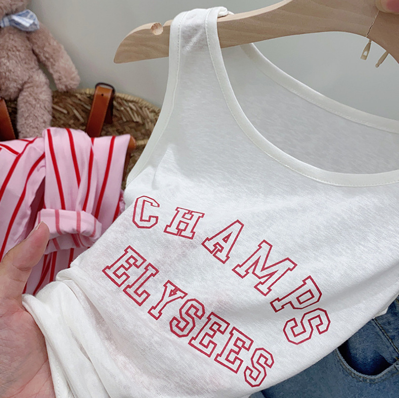 【时尚韩版中小童三件套装】2024夏新儿童款女童条纹长袖衬衫+背心裤子