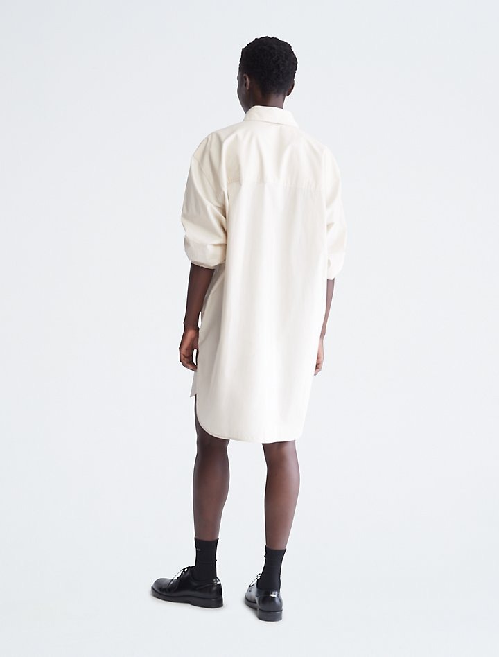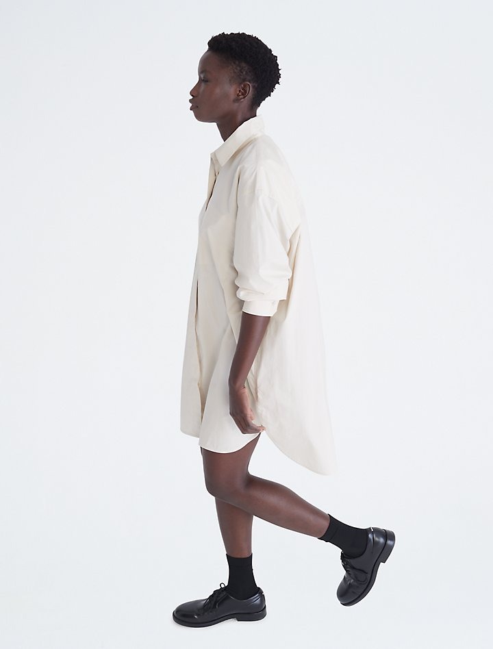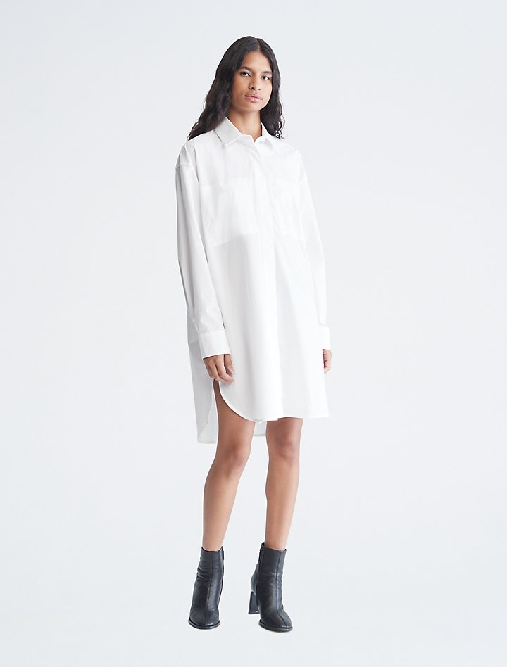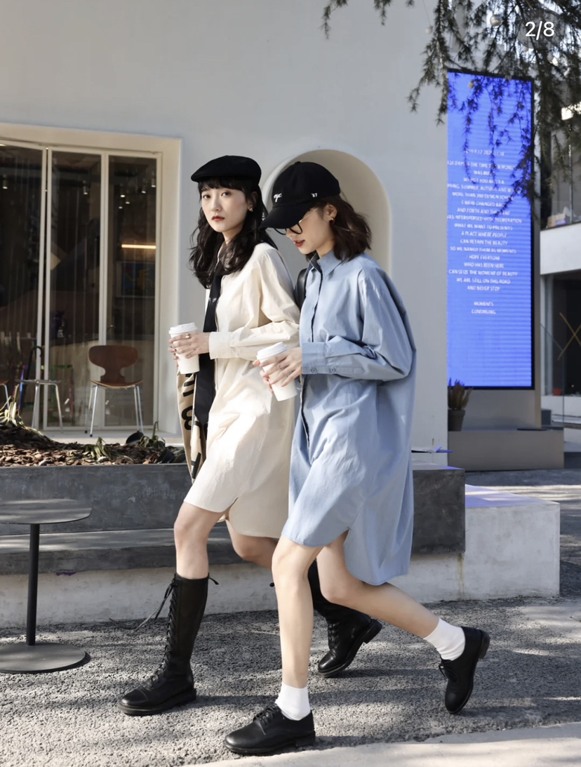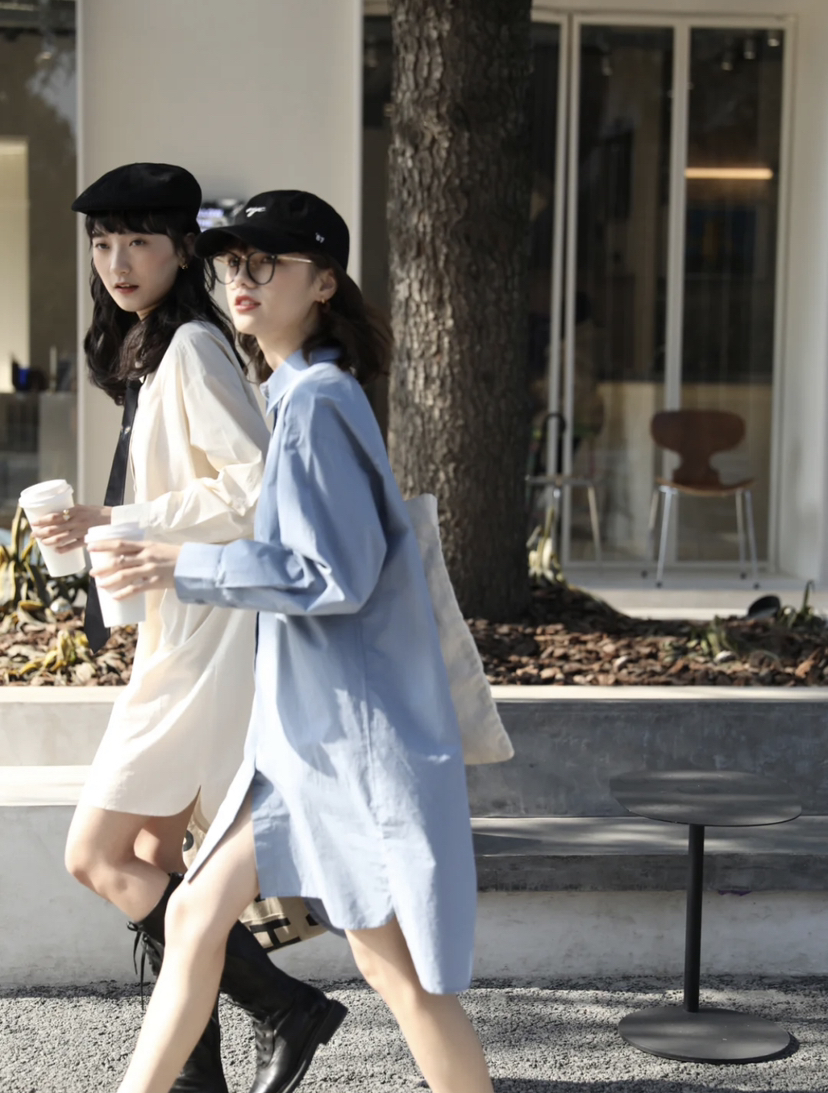 这件衬衫裙是用全棉的平纹布制成的,看起来干净利落,非常适合多种穿着场合。裙长到膝盖,前面有扣子,胸前有口袋。衣袖很长,末端有袖口。