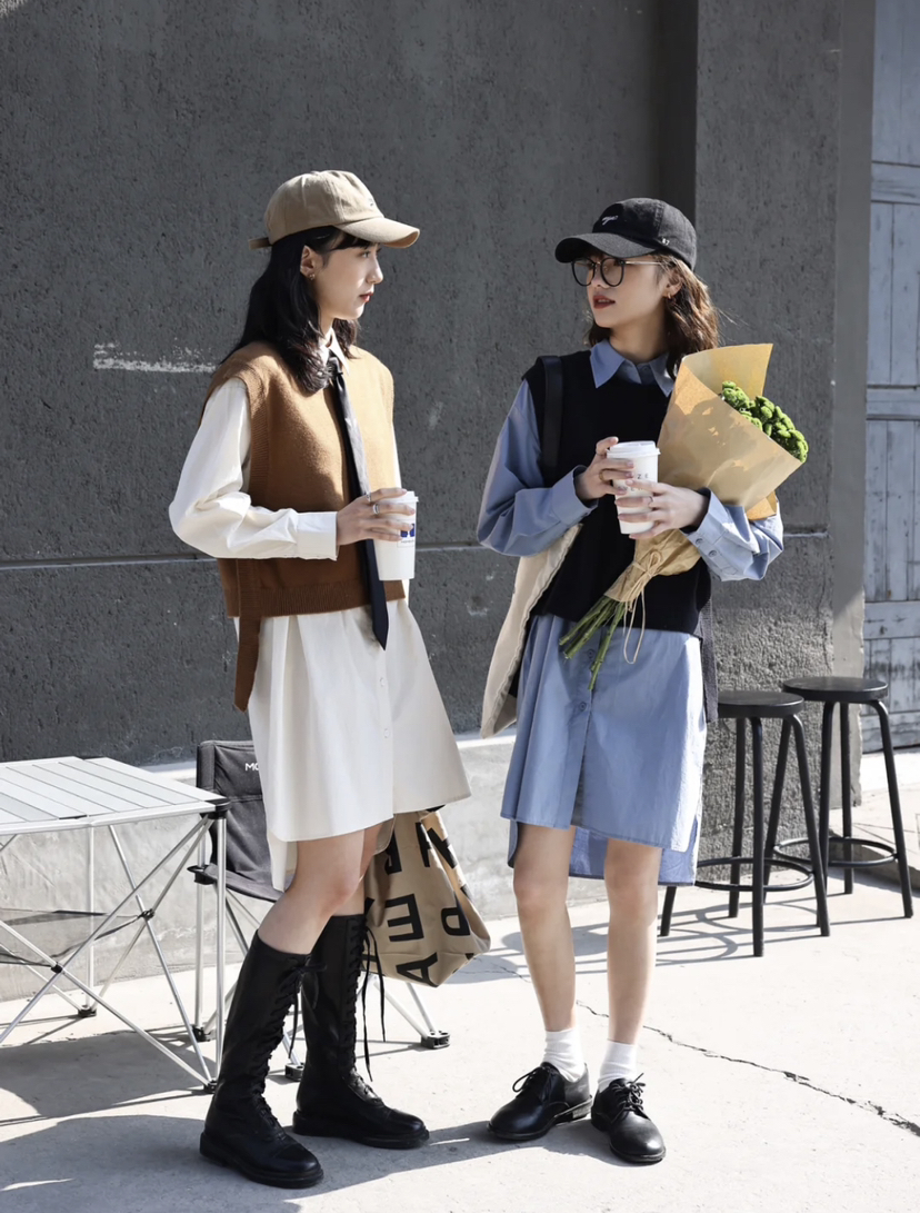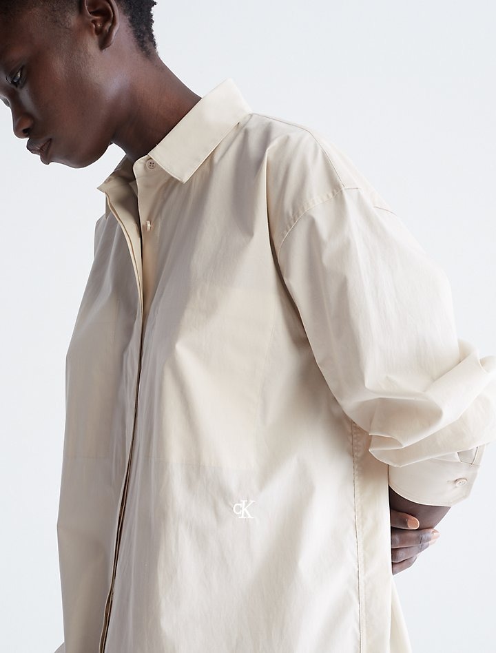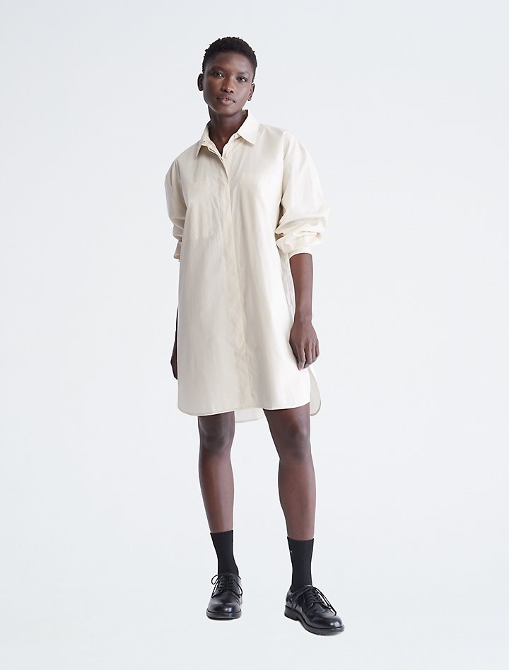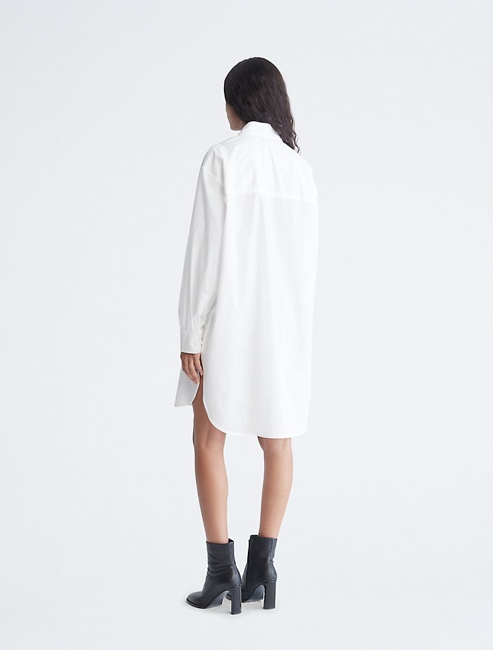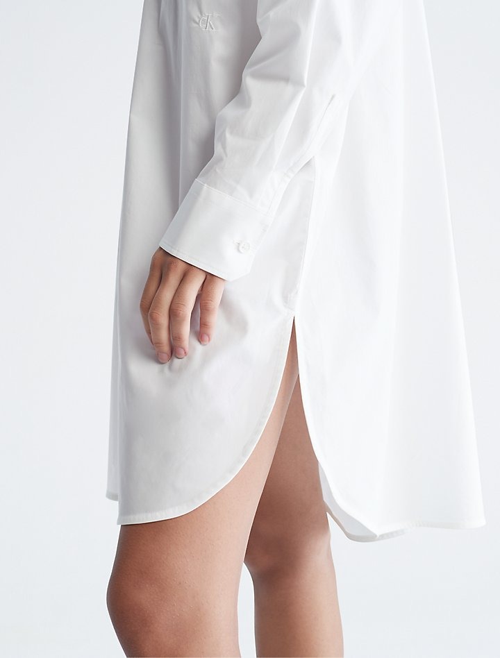 这件衬衫裙是用全棉的平纹布制成的,看起来干净利落,非常适合多种穿着场合。裙长到膝盖,前面有扣子,胸前有口袋。衣袖很长,末端有袖口。