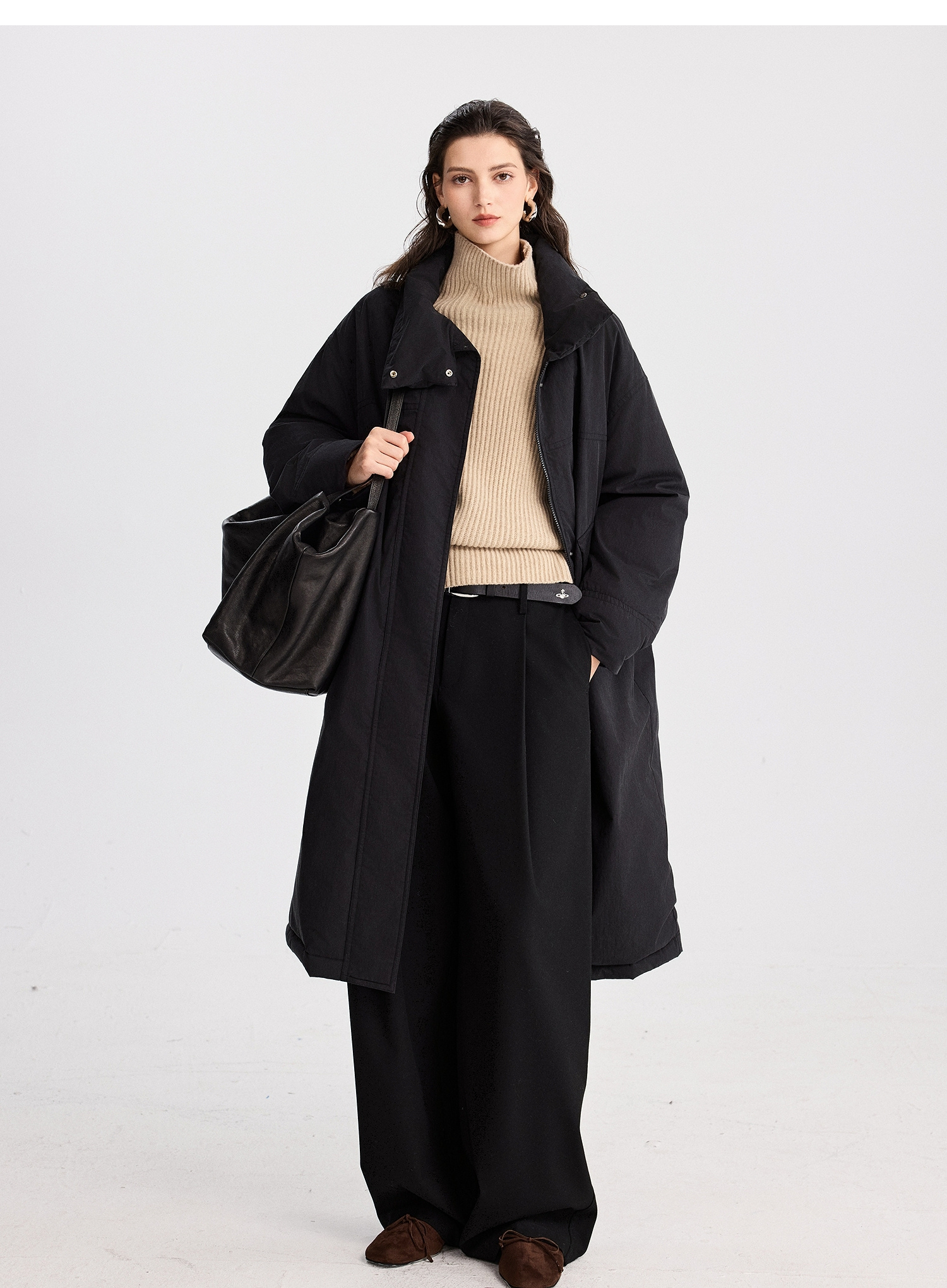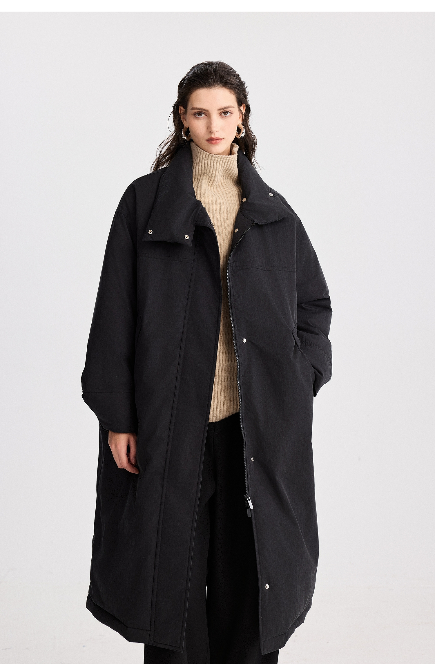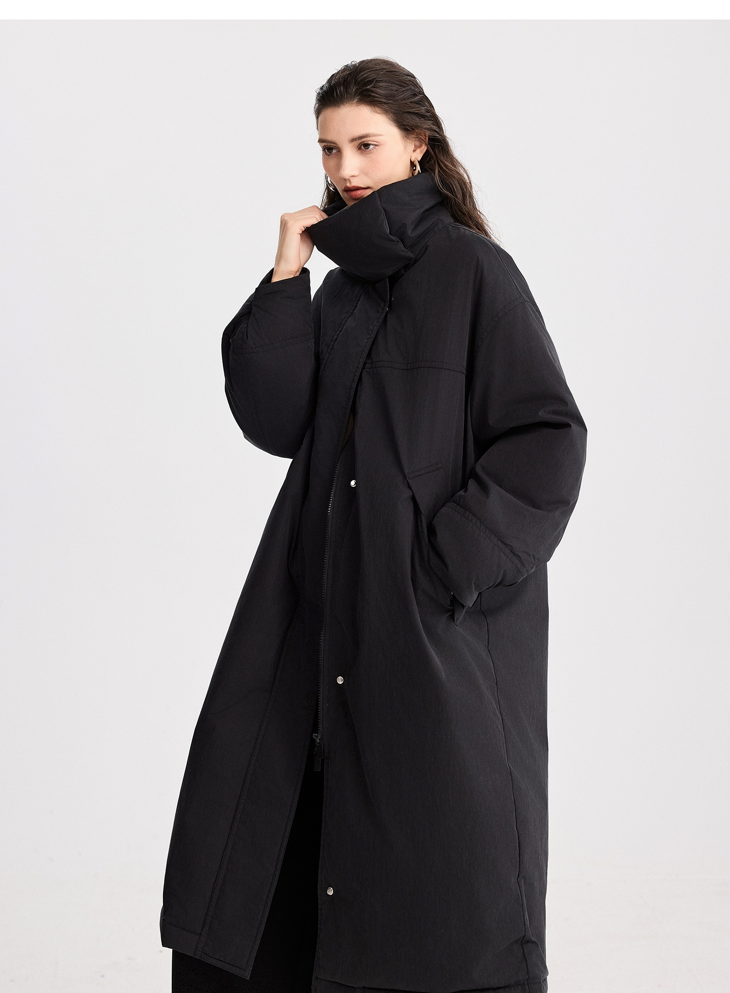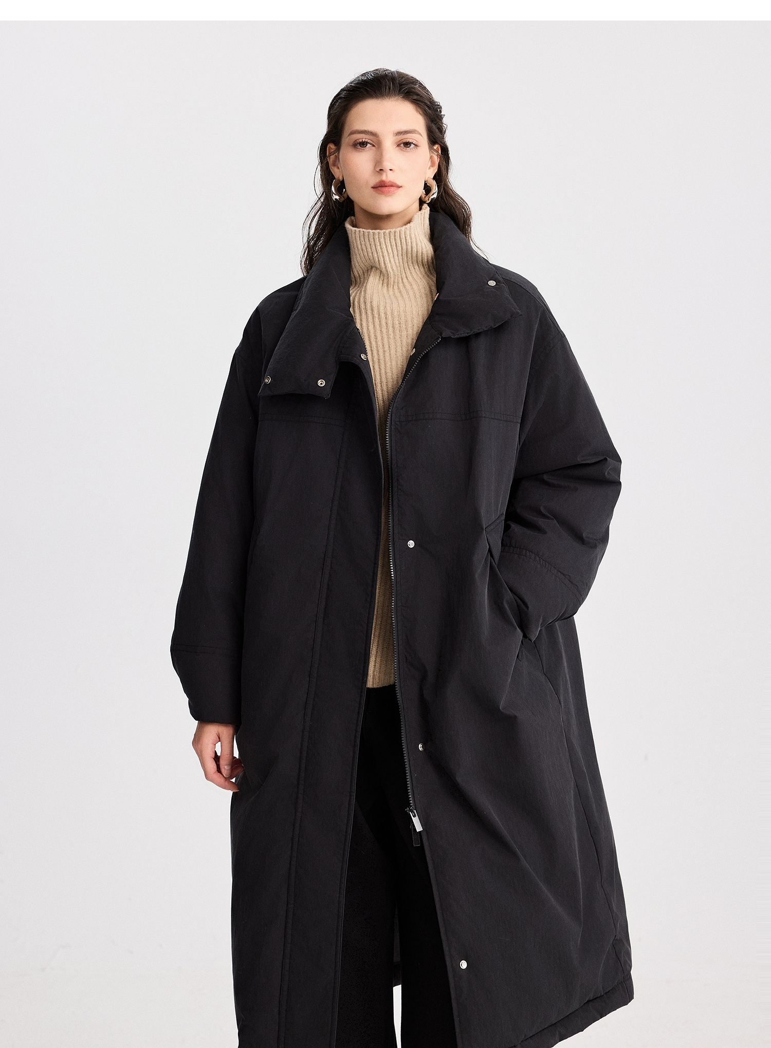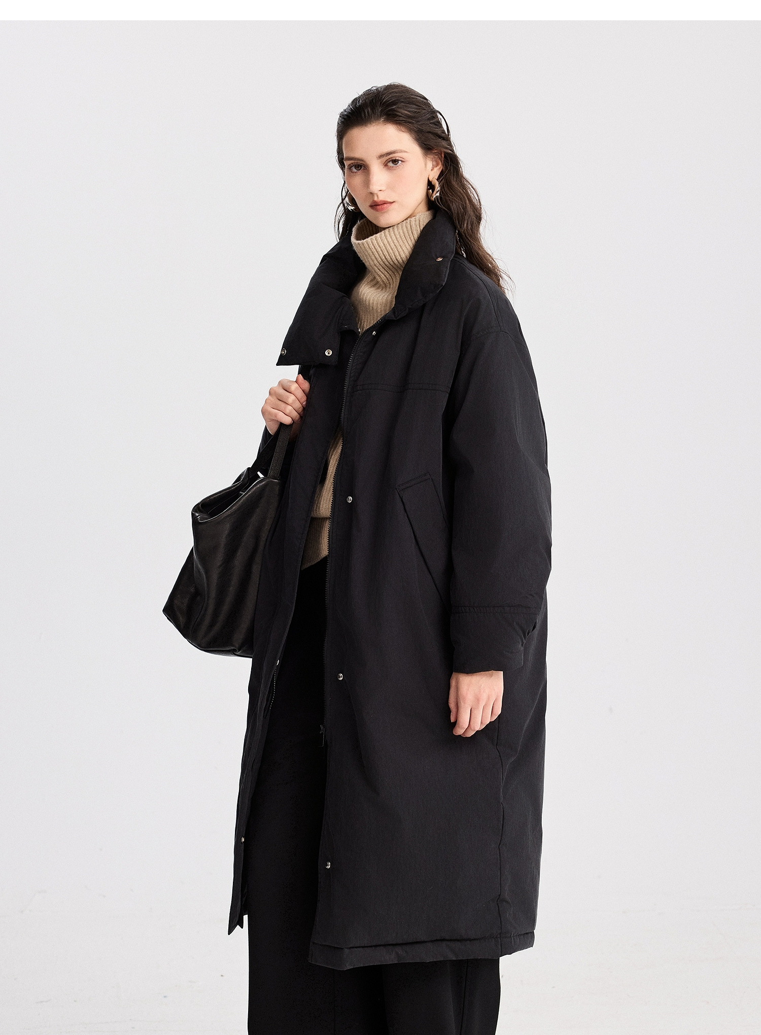 棉仓367615003-【90白鹅绒】立领风衣黑色羽绒服女中长款肌理感无绗线鹅绒服