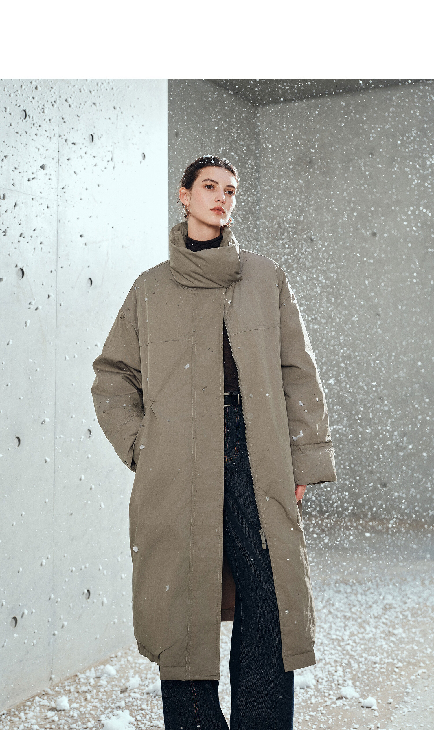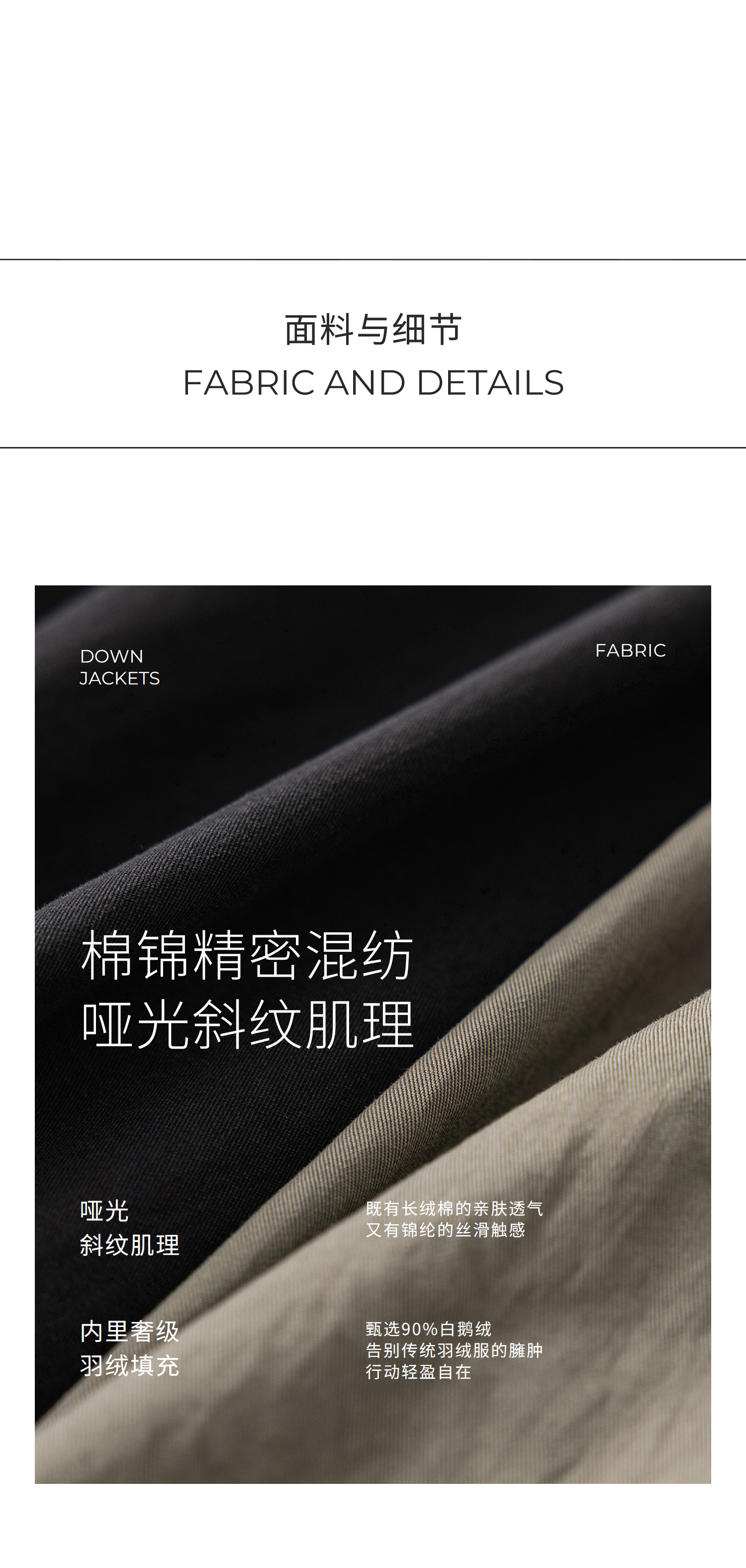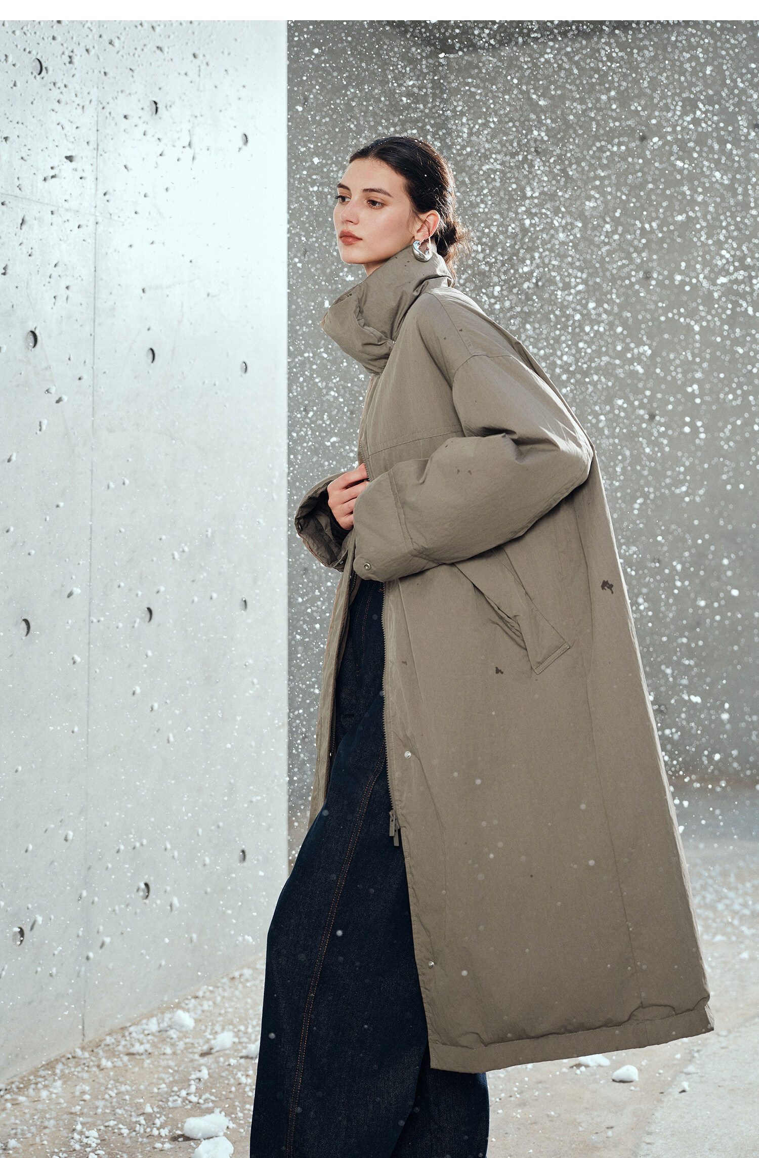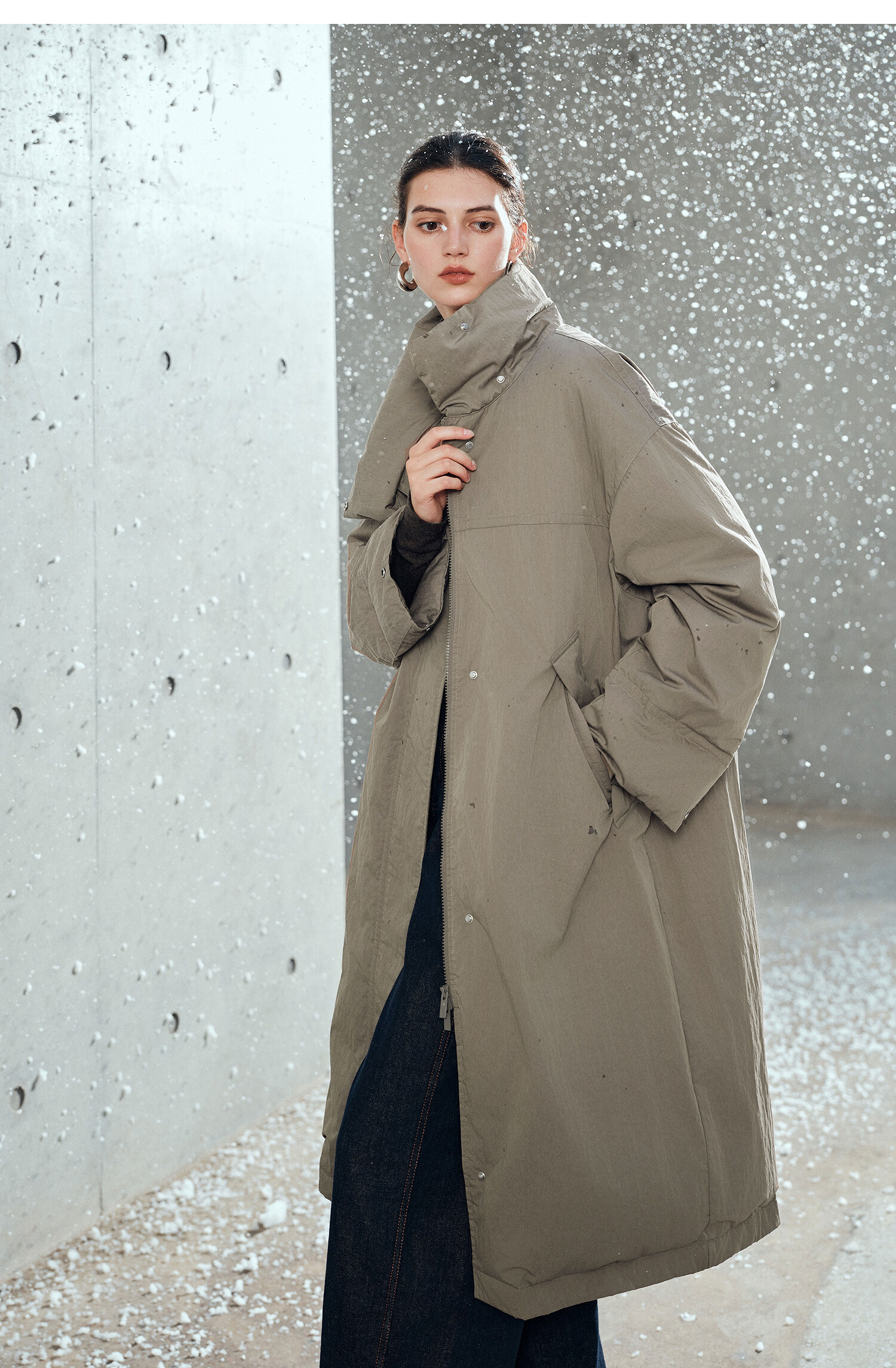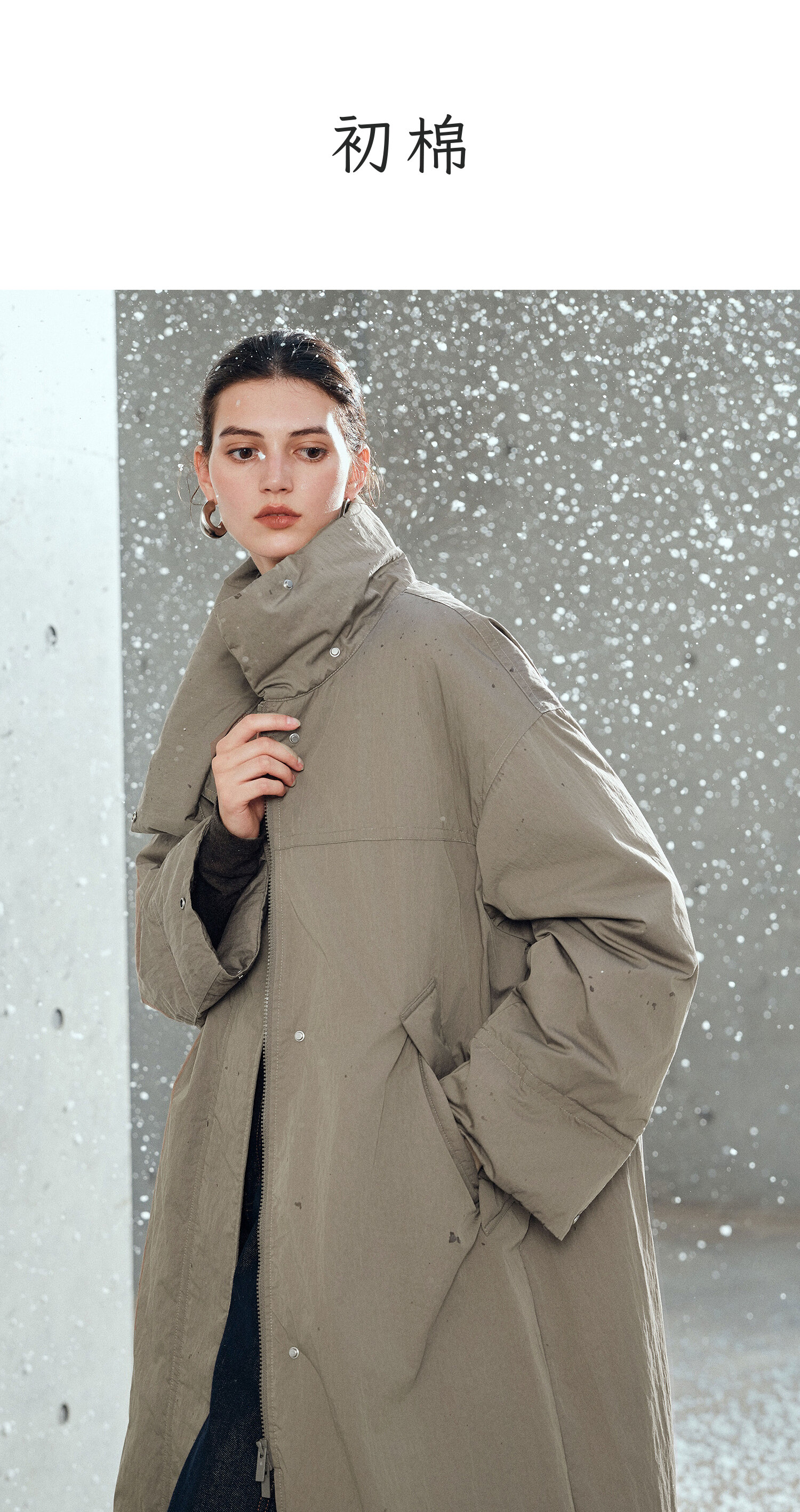 棉仓367615003-【90白鹅绒】立领风衣黑色羽绒服女中长款肌理感无绗线鹅绒服