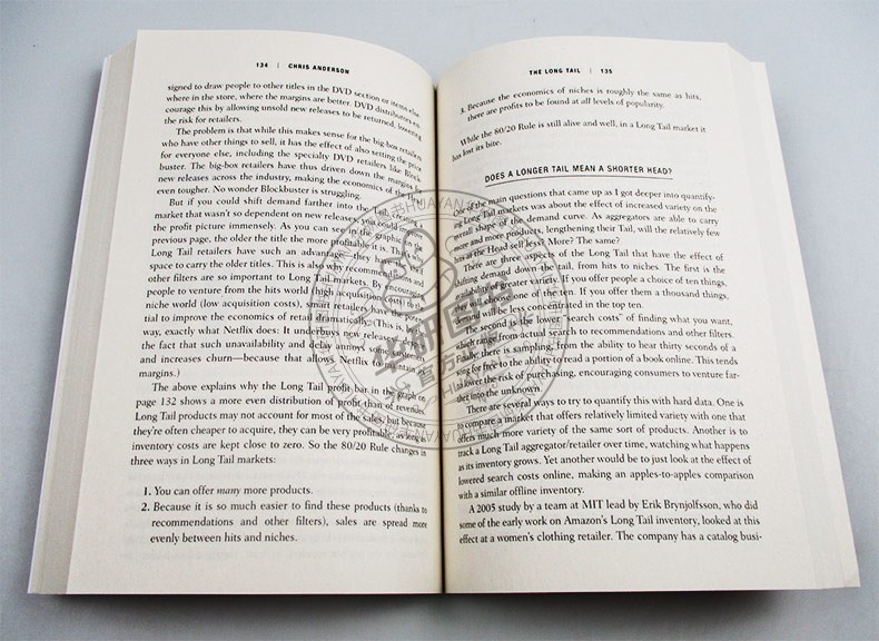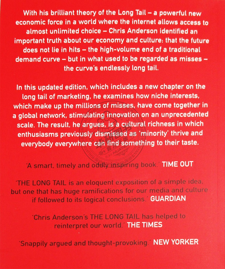 《长尾理论》书中阐述,商业和文化的未来不在于传统需求曲线上那个代表“畅销商品”(hits)的头部;而是那条代表“冷门商品”(misses)经常为人遗忘的长尾。举例来说,一家大型书店通常可摆放10万本书,但亚马逊网络书店的图书销售额中,有四分之一来自排名10万以后的书籍。这些“冷门”书籍的销售比例正以高速成长,预估未来可占整体书市的一半。
