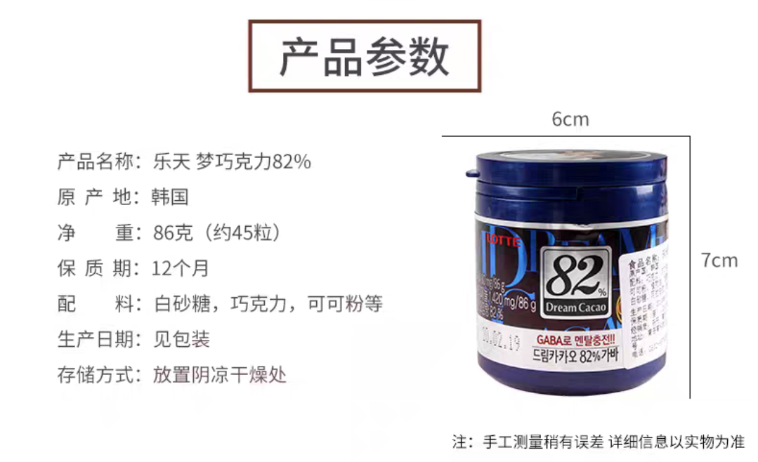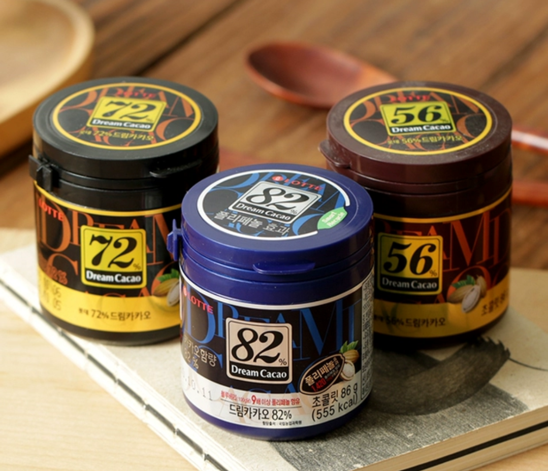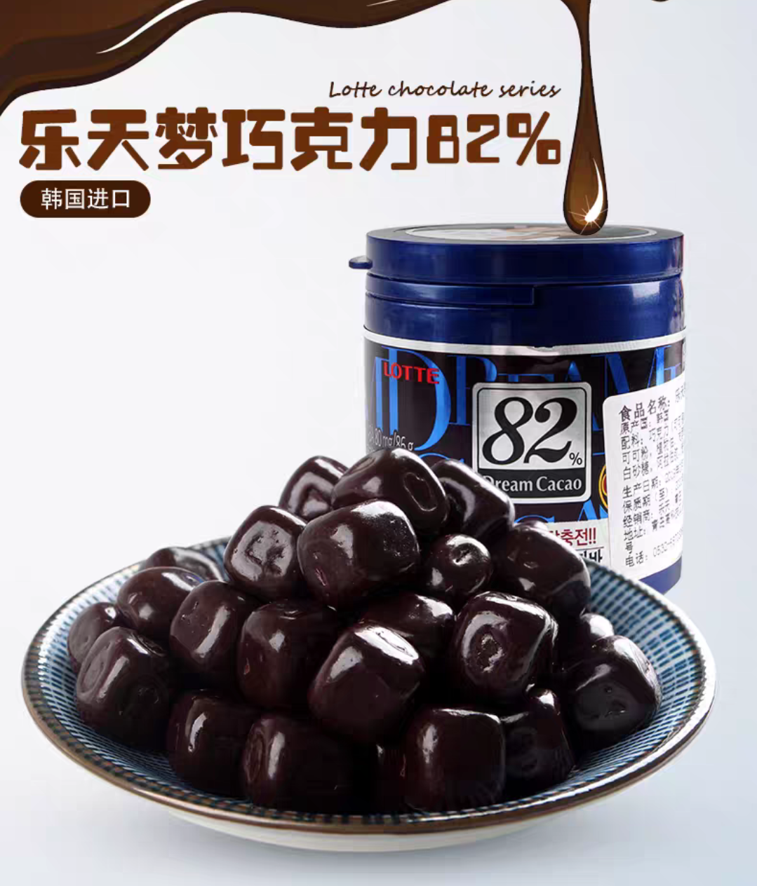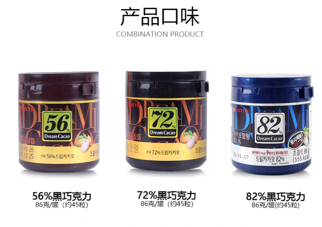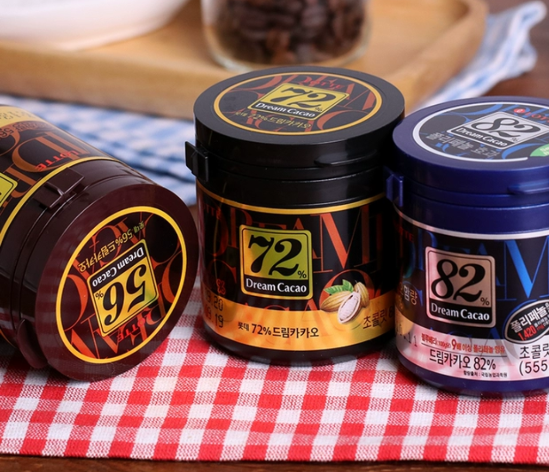 韩国乐天梦黑巧克力豆82%罐装儿童网红零食86g/盒