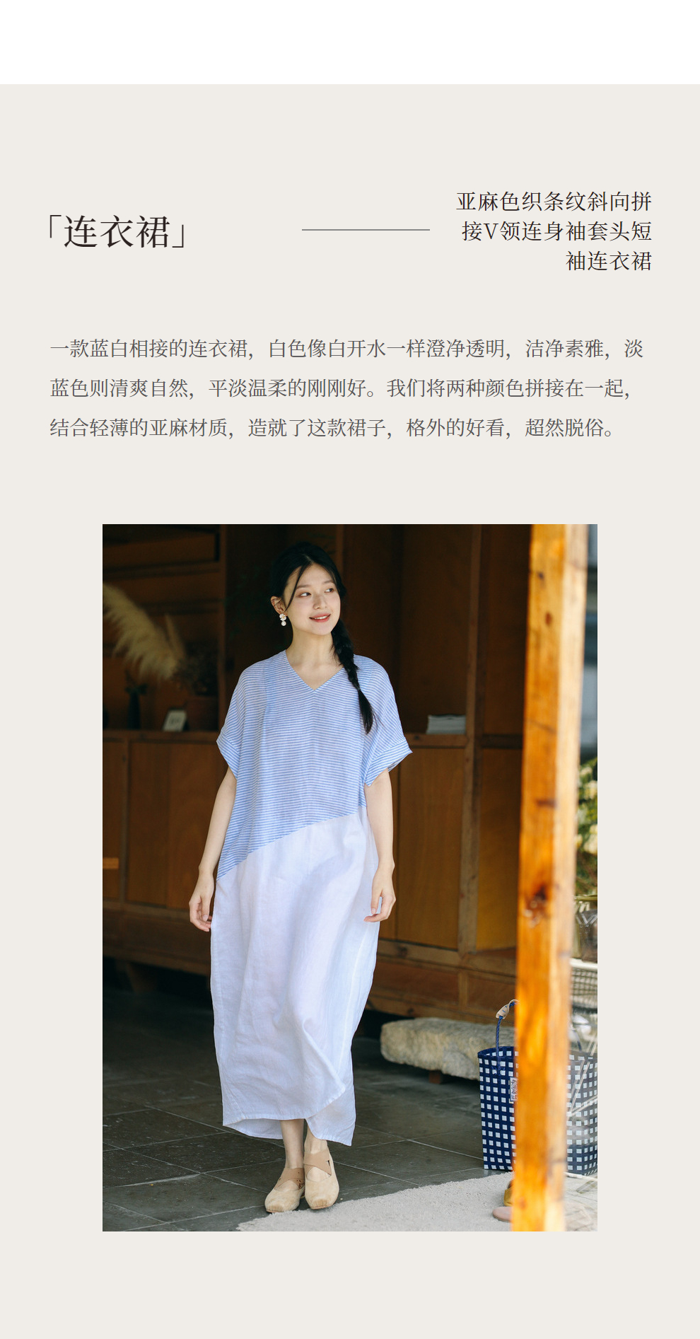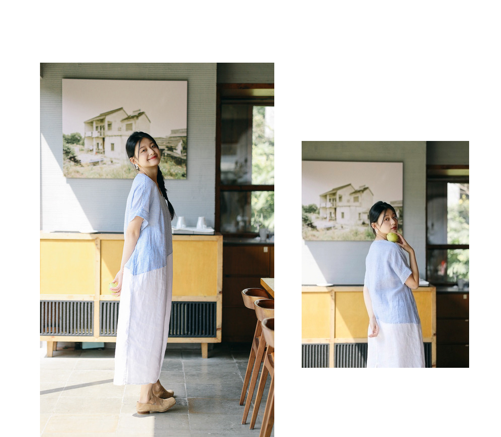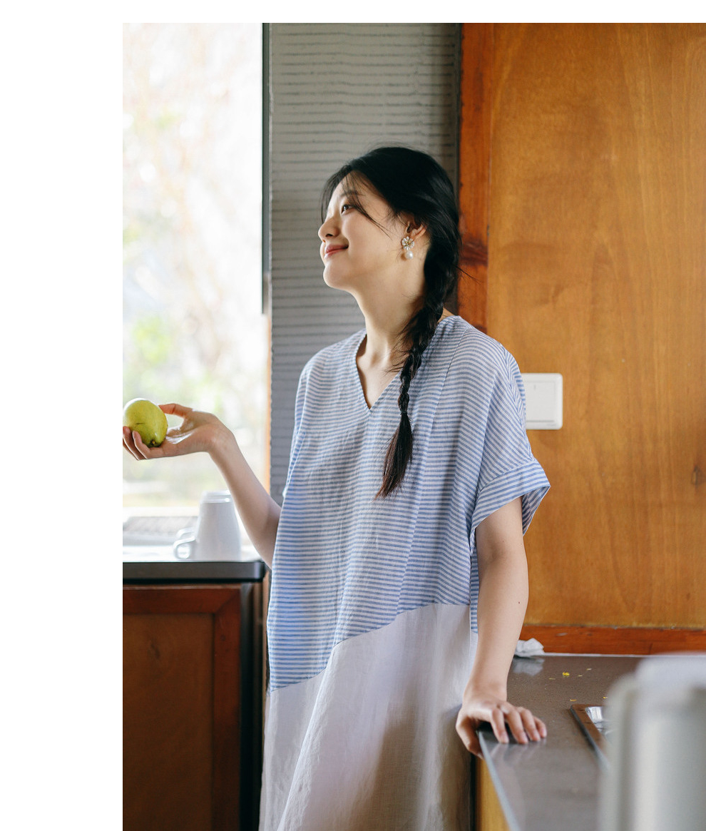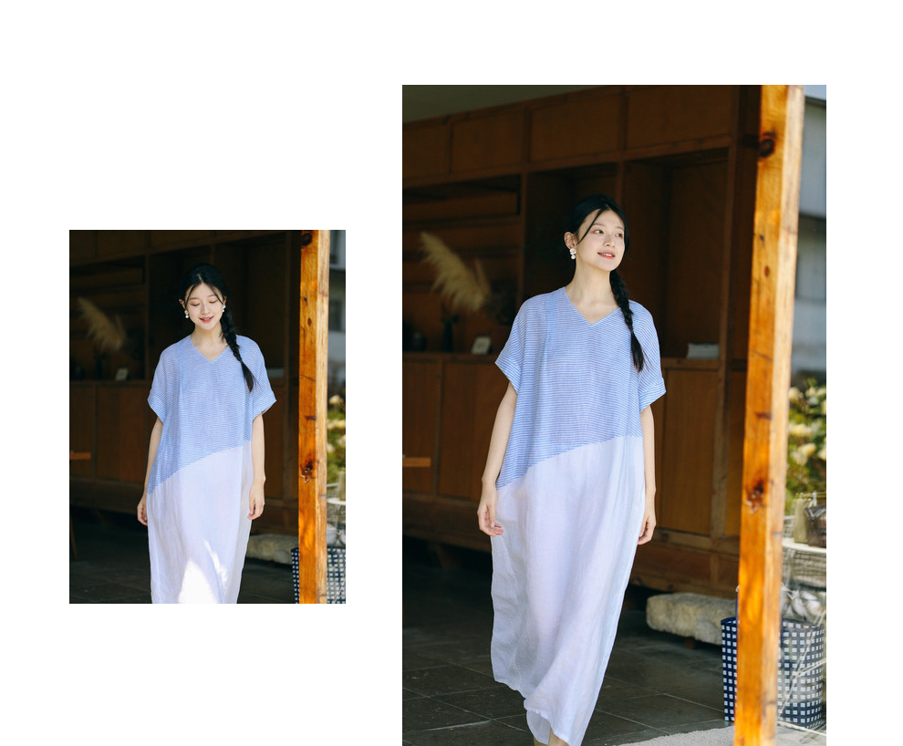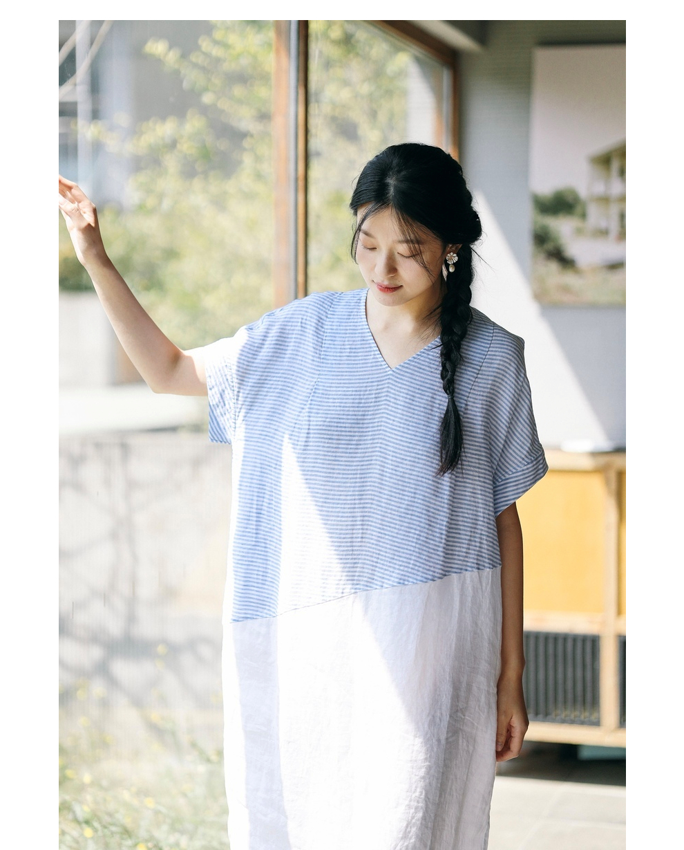 绽放231朵/亚麻色织条纹斜向蓝白拼接V领连身短袖套头休闲连衣裙