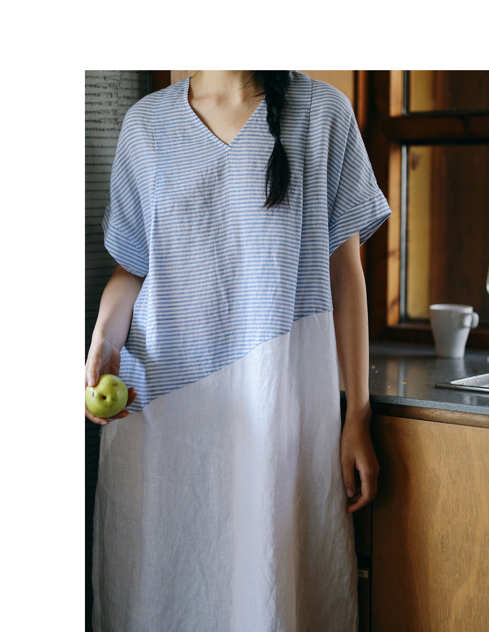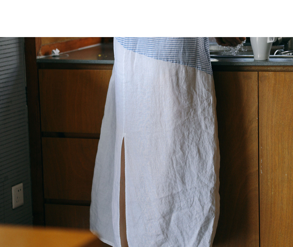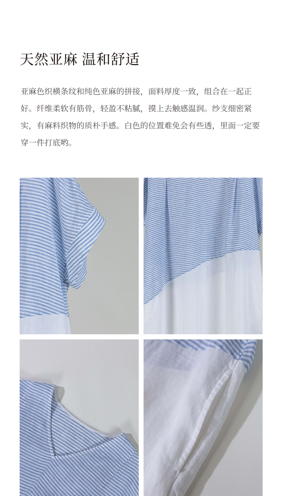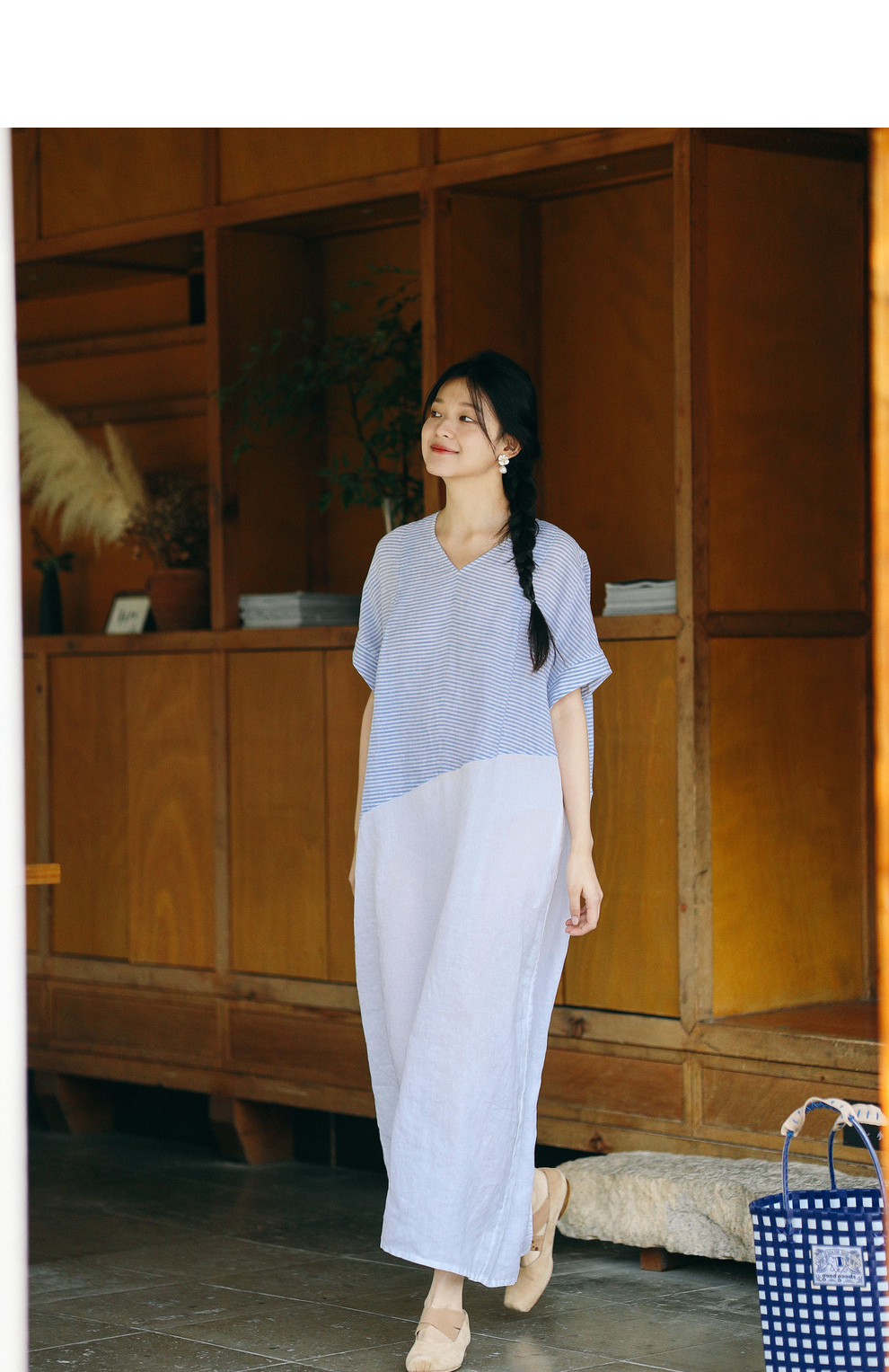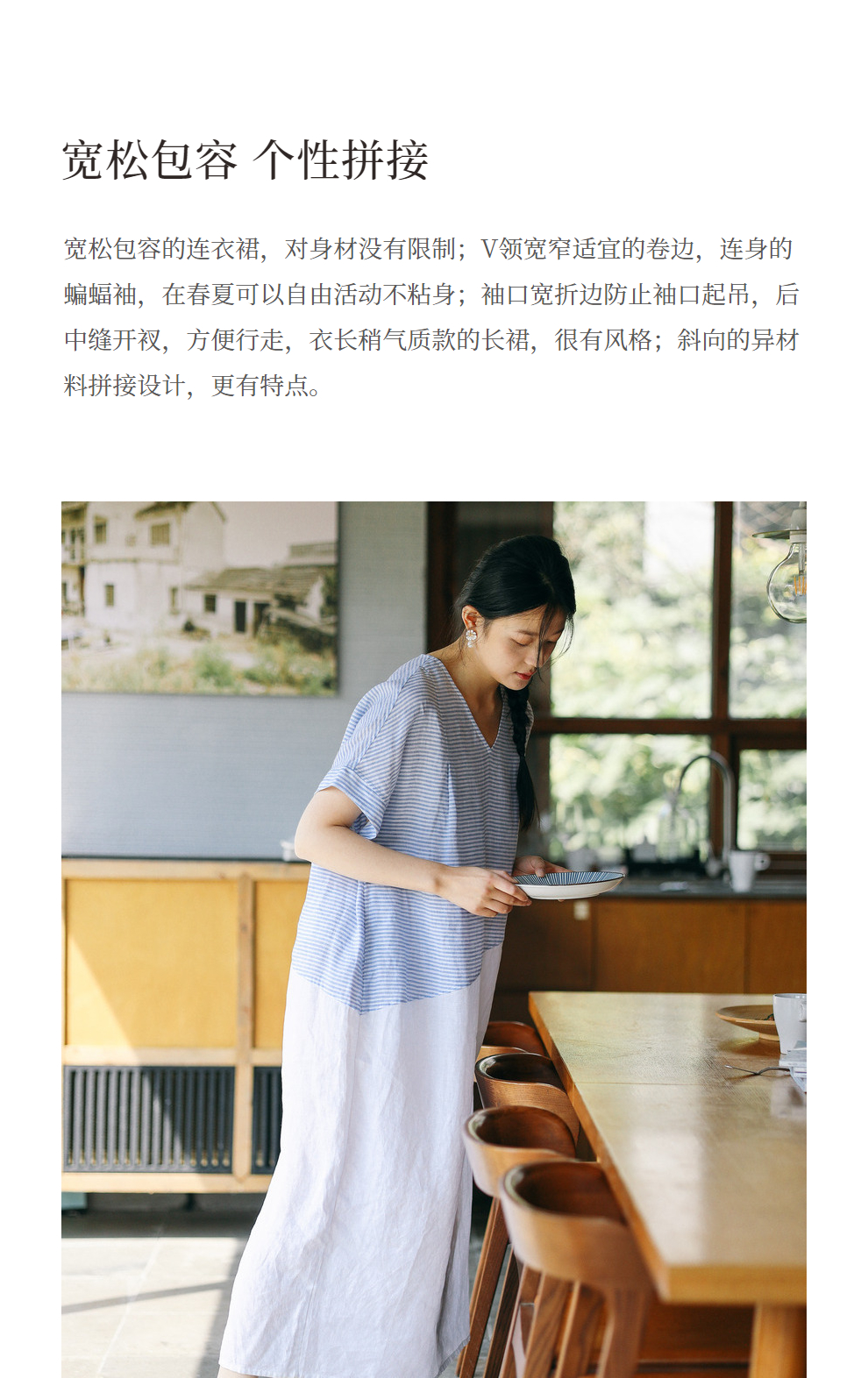绽放231朵/亚麻色织条纹斜向蓝白拼接V领连身短袖套头休闲连衣裙