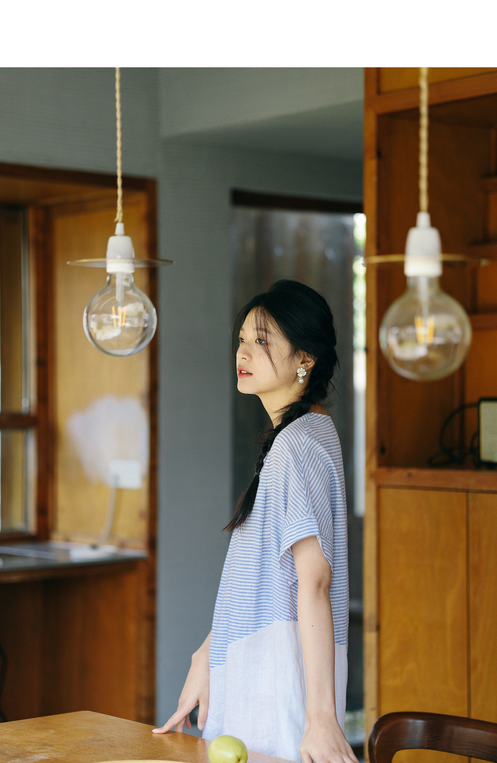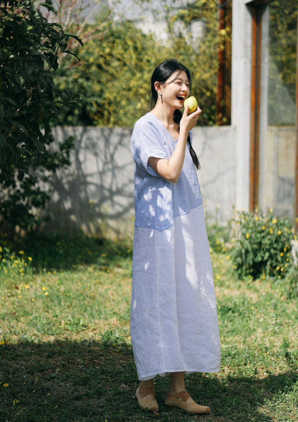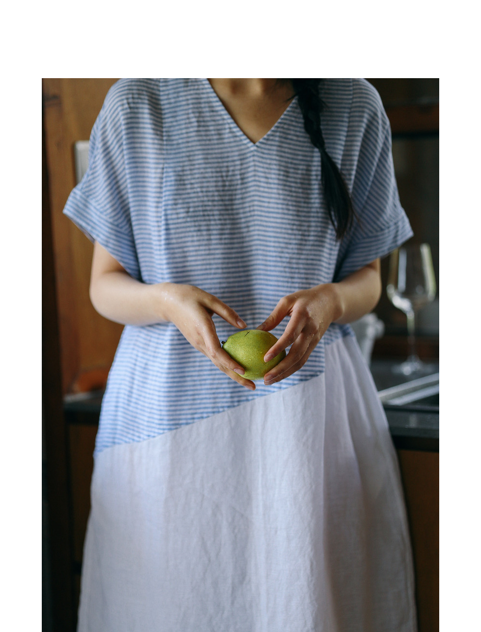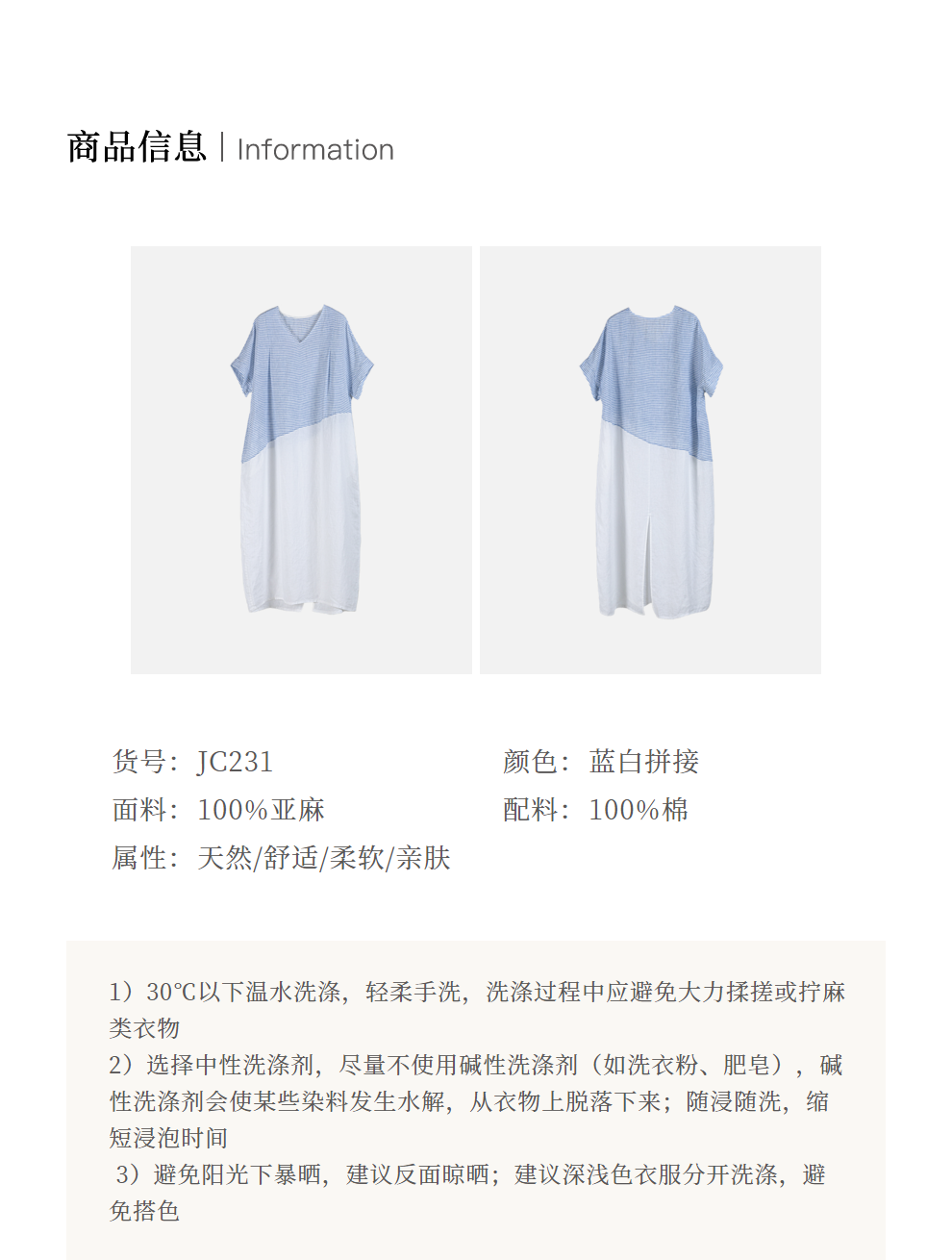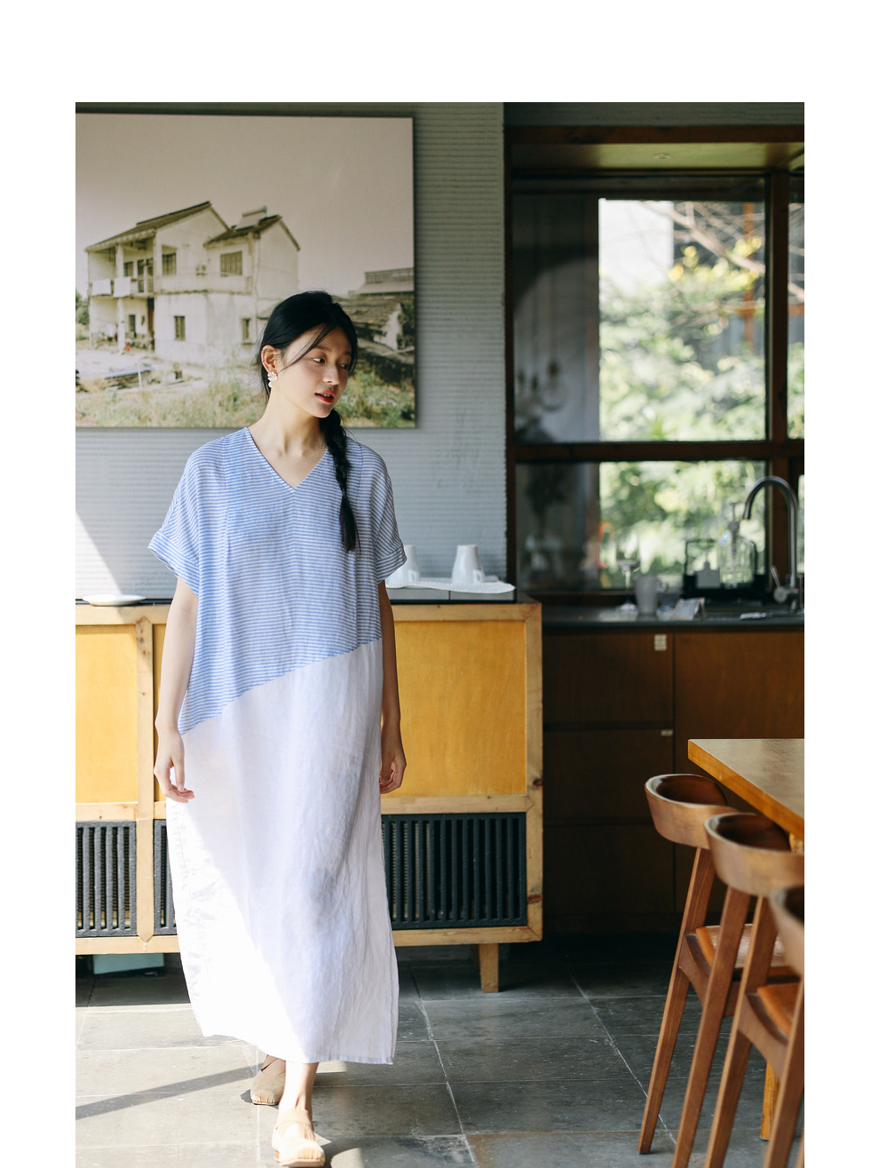 绽放231朵/亚麻色织条纹斜向蓝白拼接V领连身短袖套头休闲连衣裙