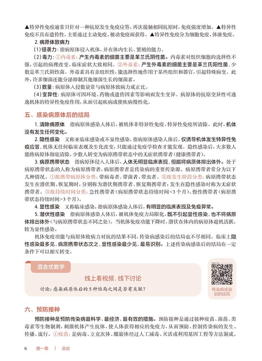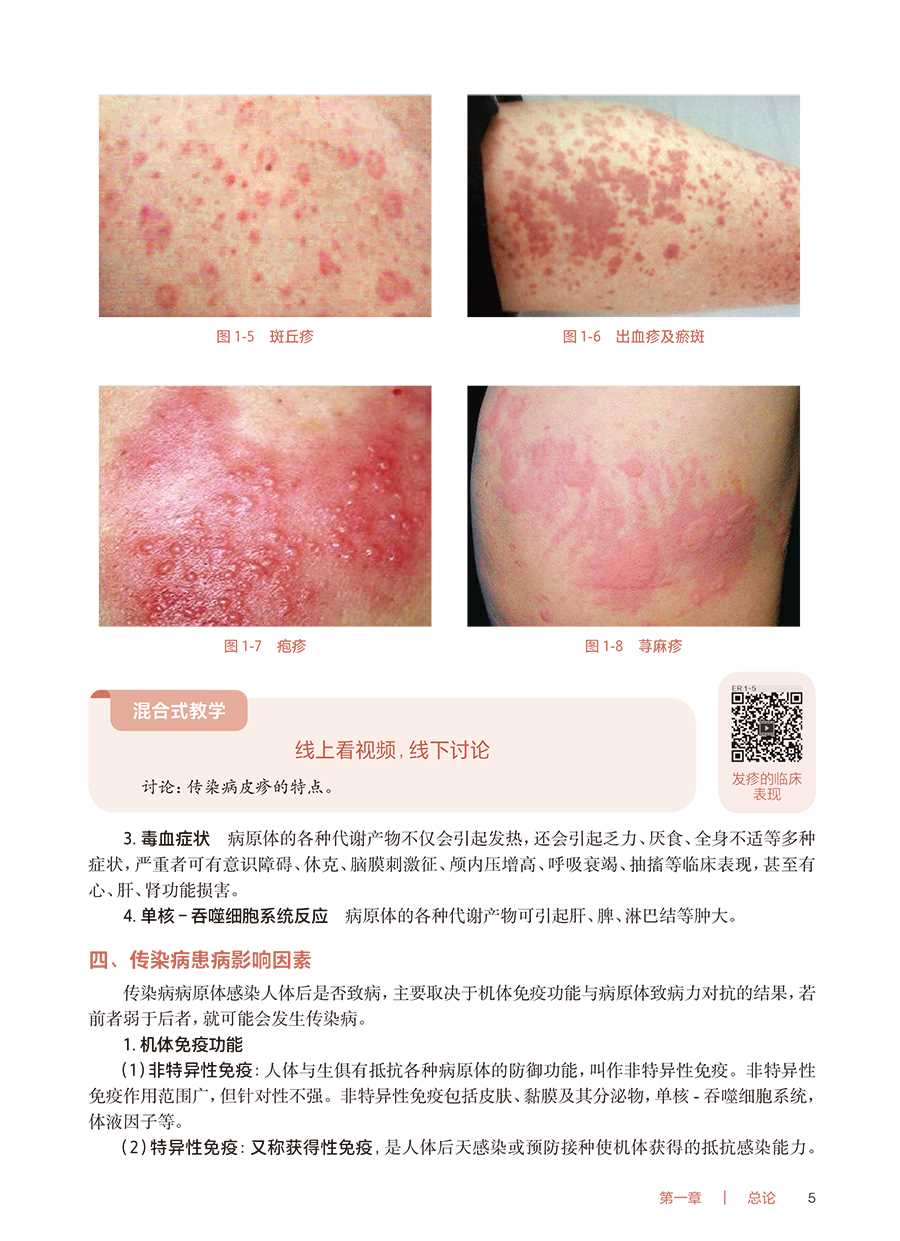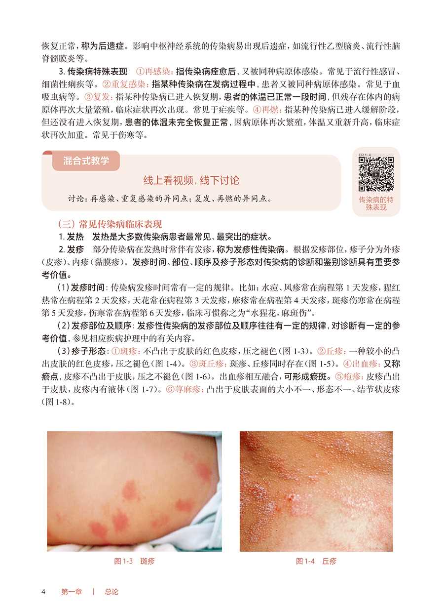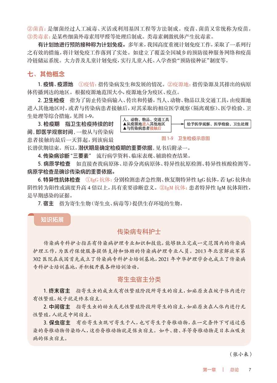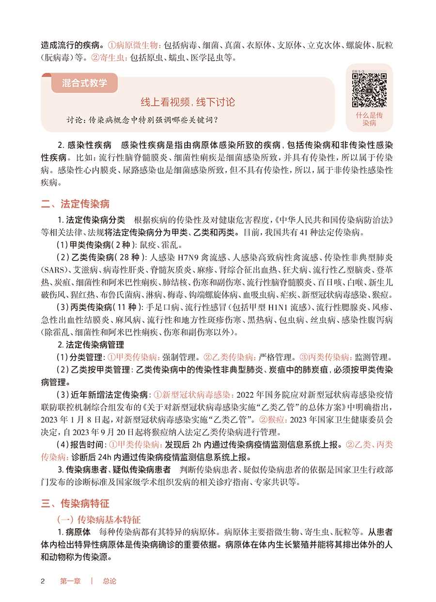 【前言】《传染病护理》第2 版获首届全国教材建设奖全国优秀教材二等奖,第1 版、第2 版先后入选;十二五;十四五职业教育国家规划教材。《传染病护理》(第3 版)传承第1 版、第2 版教材精髓,精简了与《基础护理学》《内科护理学》重叠的内容,突出了育人理念及传染病护理教学特色。1.坚持正确的政治方向 本教材全面落实党的二十大精神进教材相关要求,始终贯穿马克思主义立场、观点、方法,体现习近平新时代中国特色社会主义思想。从;课程目标到每个教学环节,从教学内容到;心灵启迪,将知识、技能、职业素养、职业道德、救死扶伤、立德树人等融为一体。2.以;政策法规;权威诊疗指南作为编写依据 传染病疫情瞬息万变,传染病防治策略在不断更新。《传染病护理》(第3 版)紧扣国家最新政策法规、权威诊疗指南进行修订编写,注重体现高职专科护理教材的职业性、先进性。3.以;传播途径作为分类依据 不同病原体的传染病可以有共同的传播途径,采取的隔离、防护措施相同。《传染病护理》(第3 版)教材打破了传统的;以病原体作为分类依据的思维,根据传染病护理工作特点,以传播途径作为分类依据,使学生掌握某种传播途径的隔离、防护措施后,即可举一反三地应用,做到不论何种传染病,只要知晓传播途径即可实施正确的隔离、防护措施,及时有效地避免传染病的传播。4.以;工作手册为载体 《传染病护理》(第3 版)教材选取了4 个;代表性疾病,以;工作手册式形式、真实临床案例、典型护理工作任务组织编写,一步一步指导学生完成临床护理任务,如填写;入院护理评估单;医嘱单;护理记录单等护理文件,同时配套介绍相关知识、技能、职业素养等,将临床护理工作与职业教育有机融合。本教材中涉及的;入院护理评估单;医嘱单;护理记录单等,因各家医院不尽相同,故仅供教学参考,其中患者姓名、医务人员签名均为化名。5.以;岗位需求为己任 传染病预防、传染病疫情监测及控制、传染病疫点及疫区消毒等工作都与社区护理工作息息相关,社区护理岗位是高职专科护理专业学生就业的主要岗位,所以《传染病护理》(第3 版)教材通过;社区护理轶事栏目、;混合式教学讨论等形式,将传染病护理知识与社区护理工作相连接。根据传染病有较强的地域特点,本教材不仅介绍了全国护士执业资格考试大纲中涉及的传染病,还将近几年国家疾病预防控制局发布的;全国法定传染病疫情概况中的发病率较高的传染病纳入教材,以正文或;知识拓展形式进行介绍。此外,本教材中;▲用于区分不同的内容。本教材修订过程中,得到了全体编者及行业专家的大力支持,特别是首都医科大学附属北京地坛医院WHO 合作中心办公室主任、首都医科大学附属北京地坛医院;红丝带之家秘书长韩晶,对本教材提出了许多中肯的意见和建议;中南大学湘雅医院护理部副主任袁素娥教授、北京地坛医院林兆霞主任、新疆医科大学第一附属医院林栋羚护士长、合肥市传染病医院路宏护士长为本教材提供了大量最新临床进展信息,为使本教材处于较高的专业水平作出了贡献,在此一并表示诚挚的感谢!《传染病护理》(第3 版)教材主要供高职专科护理、助产专业学生学习使用,也可供临床护理人员学习参考。由于时间仓促及编写人员的水平有限,不妥之处在所难免,敬请不吝赐教,予以指正。张小来2024 年12 月