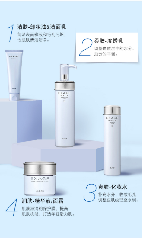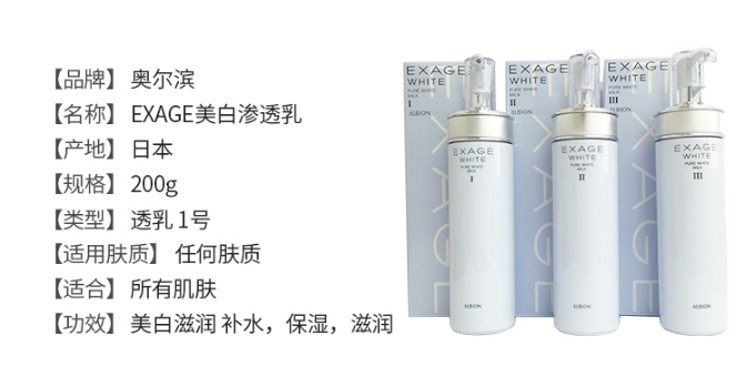 日本Albion澳尔滨EXAGE清新莹白焕白美白渗透乳液200g 1号清爽2号保湿3号滋润