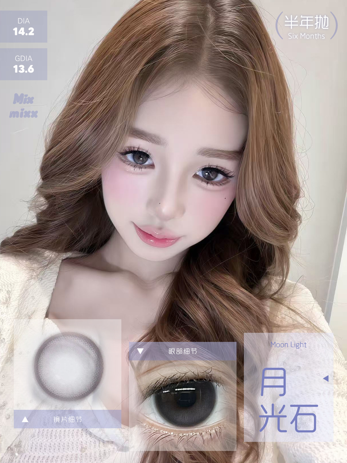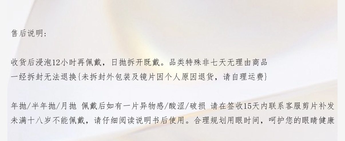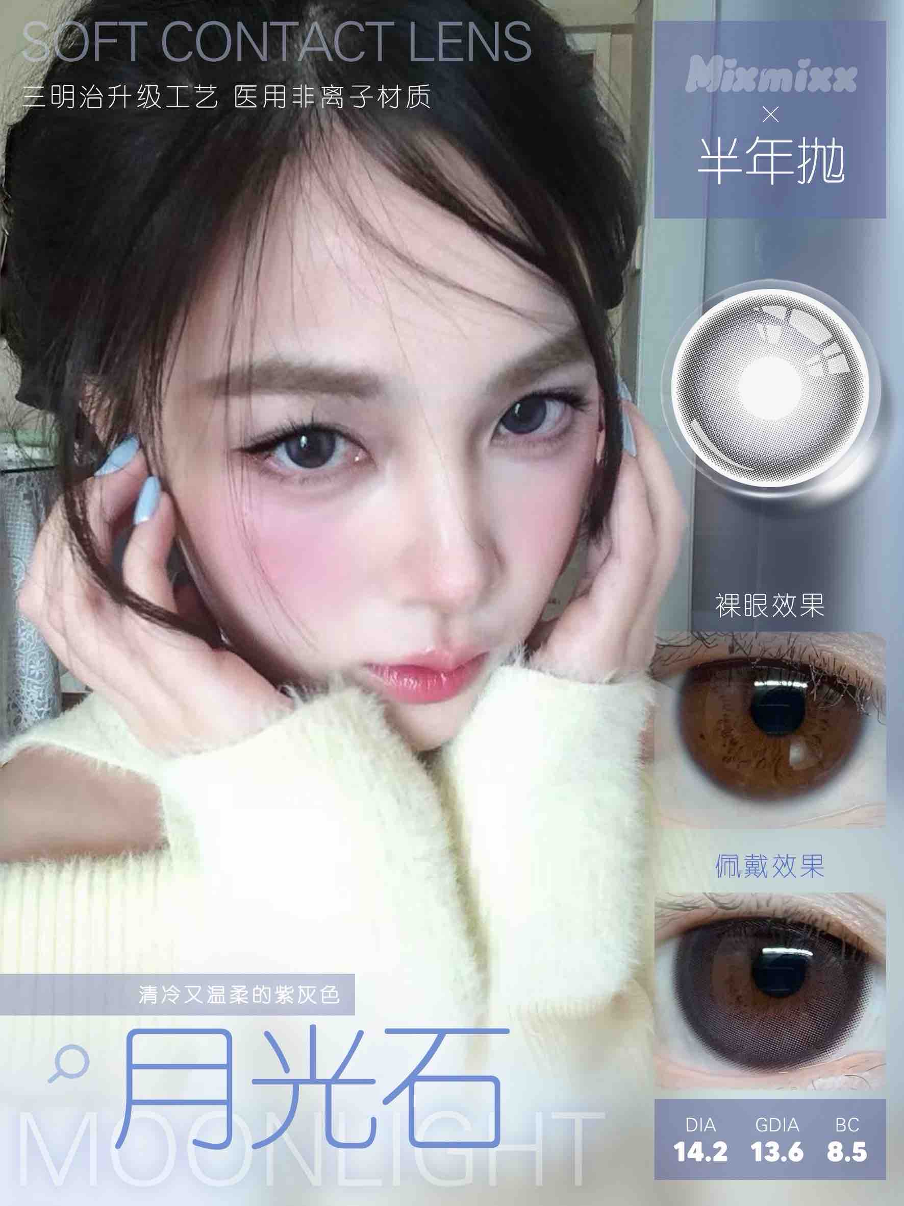 标注直径:14.2mm着色直径:13.4mm含水量:38%佩戴期限:半年型(建议6个月)可配:0-1000度(有525/575 )