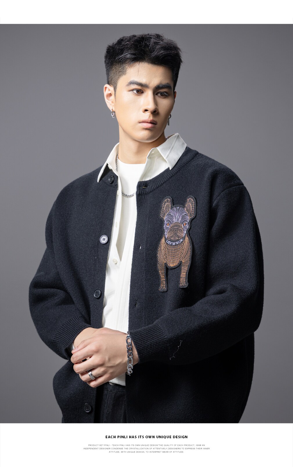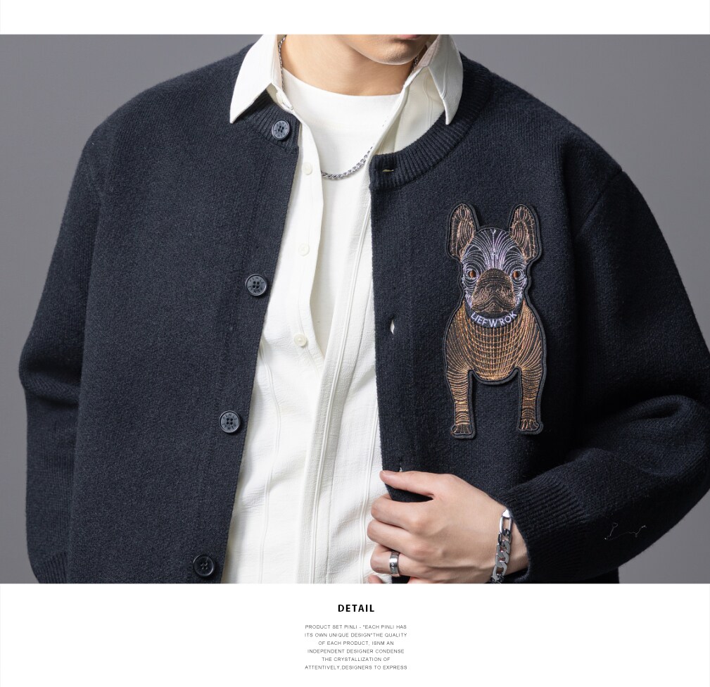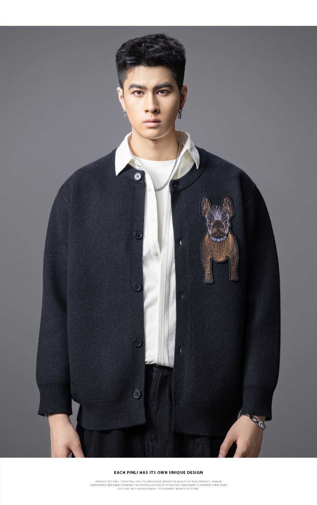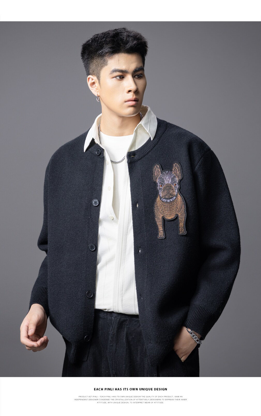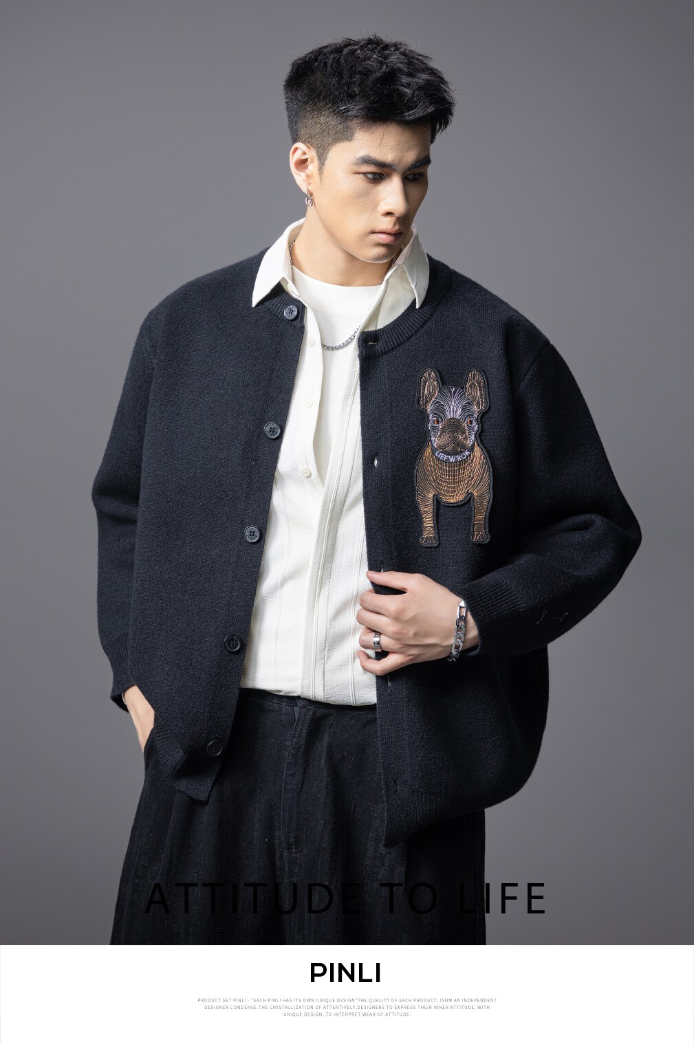 PINLI品立2025秋季新款小狗圆领开衫毛衣男士潮牌休闲针织衫外套BG253110002