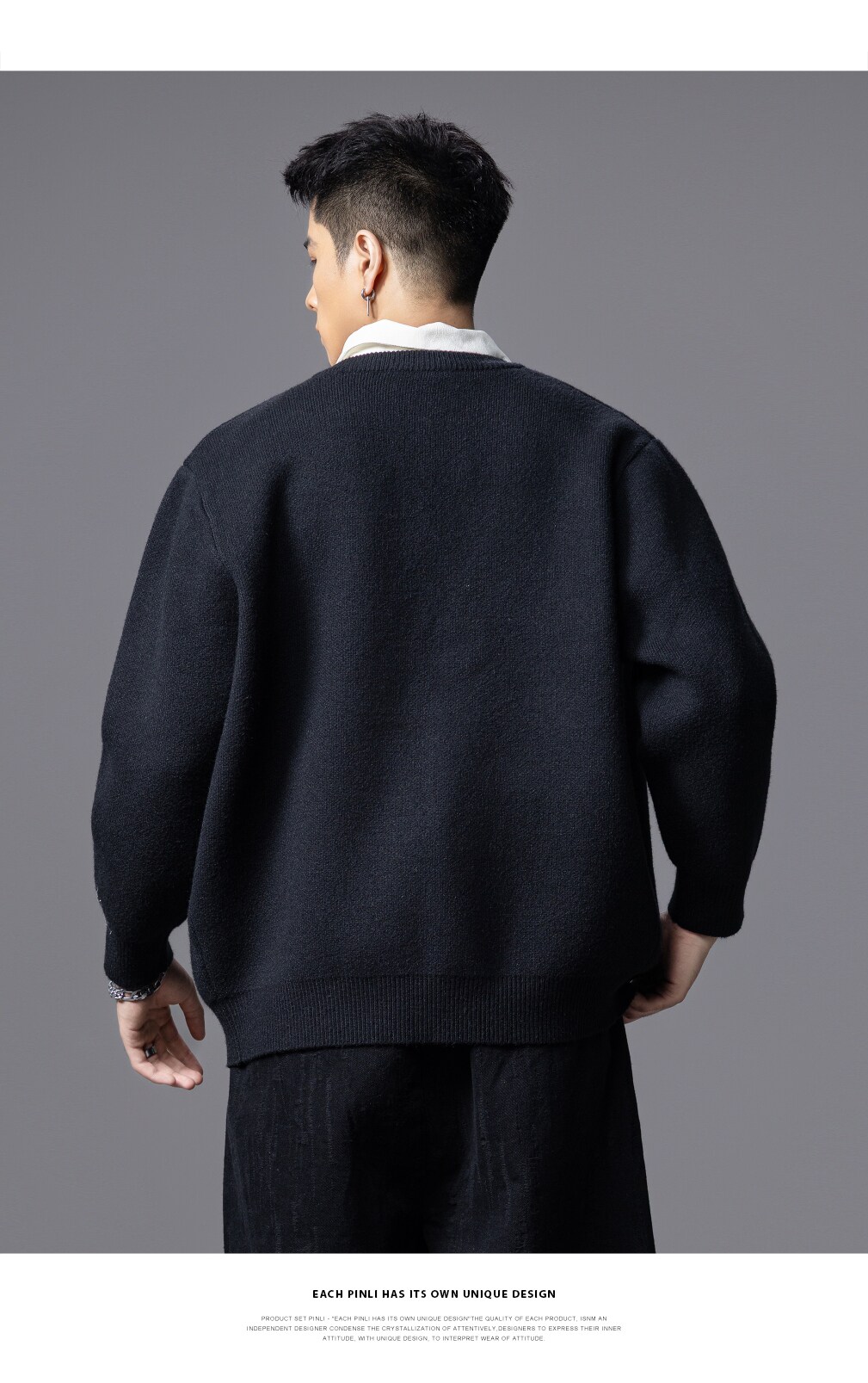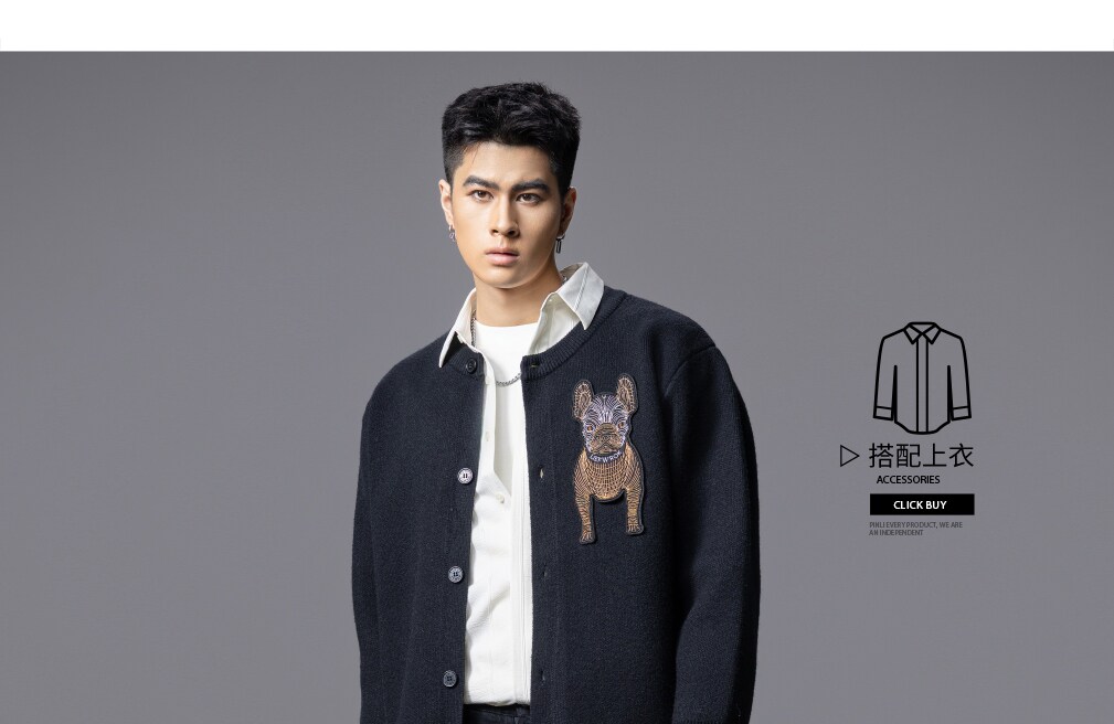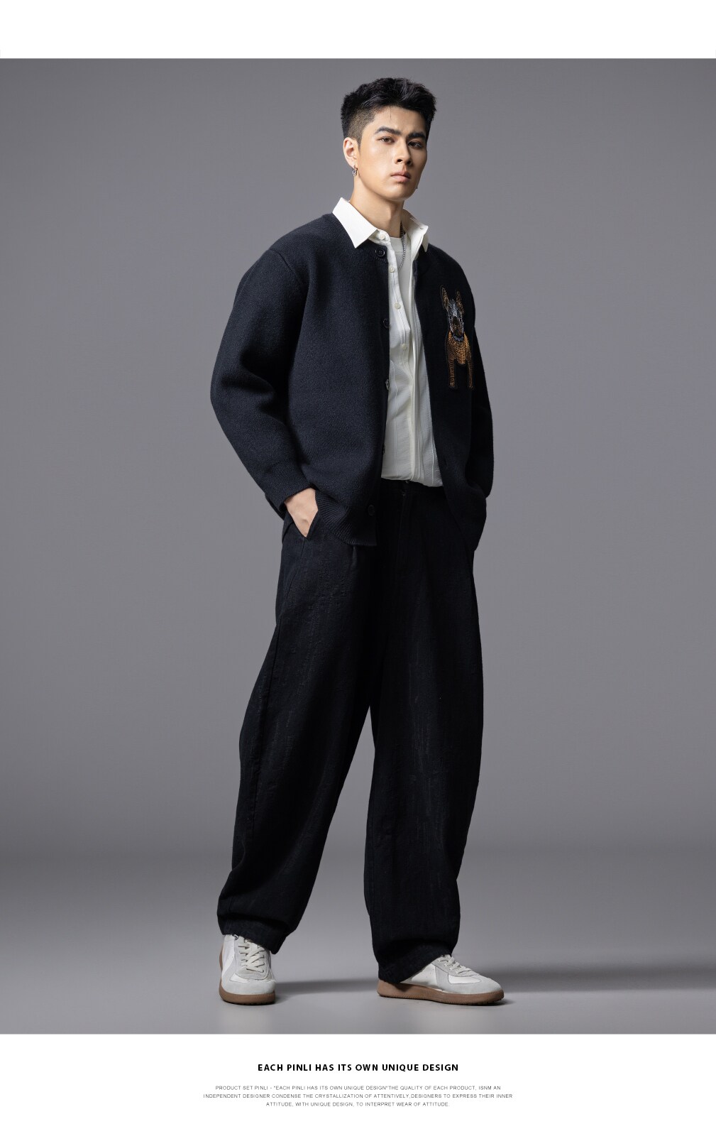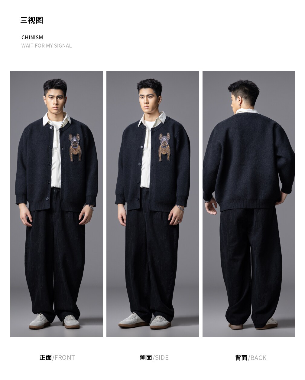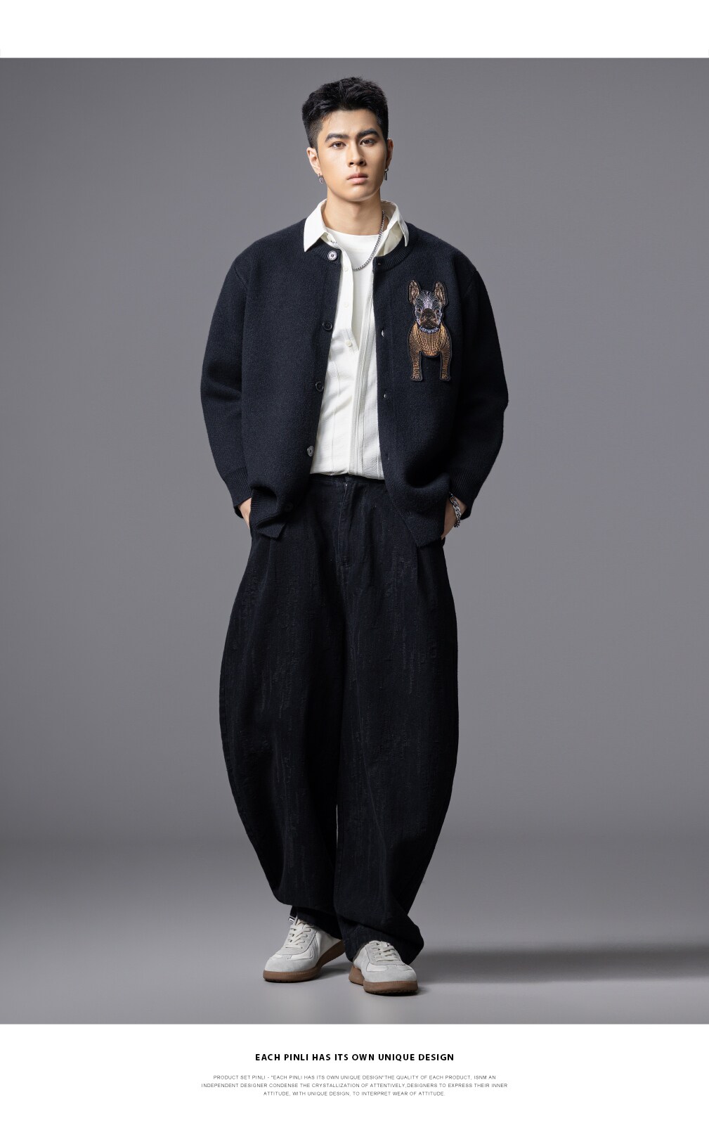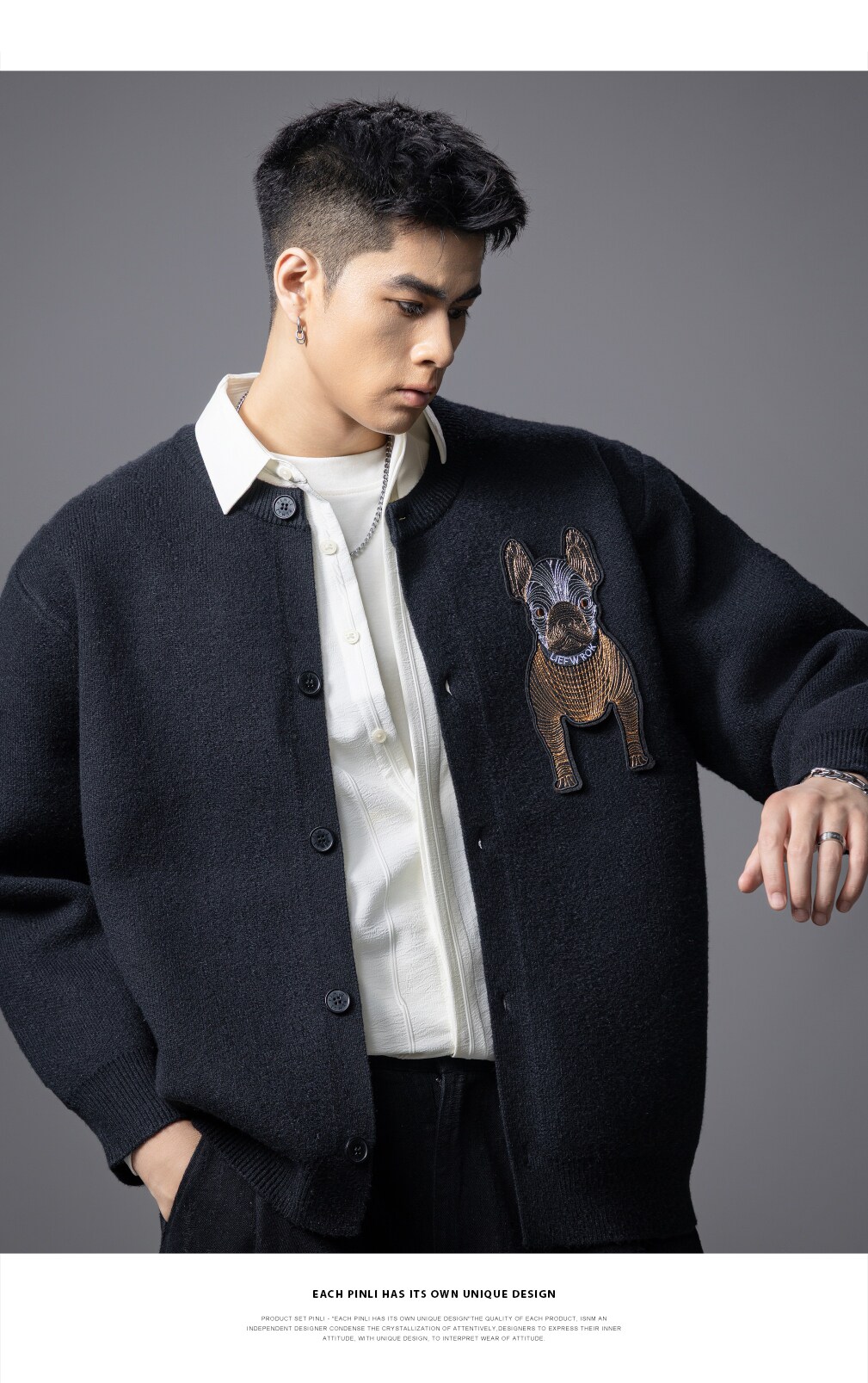 PINLI品立2025秋季新款小狗圆领开衫毛衣男士潮牌休闲针织衫外套BG253110002