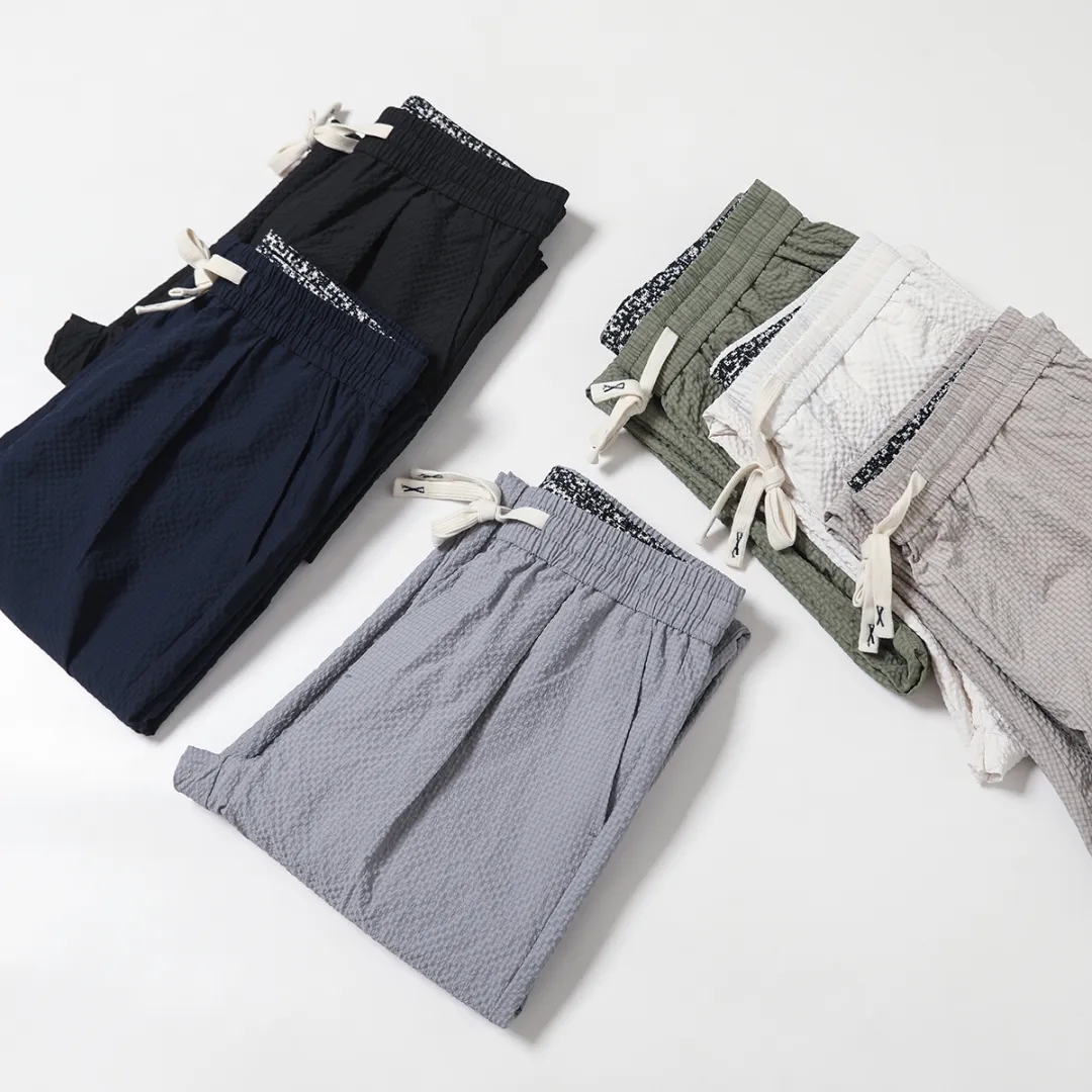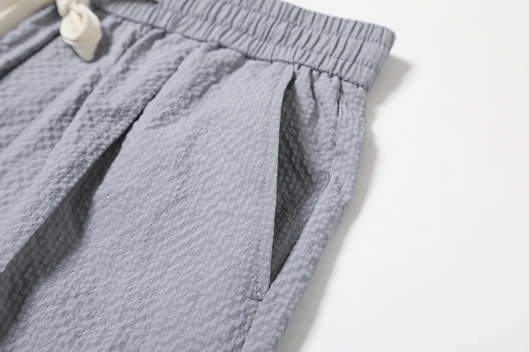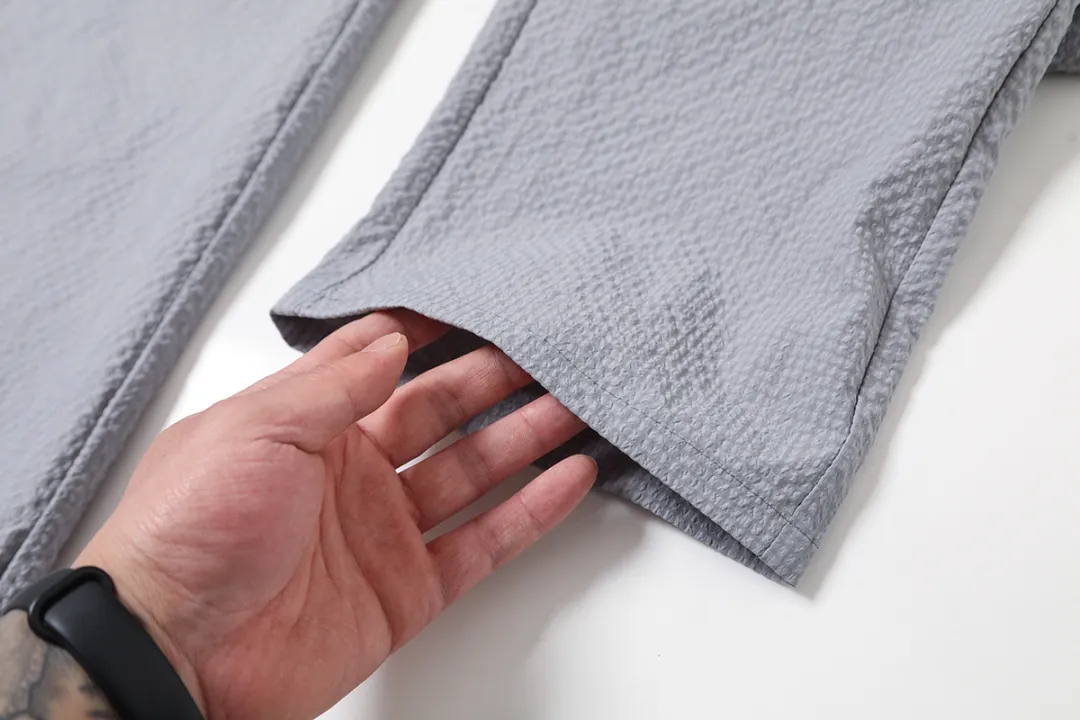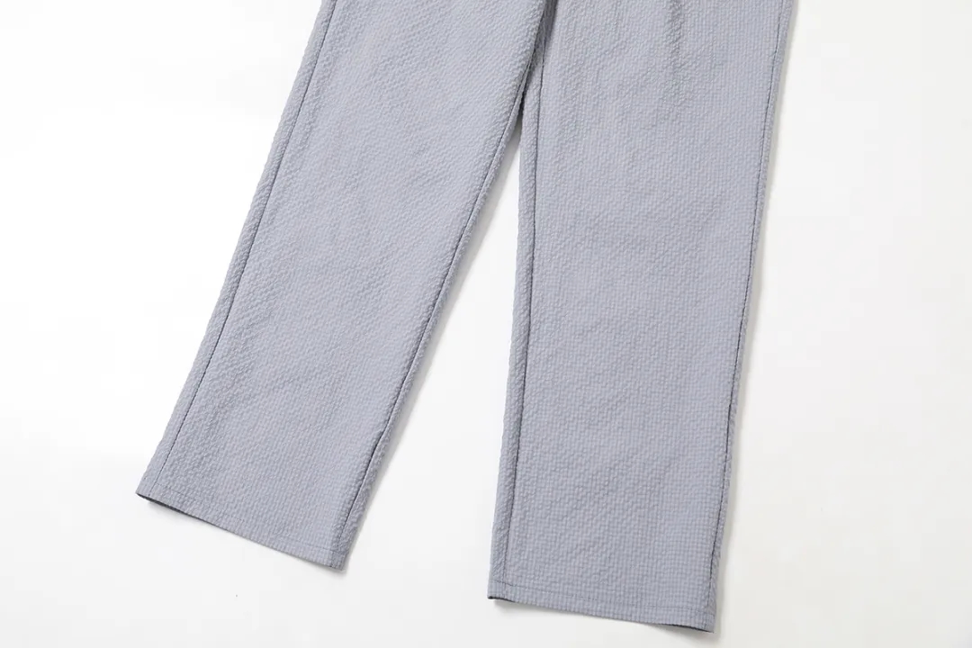 满满的质感!看到这个面料真的就想介绍两句!!泡泡纱,设计感很强!看似普普通通的,实际上不管是面料还是上身效果都超出想象!面料很棒很棒,凉爽,透气,舒适,速干。夏季穿起来那种凉凉的感觉别提有多舒服了!!你如果也喜欢这样舒适感的料子,直接闭眼入就对了。。。轻薄,同时还有很好的骨架感!上身挺括,能支撑起版型,上身更加有型,帅气。裤型属于偏宽松的版型,典型的日系风格,有点慵懒风的感觉!!搭配个宽松的T,那感觉不就来了吗!!休闲,好看,又百搭。