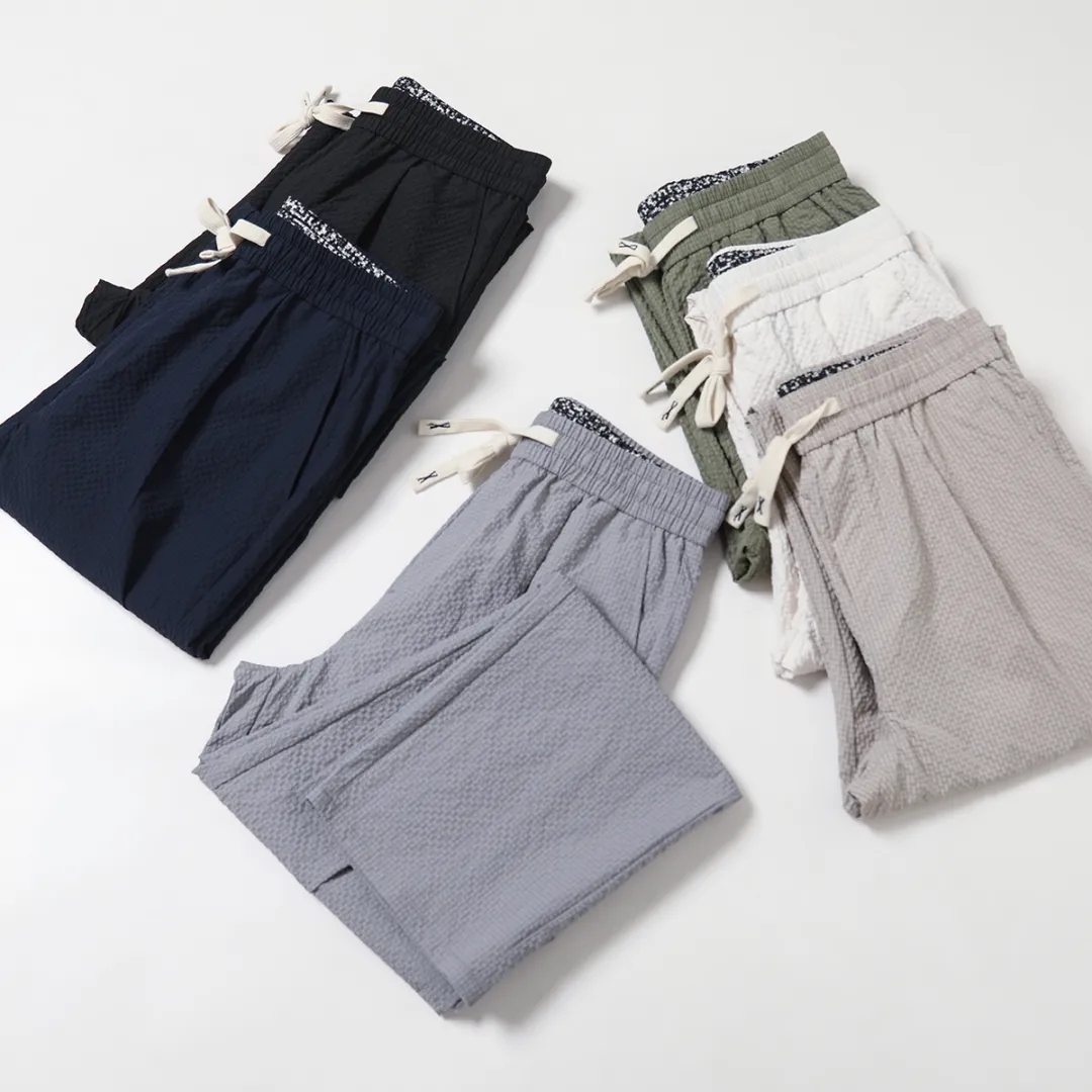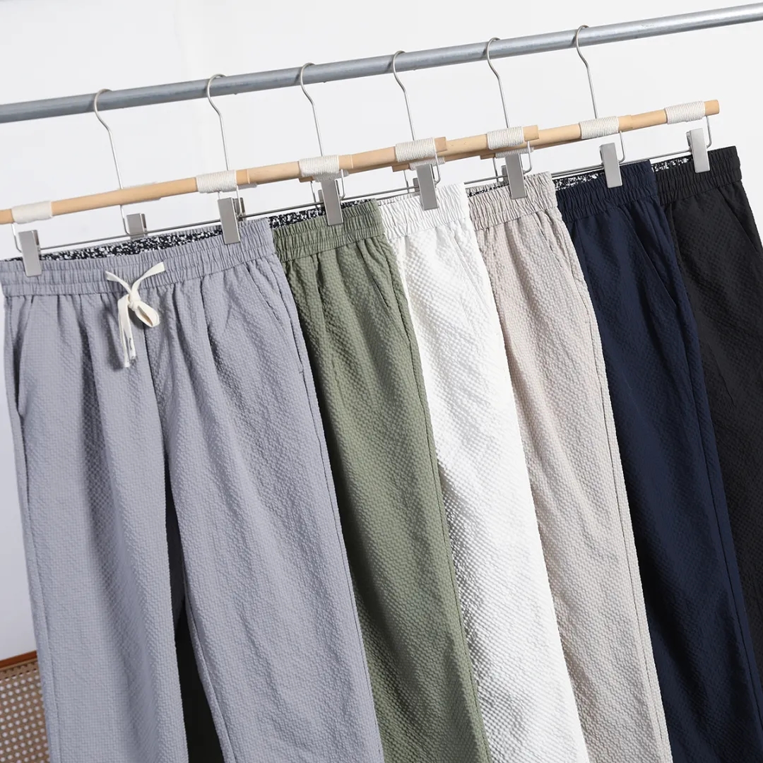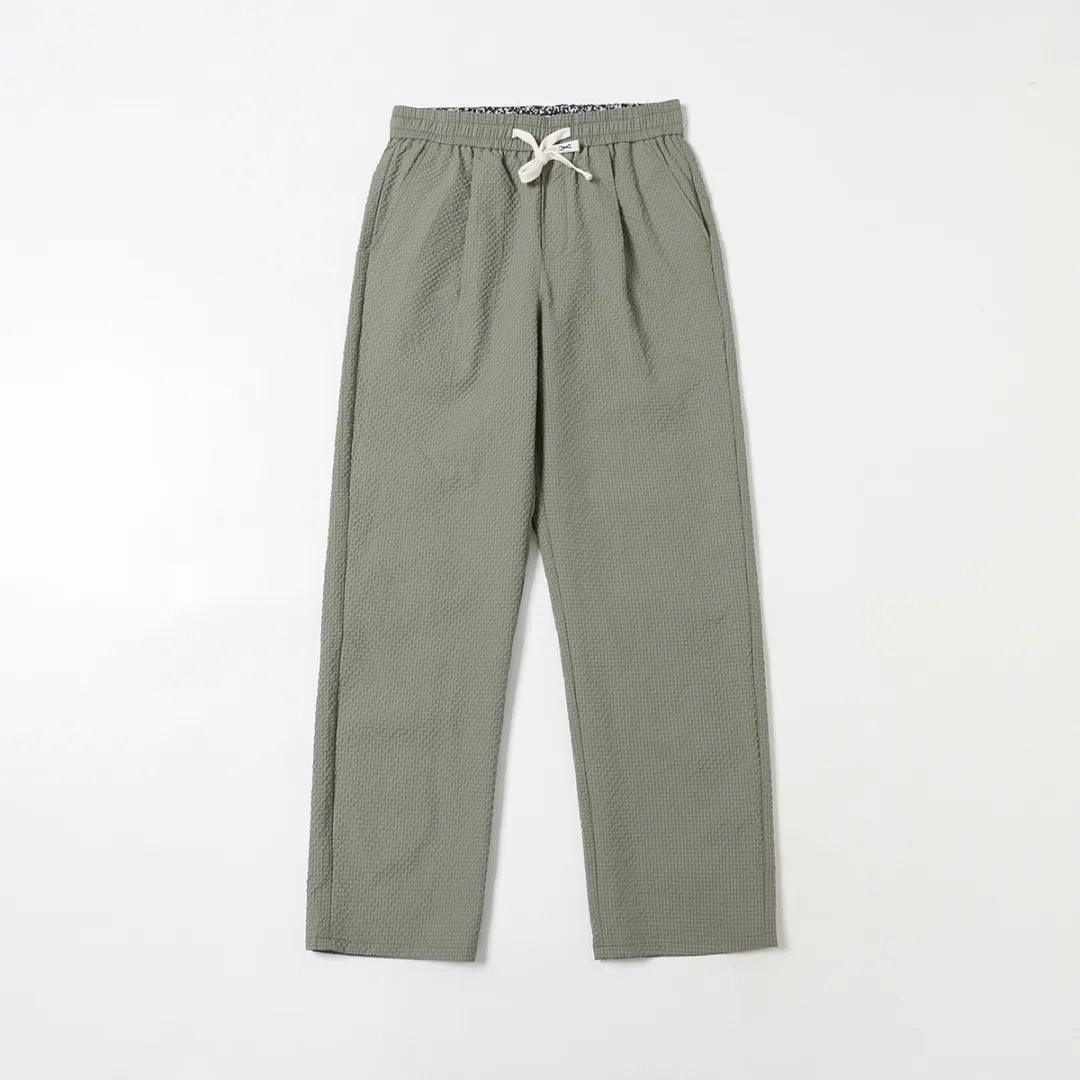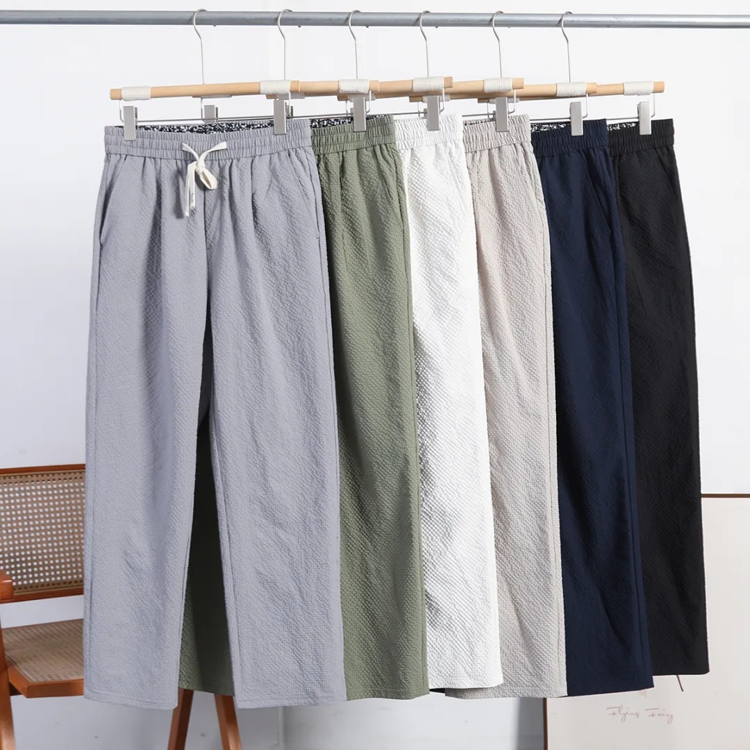 满满的质感!看到这个面料真的就想介绍两句!!泡泡纱,设计感很强!看似普普通通的,实际上不管是面料还是上身效果都超出想象!面料很棒很棒,凉爽,透气,舒适,速干。夏季穿起来那种凉凉的感觉别提有多舒服了!!你如果也喜欢这样舒适感的料子,直接闭眼入就对了。。。轻薄,同时还有很好的骨架感!上身挺括,能支撑起版型,上身更加有型,帅气。裤型属于偏宽松的版型,典型的日系风格,有点慵懒风的感觉!!搭配个宽松的T,那感觉不就来了吗!!休闲,好看,又百搭。