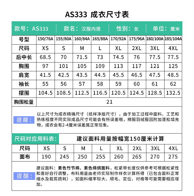 裁缝学苑AS333太极服里衣汉服练功打底衫纸样中衣改良内搭打版裁剪样板