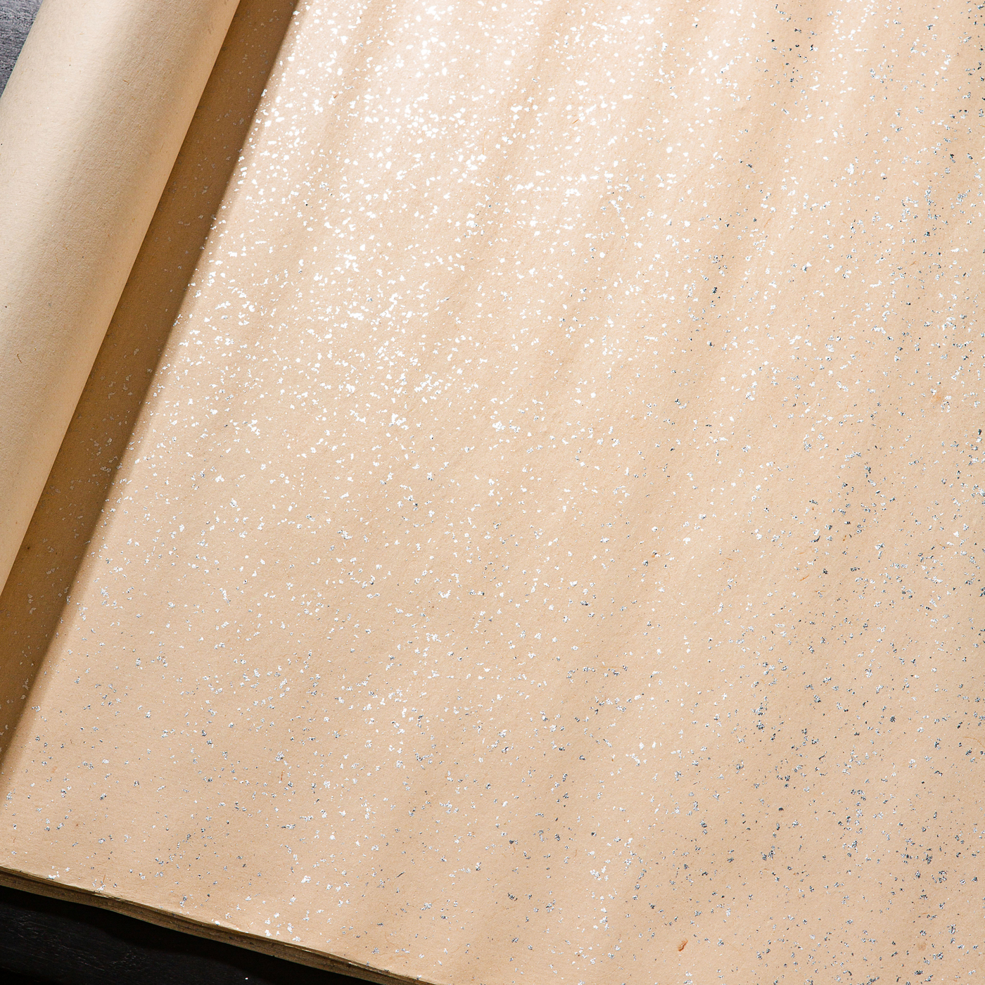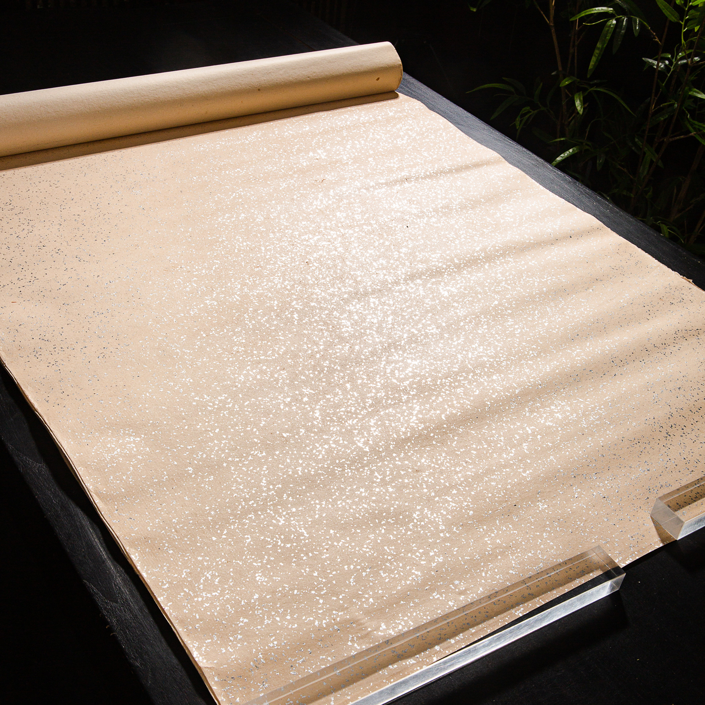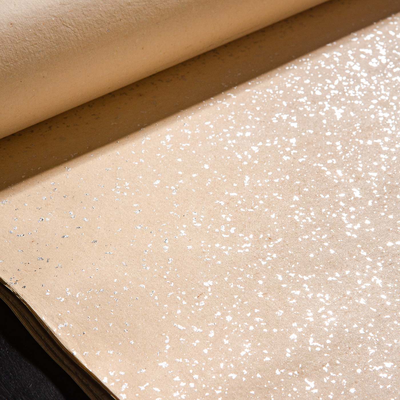 70年代上海工艺品进出口公司监制“四尺银金片金笺”,原装一卷25张。此纸古法精制,纸张质地精良,颜色古朴雅致,洒鱼籽银光芒耀眼,是难得之好纸。