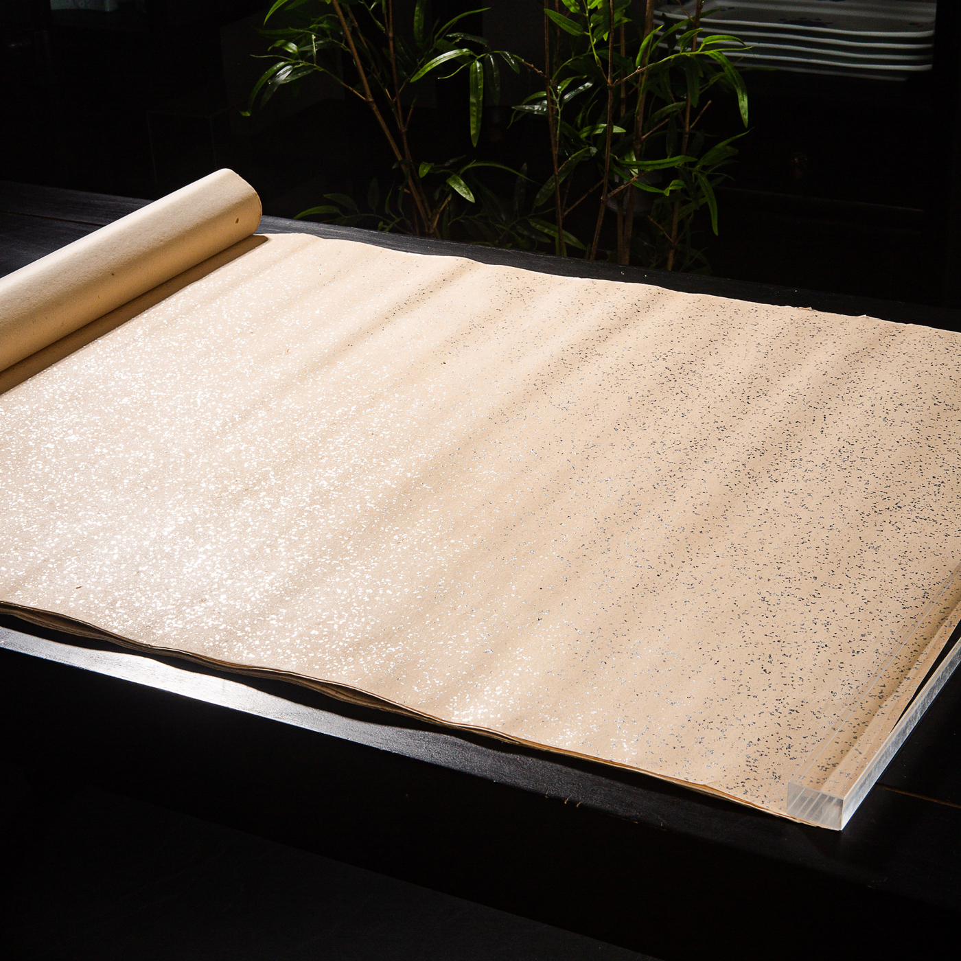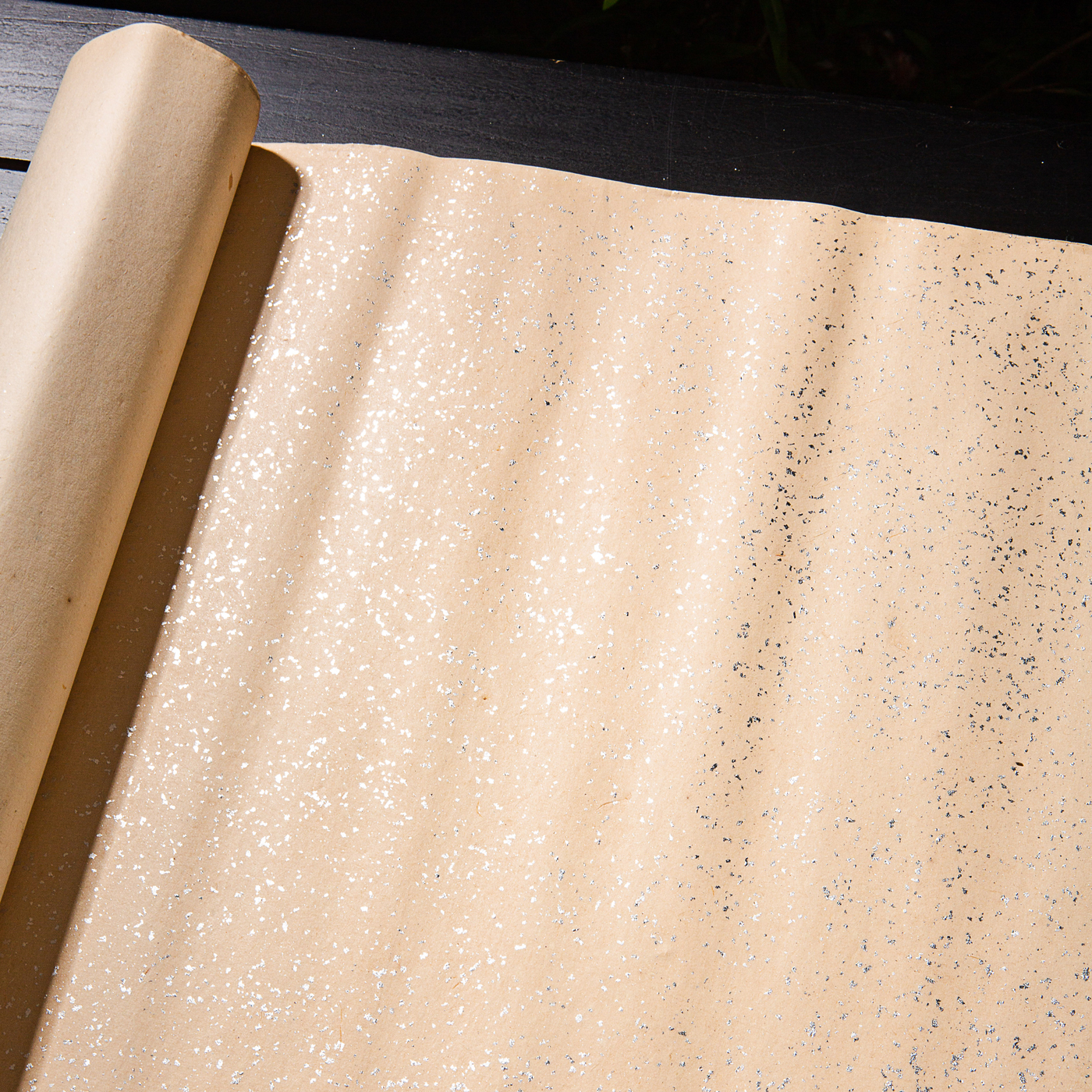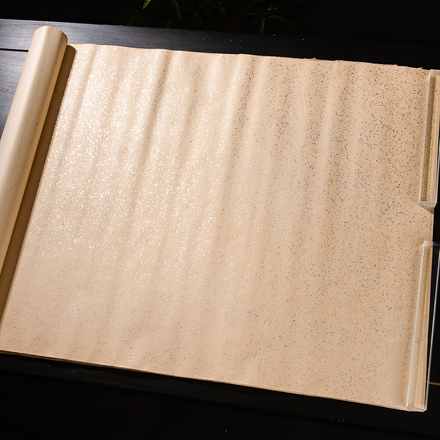 70年代上海工艺品进出口公司监制“四尺银金片金笺”,原装一卷25张。此纸古法精制,纸张质地精良,颜色古朴雅致,洒鱼籽银光芒耀眼,是难得之好纸。