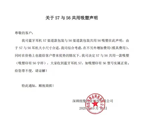 我司蓝牙耳机 S7渠道款包装与S6渠道款包装共用S6吸塑在此声明:由