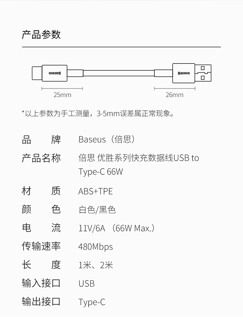 倍思 优胜系列快充数据线USB to Type-C 66W