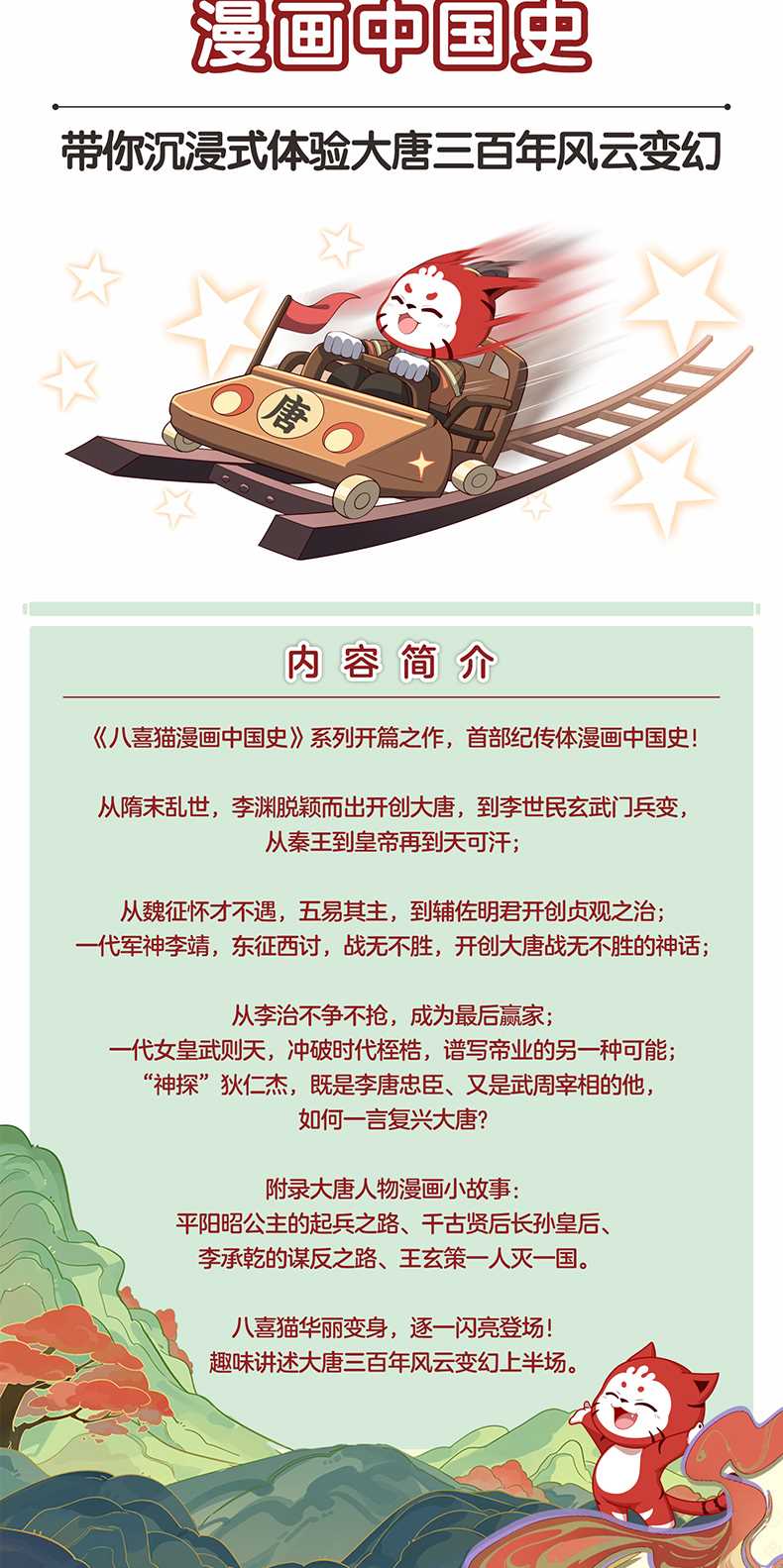 《八喜猫漫画中国史》系列开篇之作,首部纪传体互动式漫画中国史!从隋末乱世,李渊脱颖而出开创大唐,到李世民玄武门兵变,从秦王到皇帝再到天可汗;魏征怀才不遇,五易其主,到辅佐明君开创贞观之治; 一代军神李靖,东征西讨,开创大唐战无不胜的神话;李治不争不抢,成为最后赢家;一代女皇武则天,冲破时代桎梏,谱写帝业的另一种可能;;神探狄仁杰,既为李唐忠臣、又是武周宰相,他是如何一言复兴大唐?附录大唐人物漫画小故事:平阳昭公主的起兵之路、千古贤后长孙皇后、李承乾的谋反之路、王玄策一人灭一国。八喜猫华丽变身,逐一闪亮登场!趣味讲述大唐三百年风云变幻。