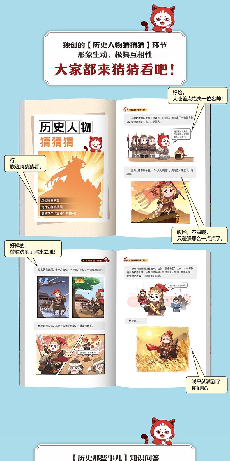 ★书内大唐;顶流传奇人物均设计了八喜猫所独创的【历史人物猜猜猜】环节,生动有趣,互动性强,能极大提升小读者的兴趣,形成有效知识记忆。