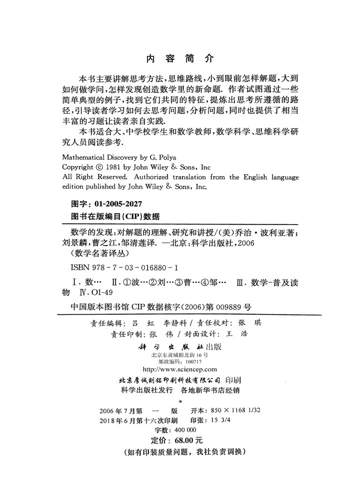 全书分为两部分,一部分是数学模型,一部分是通向一般方法。全书讲解思维方法、思维路线,小到眼前怎样解题,大到如何做学问,怎样去发现创造数学里的新命题,作者试图通过一些简单典型的例子,找到它们共同的特征,提炼出思索所遵循的路径,引导读者学习如何去思考问题,分析问题,同时也提供了相当丰富的习题让读者亲自实践。