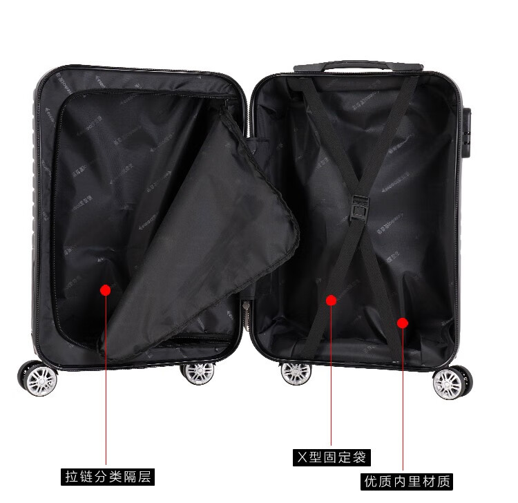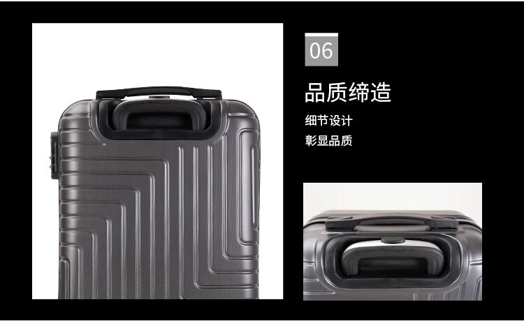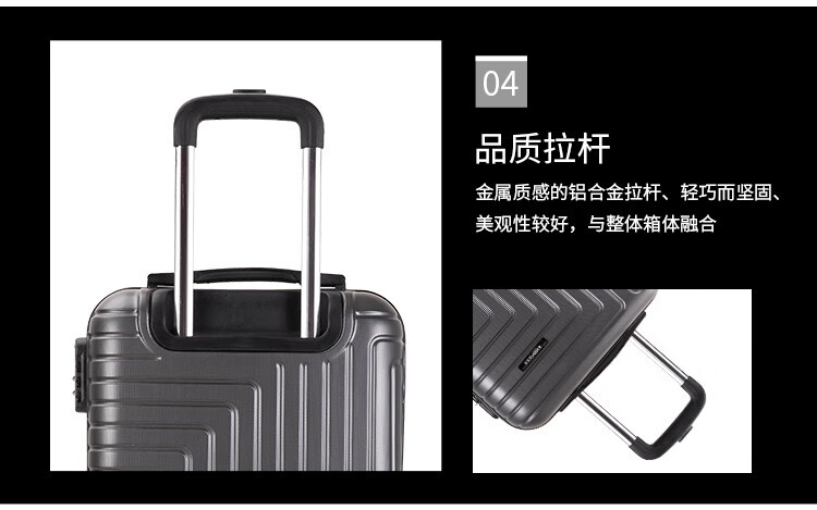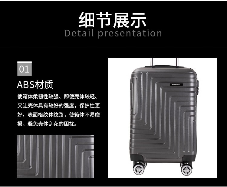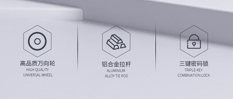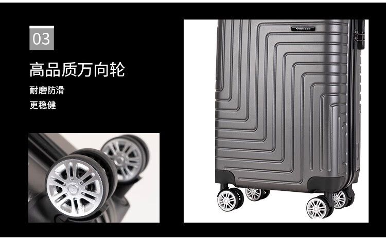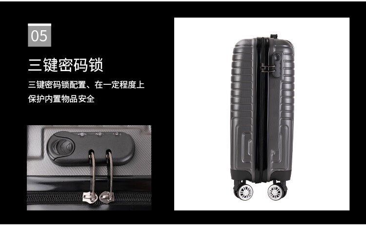 拖轮类型:八轮加固高端特制黑静音轮;三键密码锁