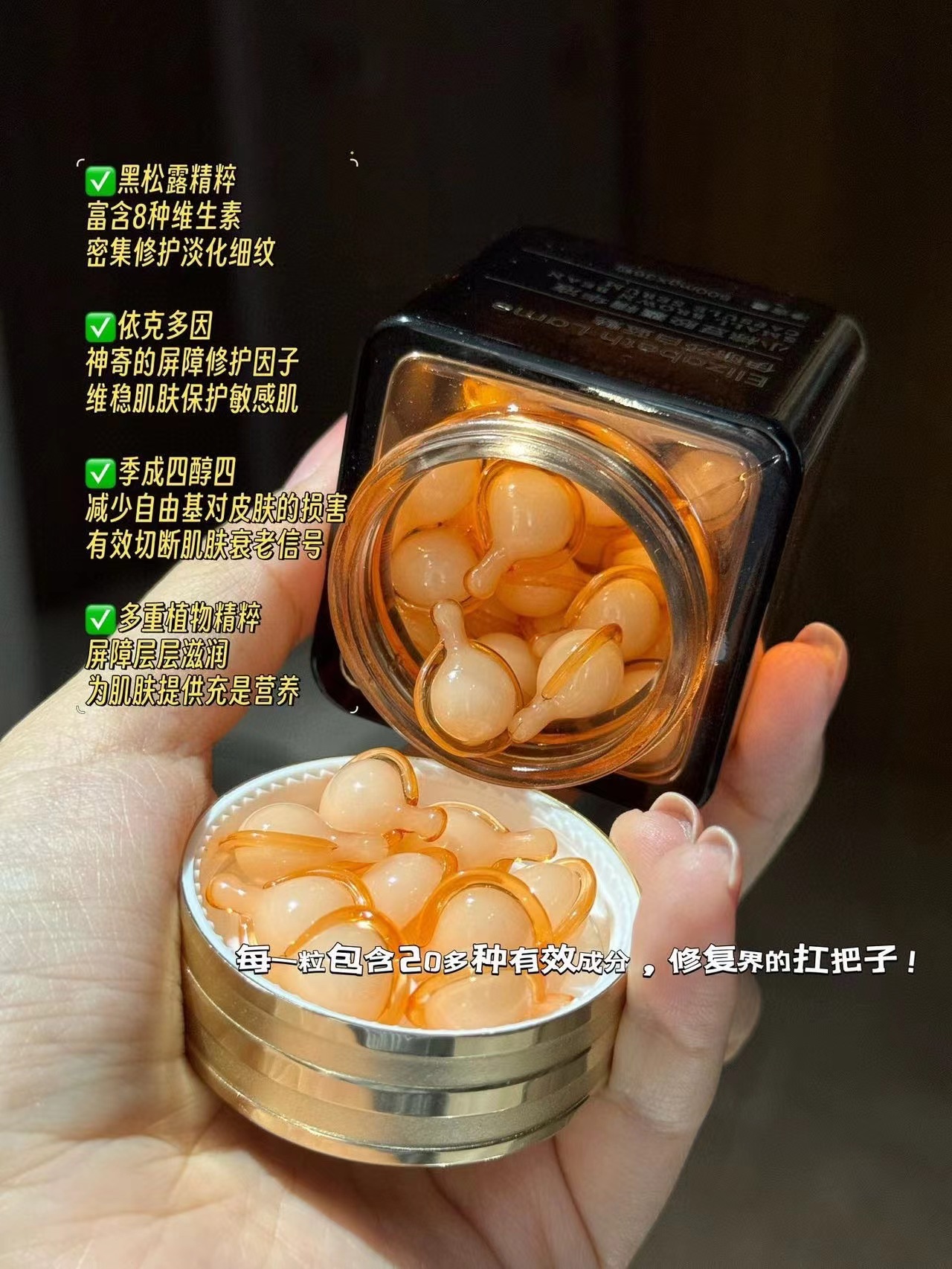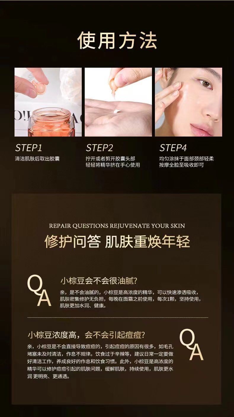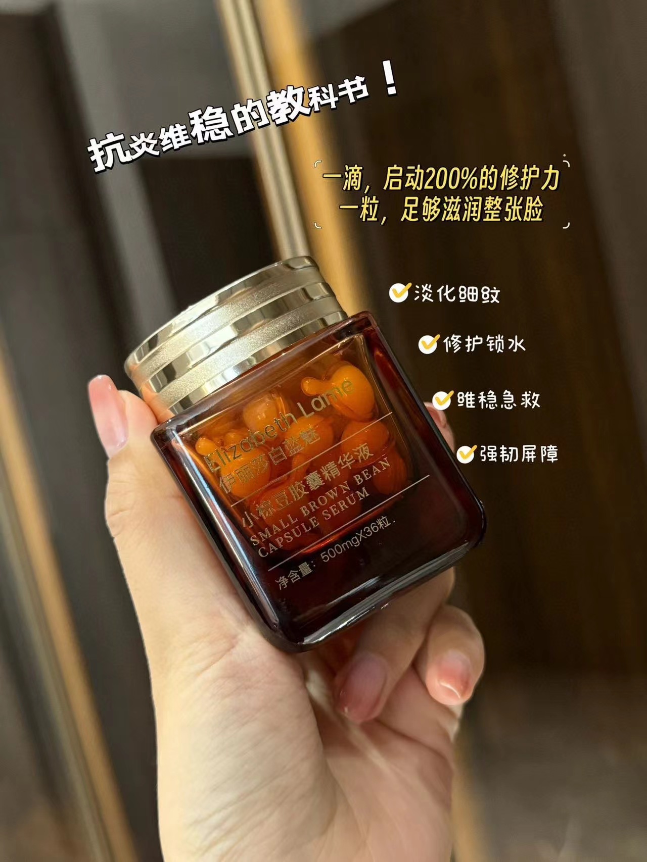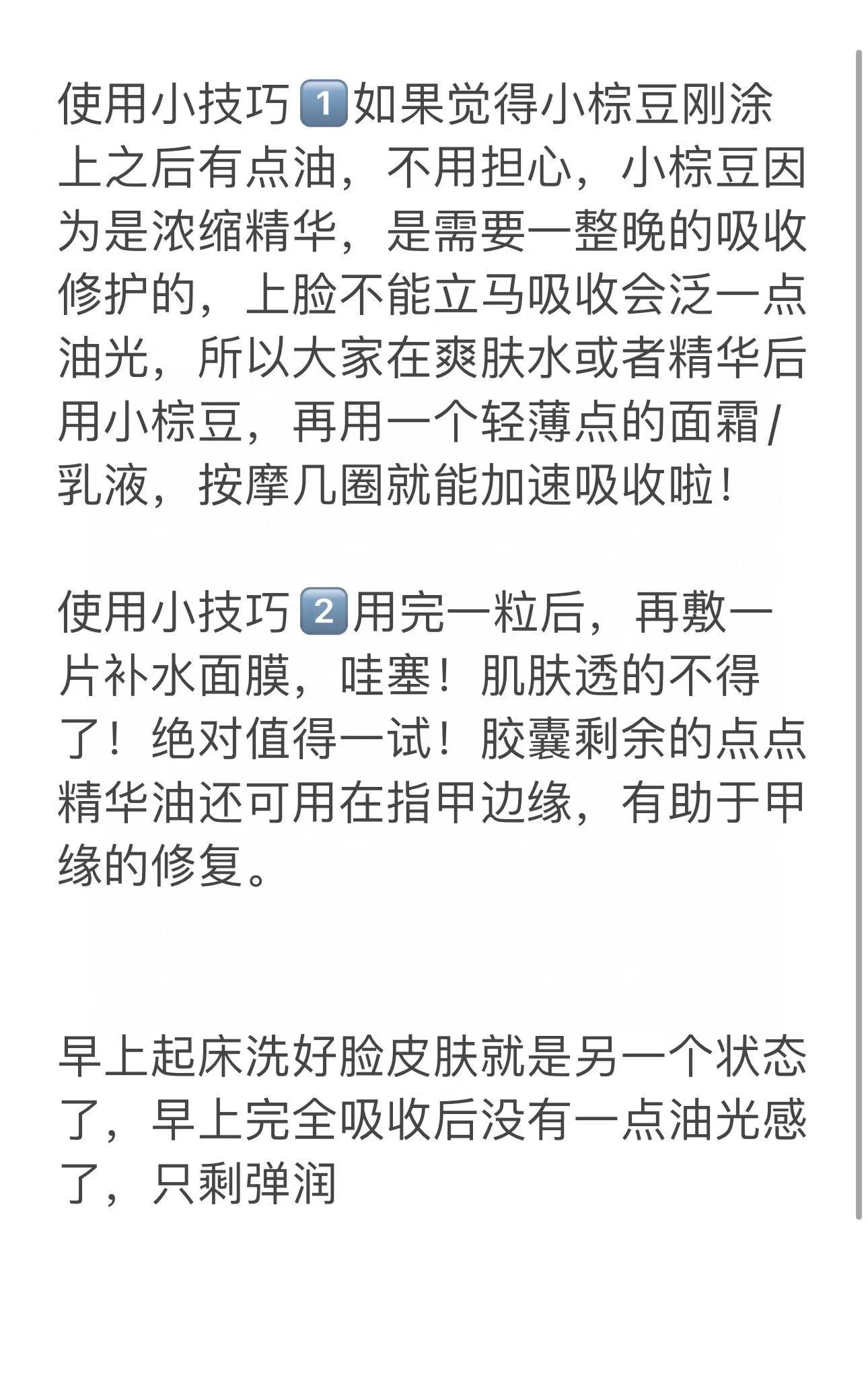 每一粒包含20多种有效活性成分!密集修护,拯救“松垮脸”!短期皮肤急救的神器!对干皮,痘痘肌肤超级友好!晚上洗完脸用效果佳。专柜498的小棕豆胶囊精华液,仅一箱现货非常少,价格天花板,成分是真贵妇霜同级,用几次效果是能看到的~~