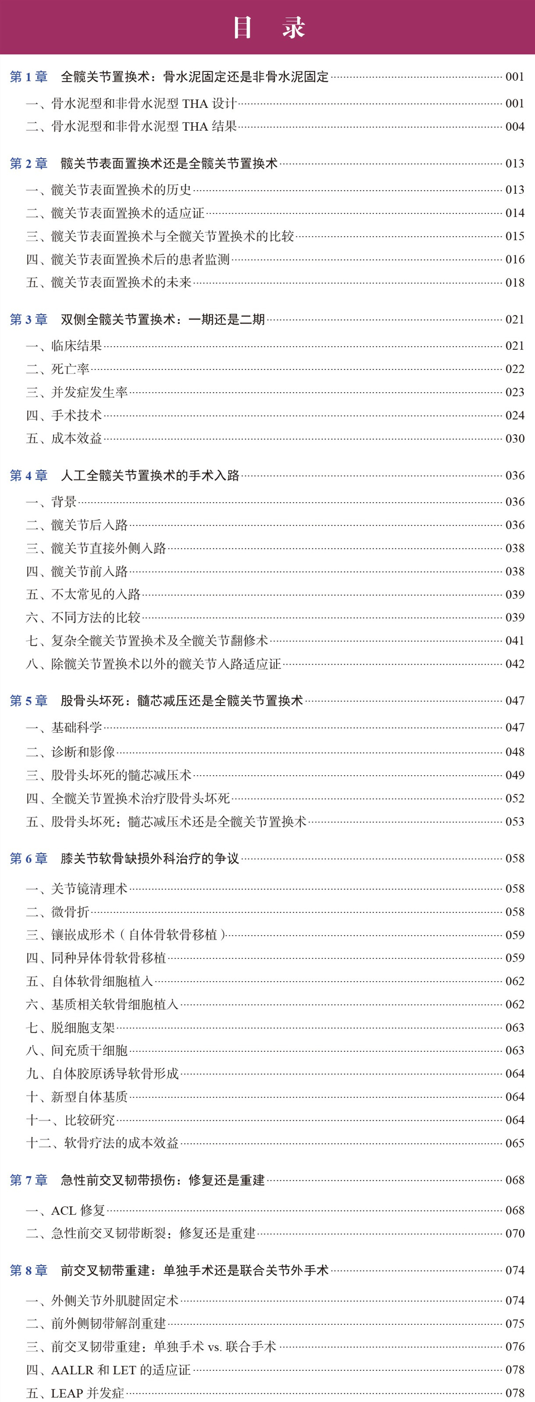 本书引进自Springer出版社,由西班牙马德里拉巴斯大学医院骨科的教授和英国伦敦帝国理工学院骨科的Alexander D.Liddle教授联合编写。著者结合最新的研究文献及自身丰富的临床经验,探讨分析了下肢关节矫形手术中存在的各种争议性问题,旨在为这些重要争议性问题找到最佳解决方案。书中所述涵盖了髋关节、膝关节、踝关节等医学上颇具临床价值和成本效益的下肢关节矫形手术,从手术入路、假体固定方式、双侧是否分期手术、表面置换、截骨、单髁、金属过敏患者,以及假体周围骨折和感染等并发症处理方面进行了全面阐述,以期为读者提供极具参考价值的指导建议。本书重点突出,阐释系统,图文并茂,可供广大从事下肢整形外科医生借鉴参考,亦可作为骨科及其他科室临床医生了解下肢矫形手术的参考资料。