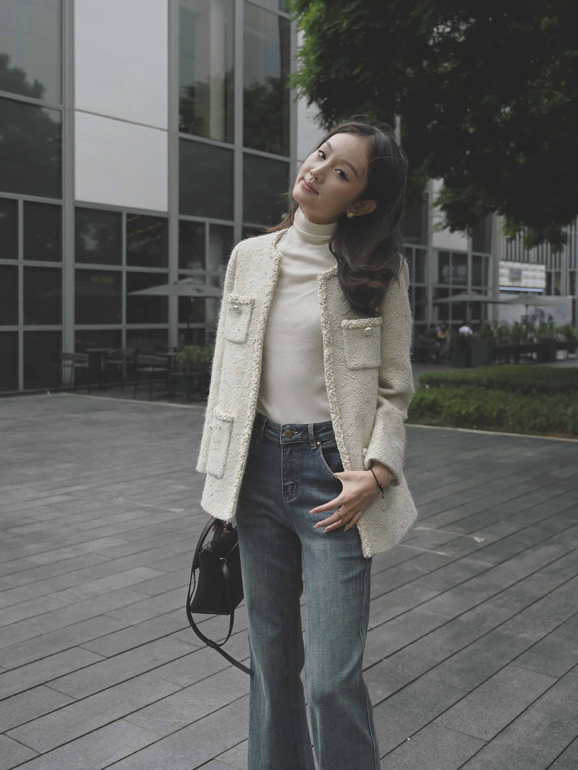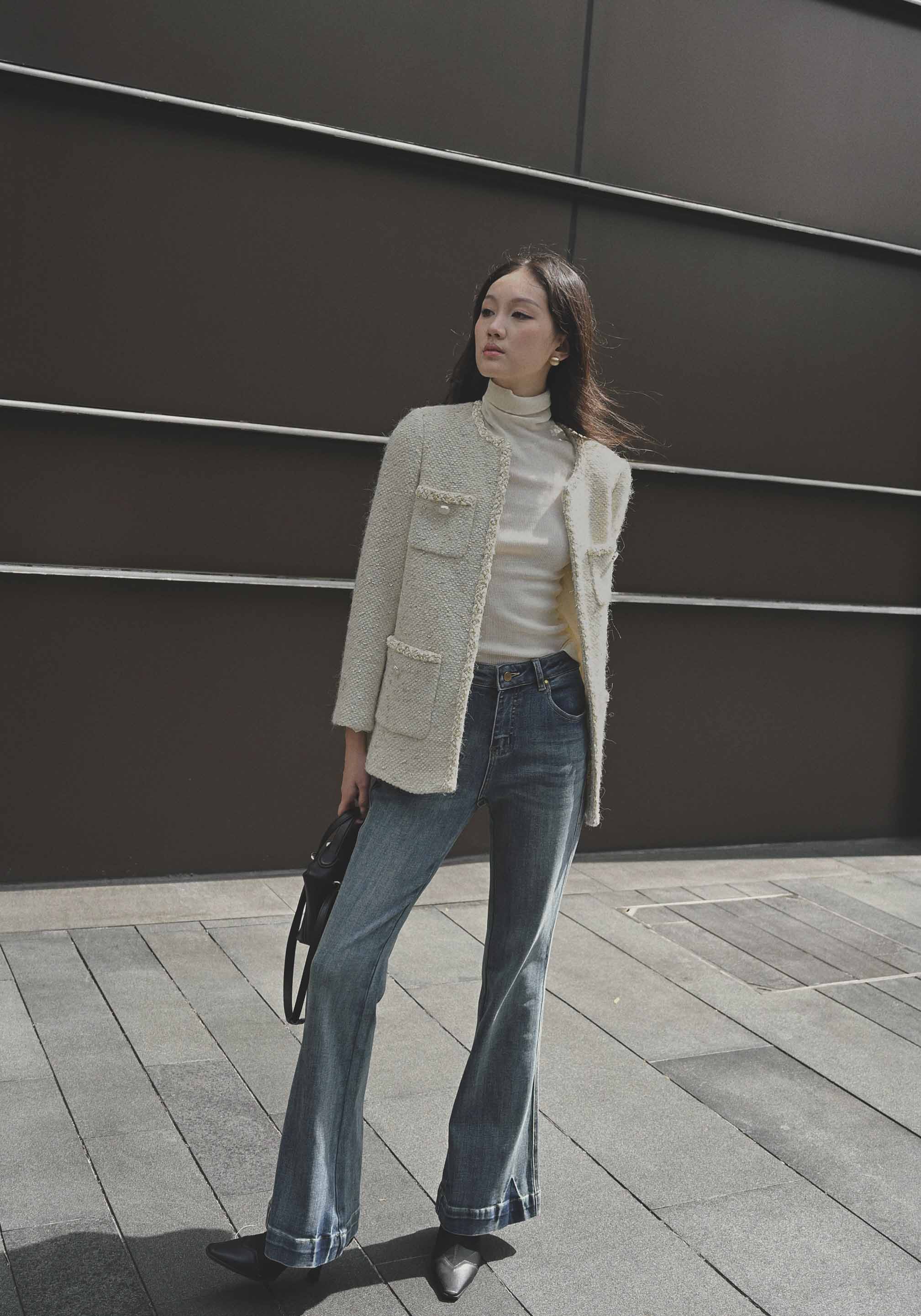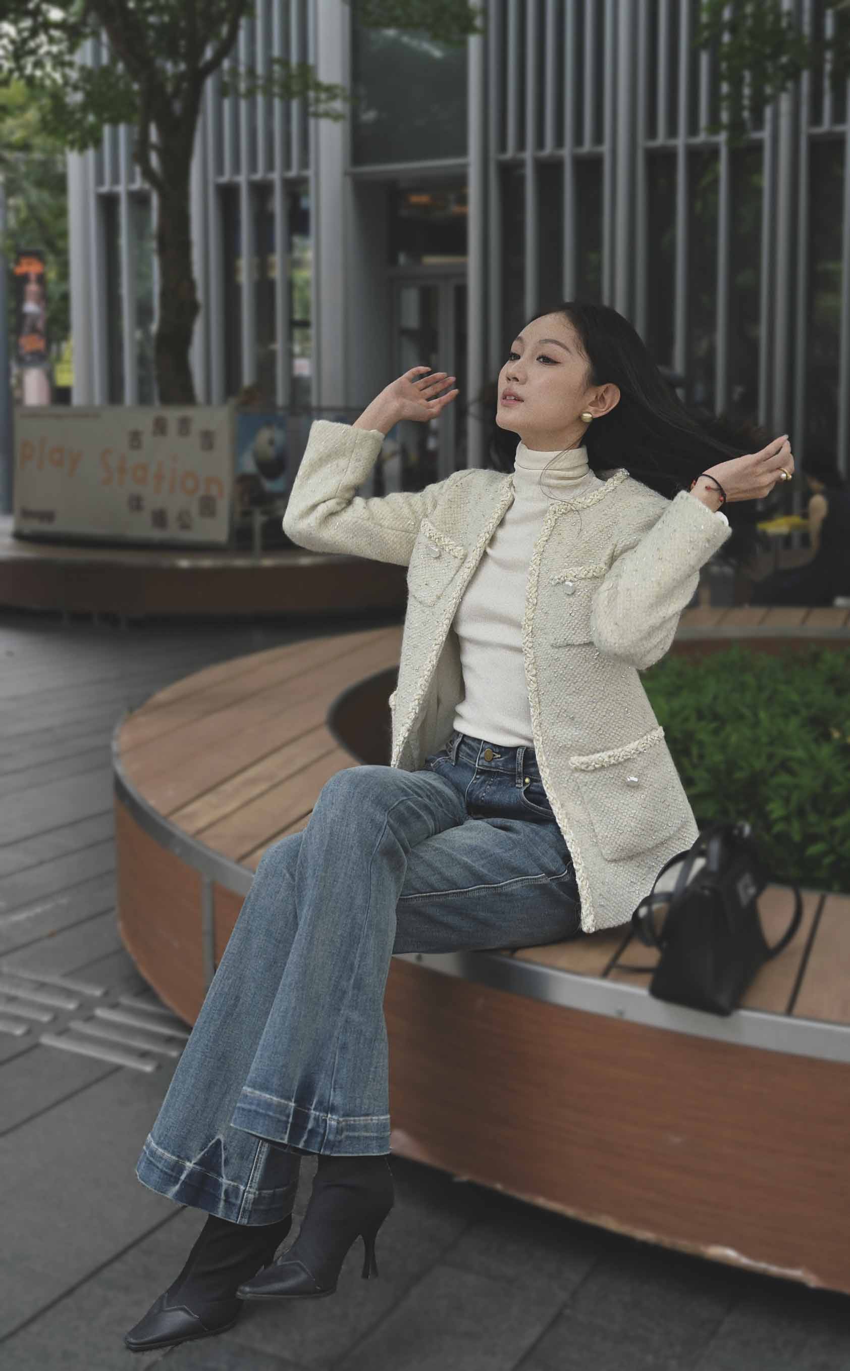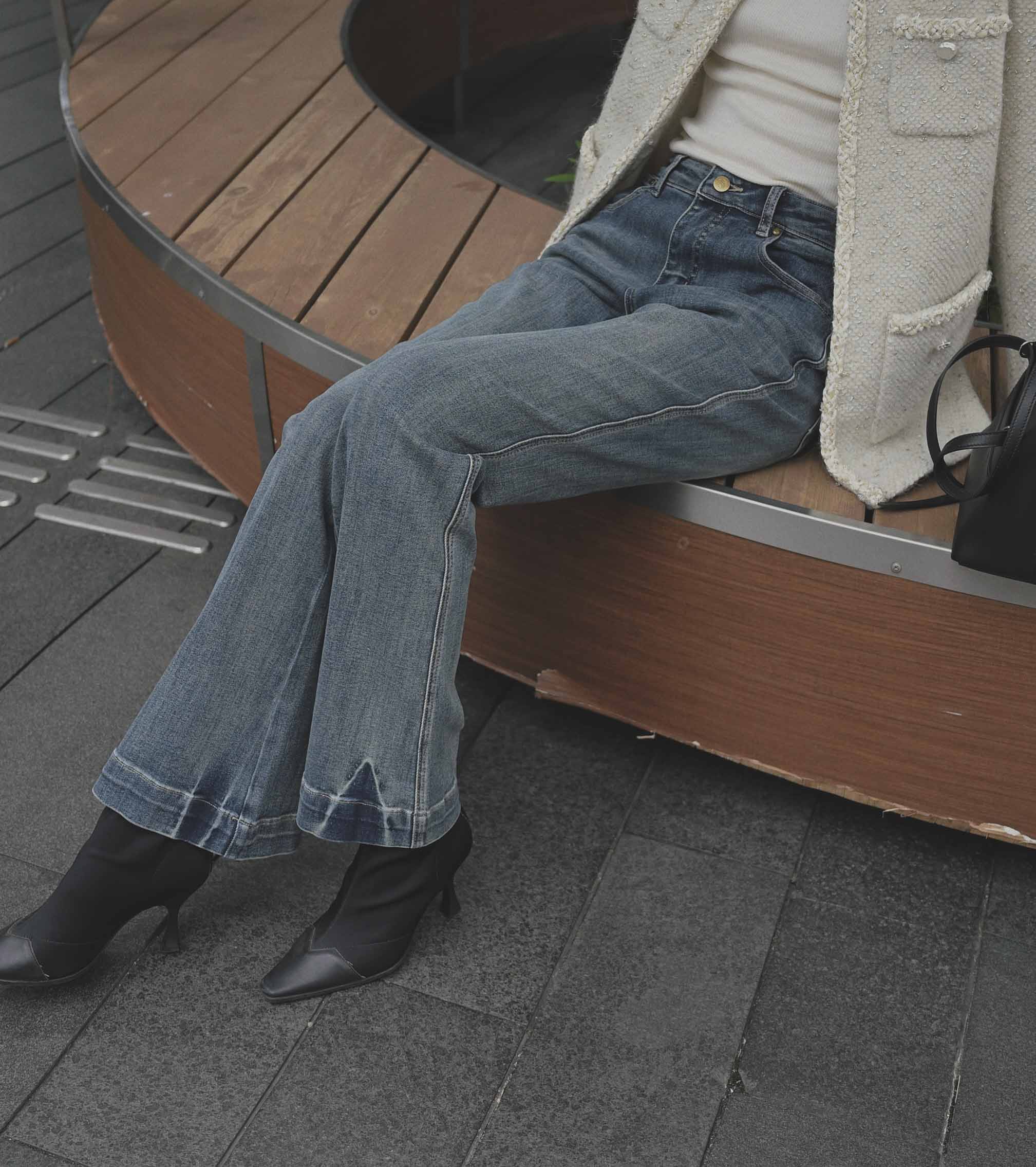 精致的喇叭裤型,喇叭自膝上开始展开,更显小腿纤长。