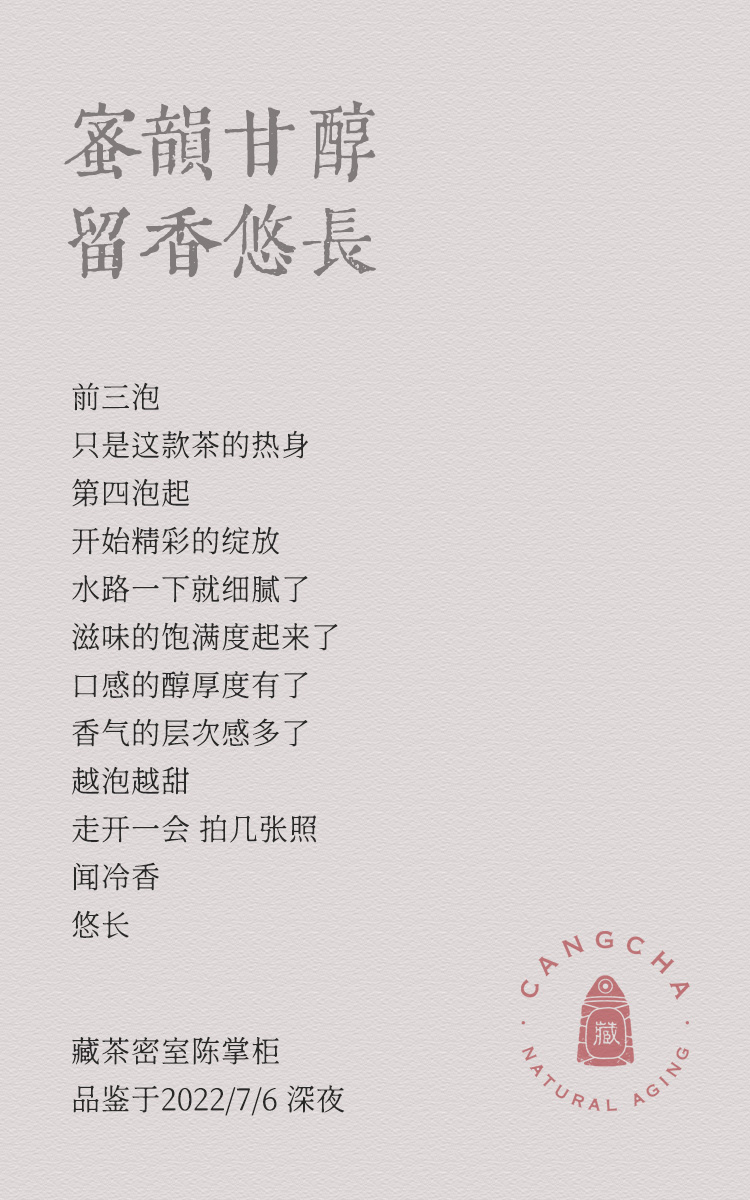 - 2021年,嘉木会创办了“藏茶密室”,开启了全新的藏茶模式,秉持“不将就,不迎合”的理念,通过“选、藏、养、醒”的方式,再度诠释藏茶的深意,沉醉杯汤,苦乐自知,茗透于心,迷之不悔!