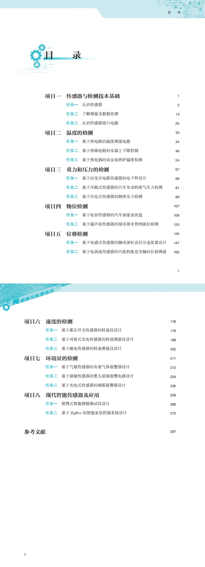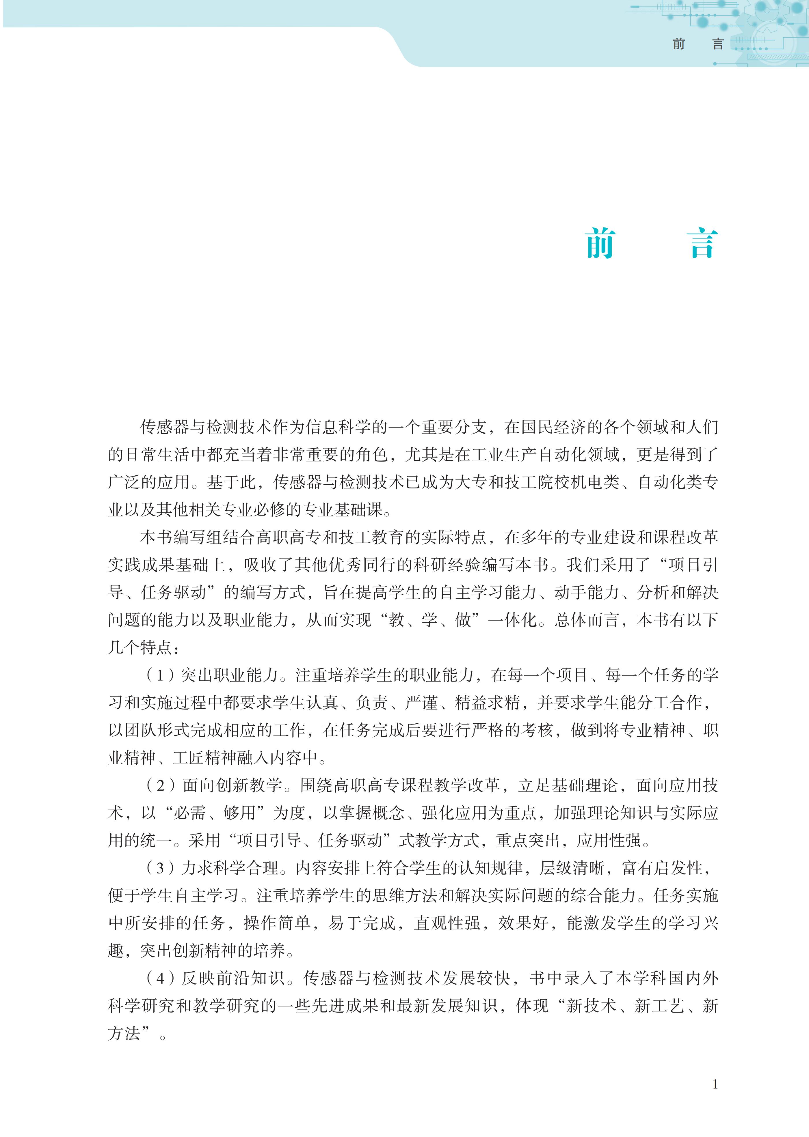本教材共分为8个项目21个任务。其中项目一介绍了传感器与检测技术的基础知识;项目二至项目七介绍了常用物理量的检测方法和各传感器的典型应用;项目八介绍了现代智能传感器及应用。每个项目均设有多个任务,每个任务后面都附有学习评价环节,以便学生总结和检验学习的效果。每一个项目后面都配有一定量的习题与思考题,学生可以复习、巩固所学内容。