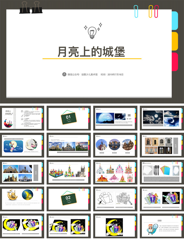 通过以月亮上的城堡为主题,将绘画好的城堡剪裁下来,然后在黄色的卡纸上画出月亮的形状,并将其剪裁下来,然后运用白色棉花制作成云朵,感受画面的层次变化。