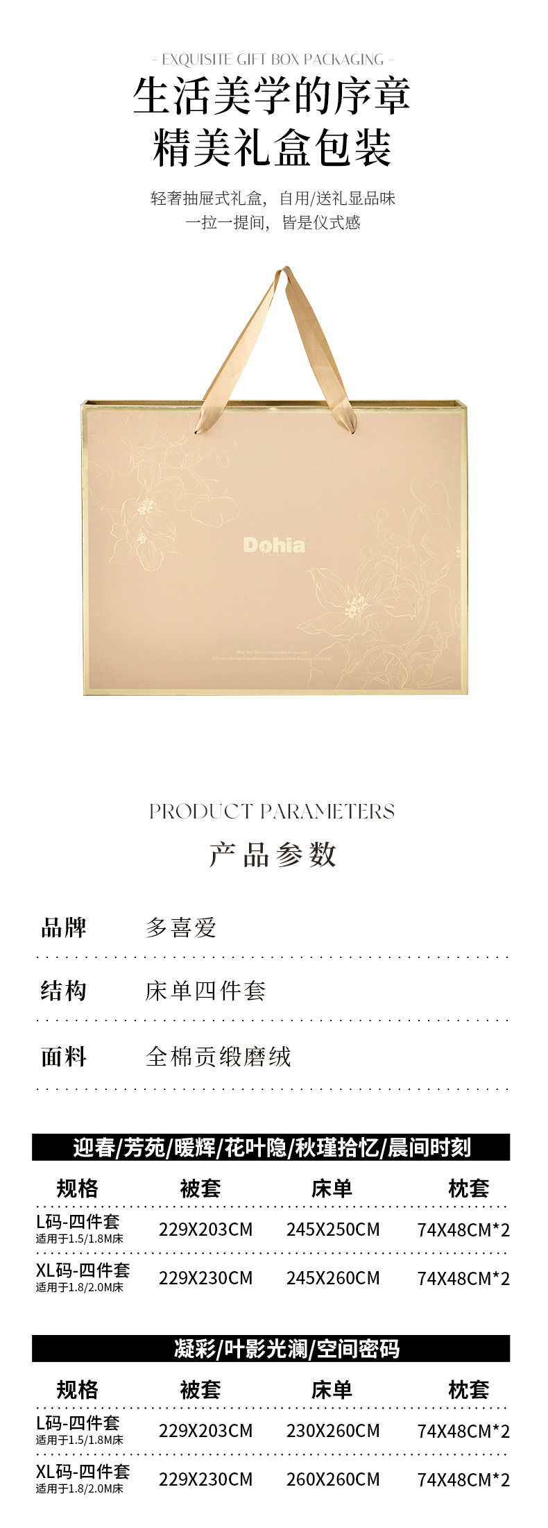 多喜爱 全棉贡缎磨绒四件套 迎春/晨间时刻/花叶隐/暖辉/芳苑【7A抗菌】【精美礼盒包装】高密全棉 优雅花卉 更细腻更厚实更软糯磨绒宽边枕套