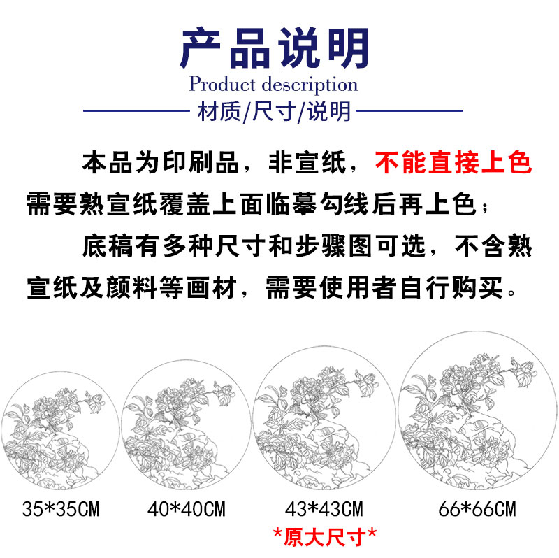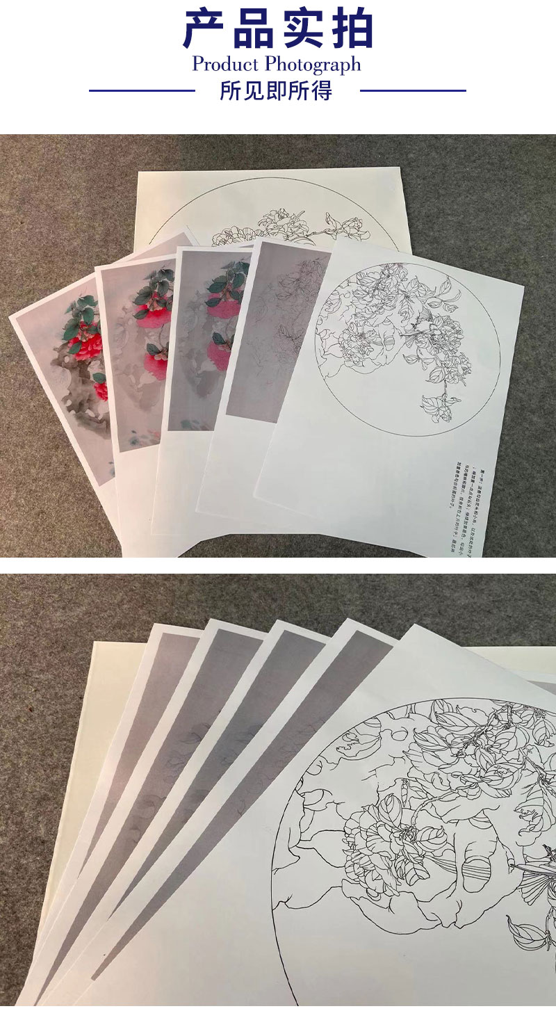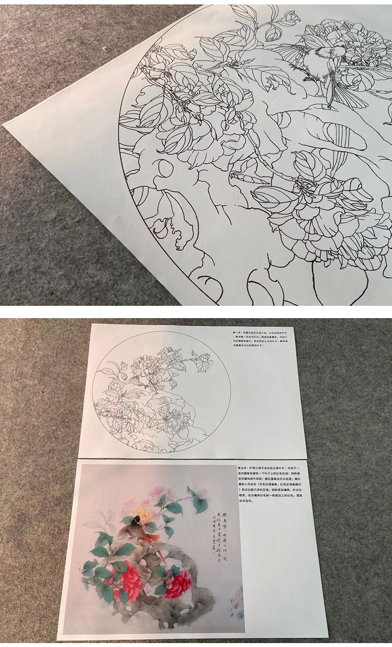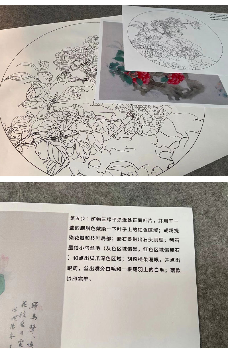 【有步骤】王震工笔画白描底稿圆形小品《踏春泥》山茶花初学者临摹花鸟线稿WZ27
